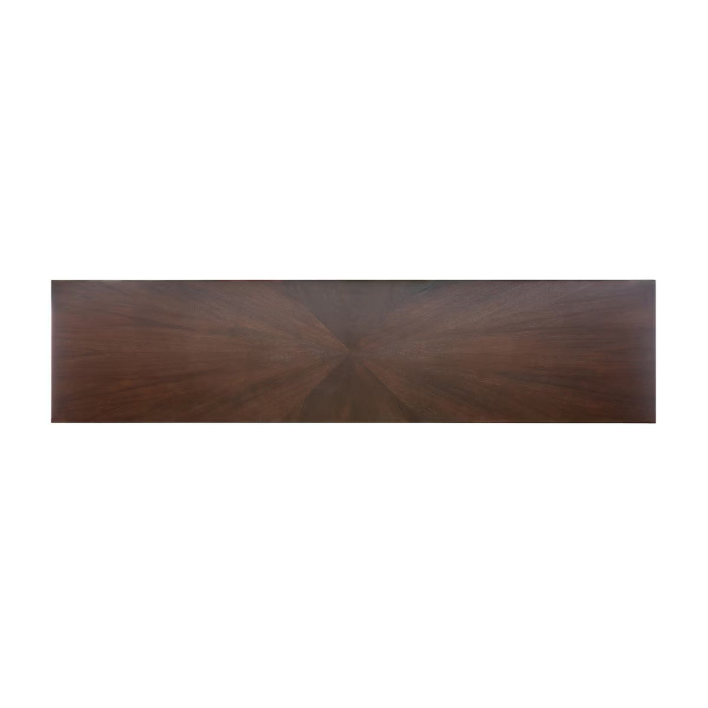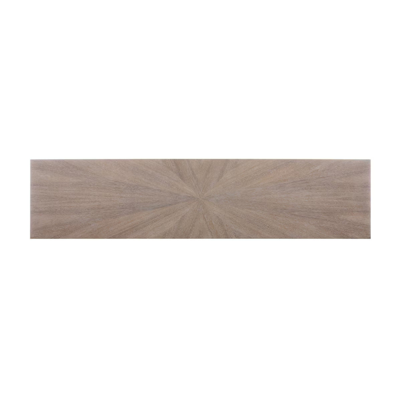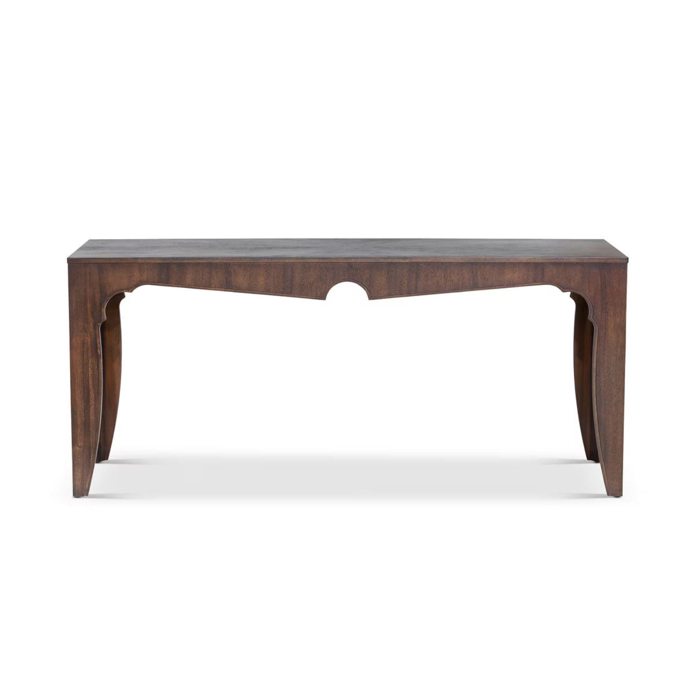 Exquisite Design: The console table features stately silhouettes adorned with acacia veneers and starburst veneer tops. Its table aprons boast cutaway profiles, reflecting the rich tapestry of European, African, and Indian influences that permeate Caribbean architecture.