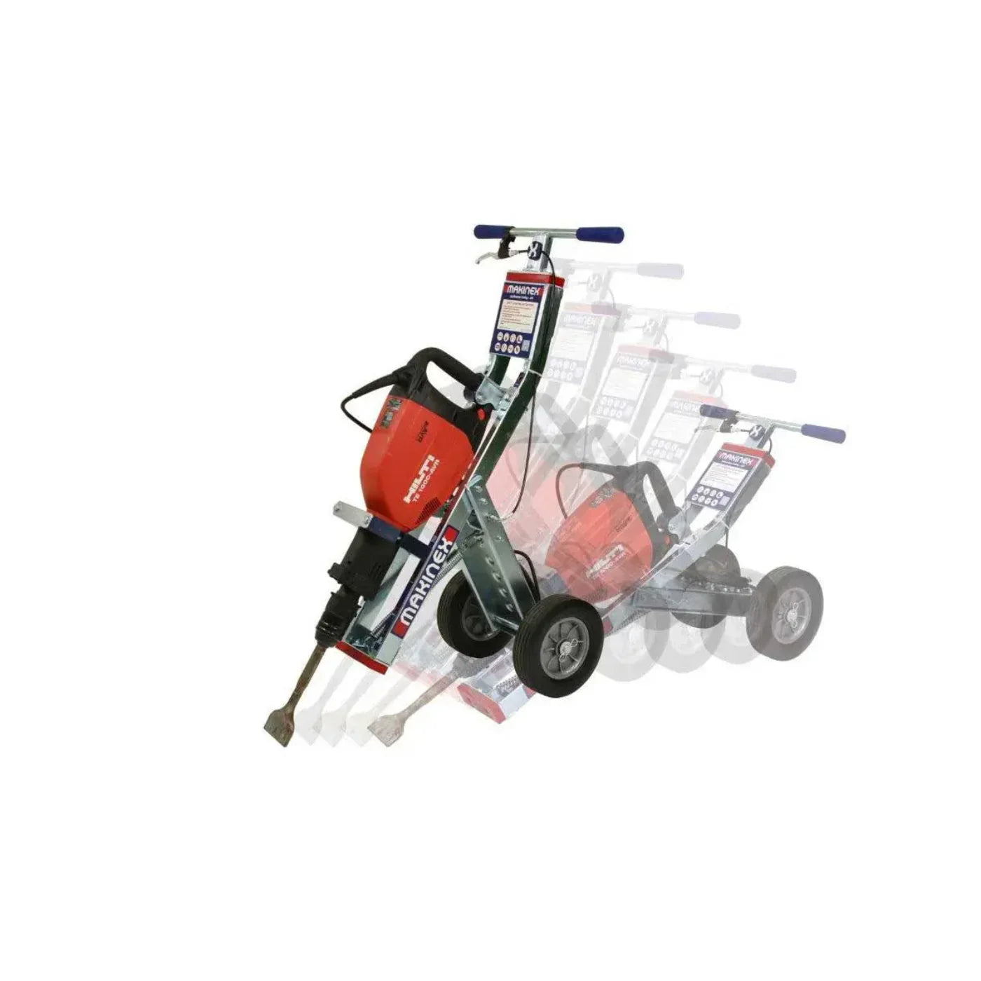 Makinex Jackhammer TrolleyThe fastest, safest way to remove tiles and thinset! The Jackhammer trolley lets you remove ceramic tiles, thin set, cork, and vinyl tiles up to six times faster than any other method. Nothing beats it for speed and efficiency. No more struggling or bending trying to handle heavy jackhammers! The Makinex Jackhammer Trolley carries most of the weight of the jackhammer while the user positions themselves behind the trolley and pushes it along. The ergonomic design minimizes vibration impact on the user and provides safer jackhammer operation by reducing back strain and operator fatigue.