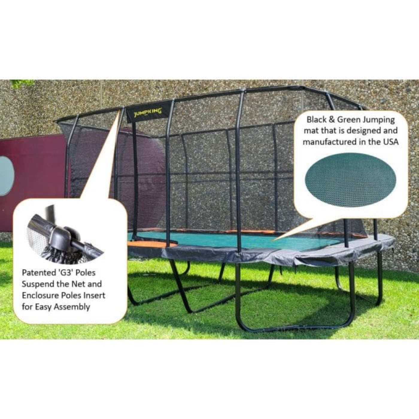 The 10 ft. x 16 ft. Rectangular Trampoline Pro from JumpKing is a complete trampoline and enclosure system. JumpKing’s Rectangular Trampoline Pro series comes with an integrated safety net enclosure, which looks better and is better. This high-end trampoline comes in three boxes, providing you with everything you need to get the whole family out of the house and enjoying backyard fun for many years. The JumpKing Rectangular trampoline is durable and attractively designed. The enclosure netting is fully supported by a horizontal shock-corded rod, which creates a secure and impressive jumping arena. The JumpKing Rectangular trampoline is an innovation in outdoor trampoline design. It uses a patent pending spring arrangement to provide the best bounce in the industry. Coupled with a jumping mat that is designed and manufactured in the USA. This product is ideal for customers who are looking for the best rectangular trampoline on the market.