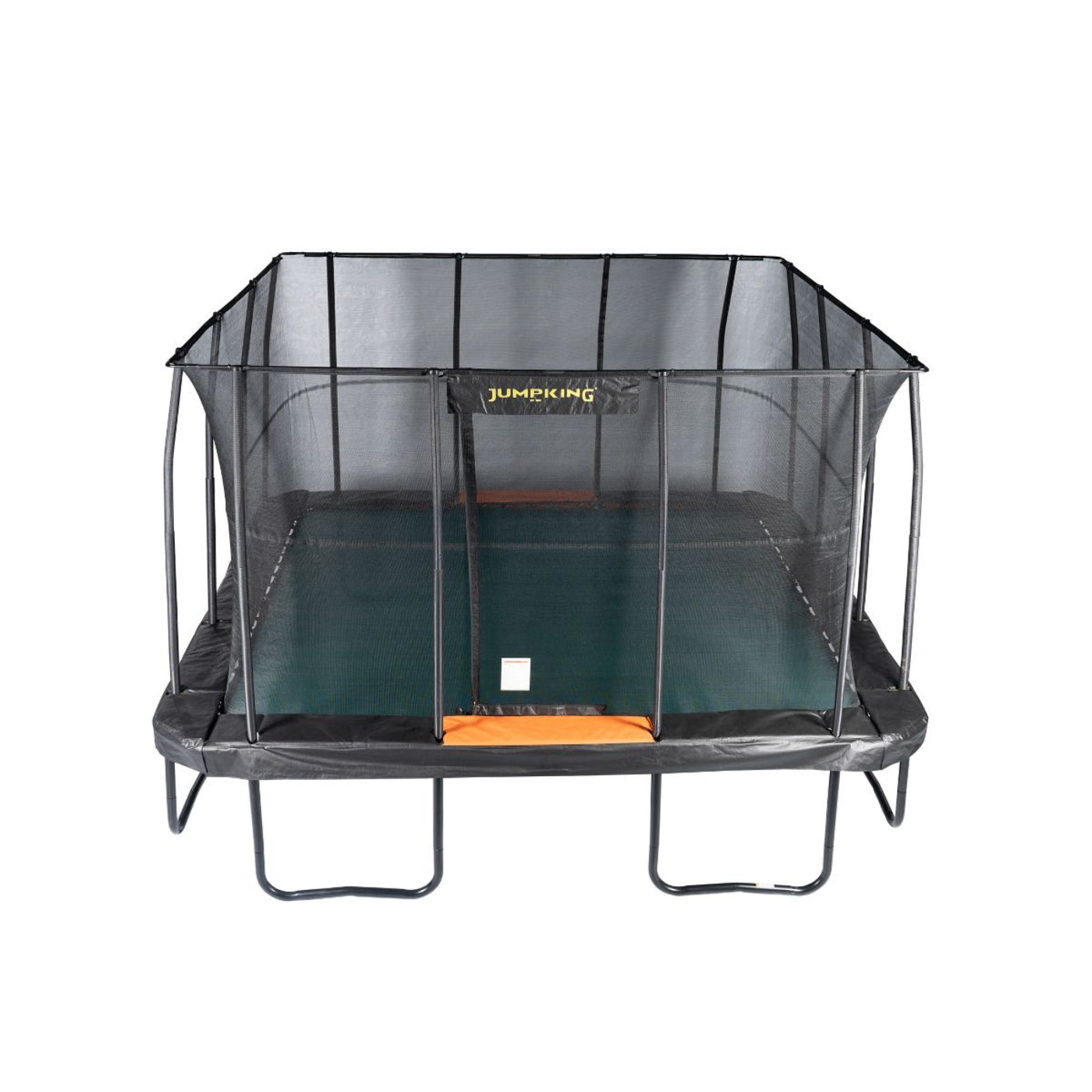 The 13 ft. x 13 ft. Square Trampoline Pro from JumpKing is a complete trampoline and enclosure system. JumpKing’s Trampoline Pro series comes with an integrated safety net enclosure, which looks better and is better. This high-end trampoline comes in three boxes, providing you with everything you need to get the whole family out of the house and enjoying backyard fun for many years. The JumpKing Rectangular trampoline is durable and attractively designed. The enclosure netting is fully supported by a horizontal shock-corded rod, which creates a secure and impressive jumping arena. The JumpKing Rectangular trampoline is an innovation in outdoor trampoline design. It uses a patent pending spring arrangement to provide the best bounce in the industry. Coupled with a jumping mat that is designed and manufactured in the USA. This product is ideal for customers who are looking for the best rectangular trampoline on the market.