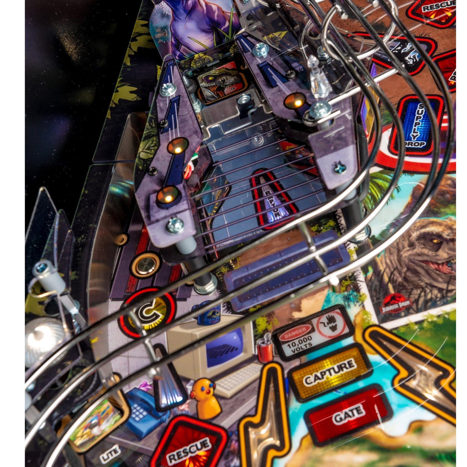 The Premium and Limited Edition models feature an amazing animatronic ball-eating, ball-throwing T. Rex that interacts with the ball and the player. These models also include an interactive Raptor and Raptor Pen featuring a ball-lock mechanism guarded by a motorized gate. The action does not let up with unique mosquito-in-amber pop bumpers and a custom metal horizontal helicopter spinner.