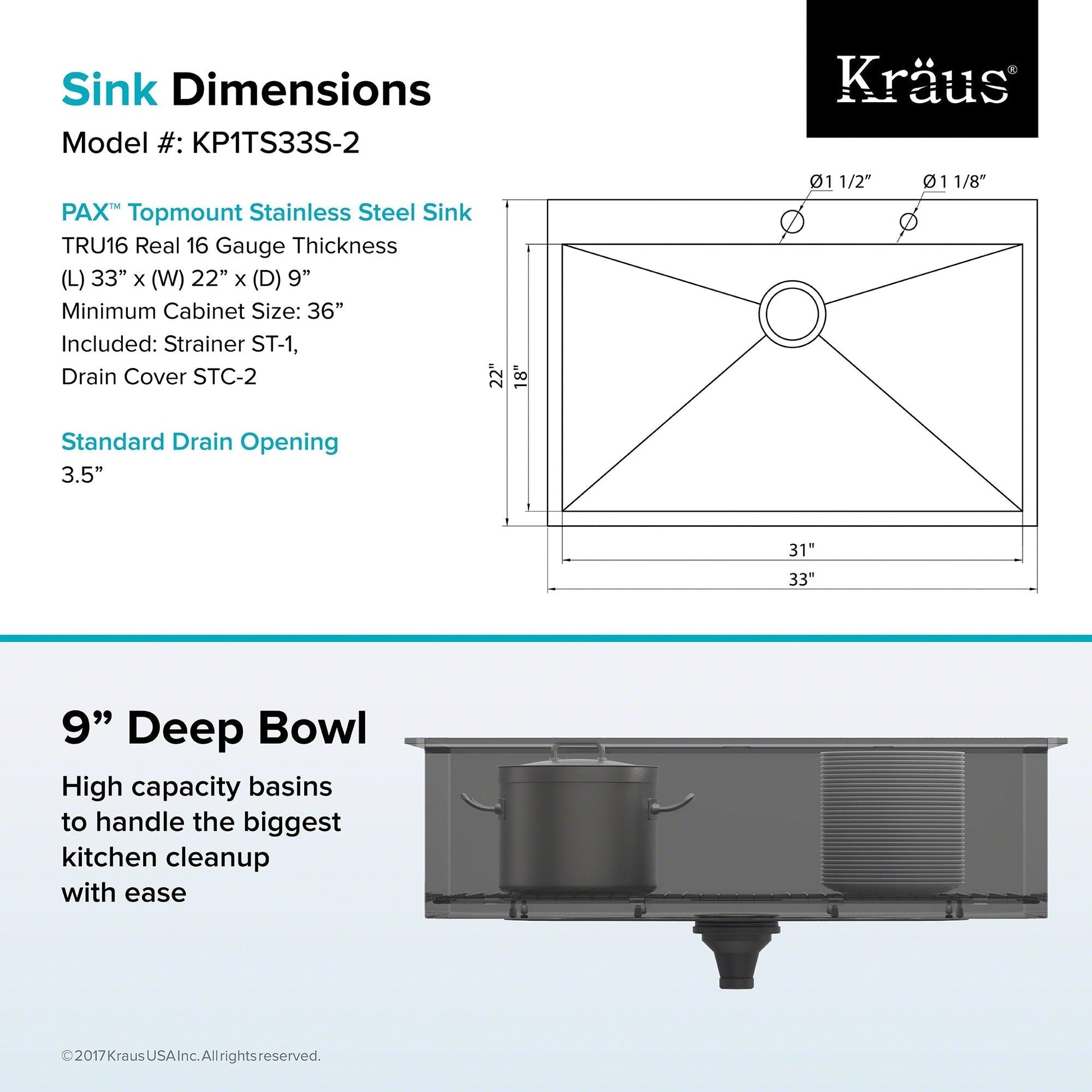 Complete Kit Includes: (KP1TS33S-2) Pax Series Sink, (ST-1) High-Quality 3-1/2"Drain Assembly with Strainer, (STC-2) CapPro Drain Cover, (KBG-P3118) Bottom Grid, (KSM-1Black) Silicone Mitt, (KST-1Black) Silicone Trivet