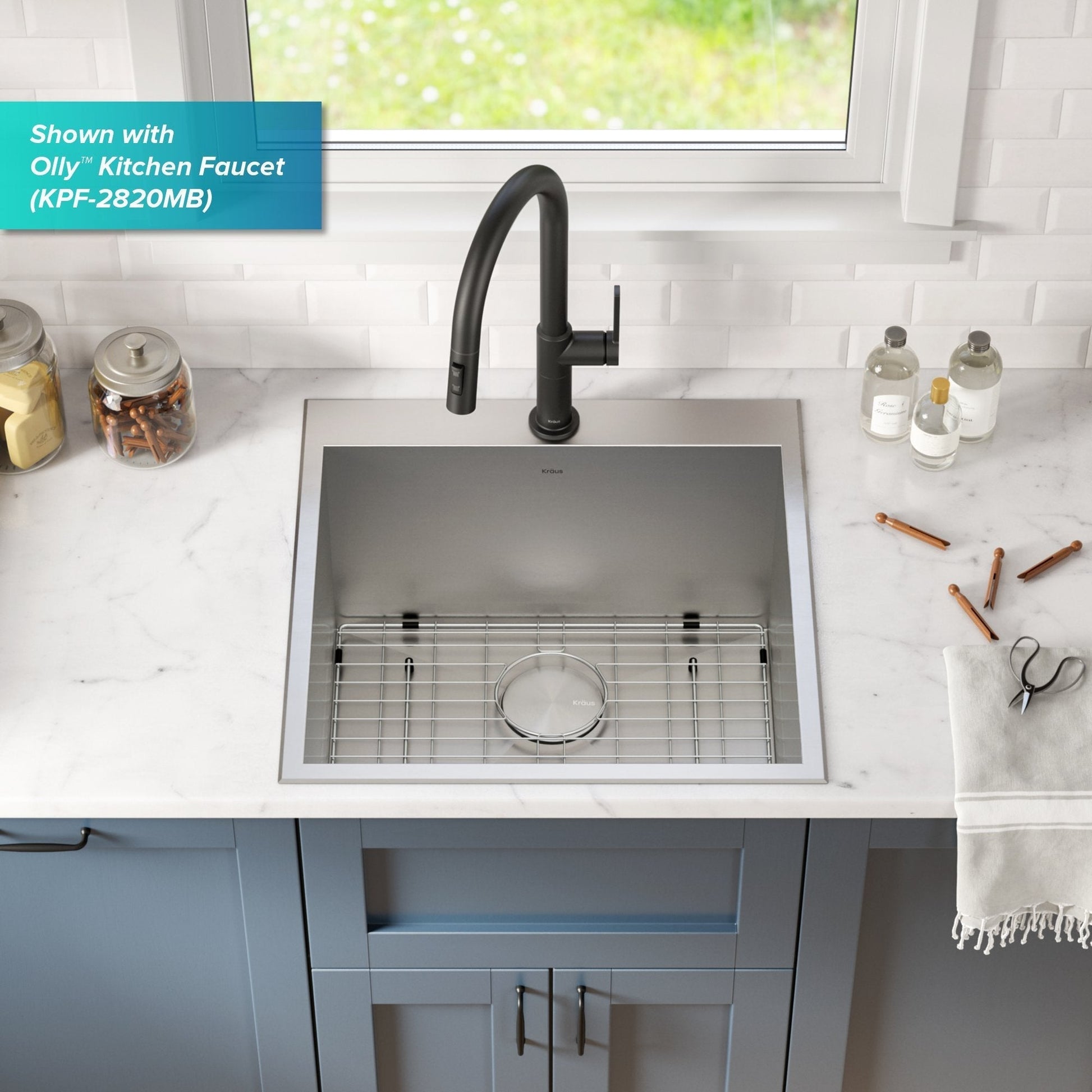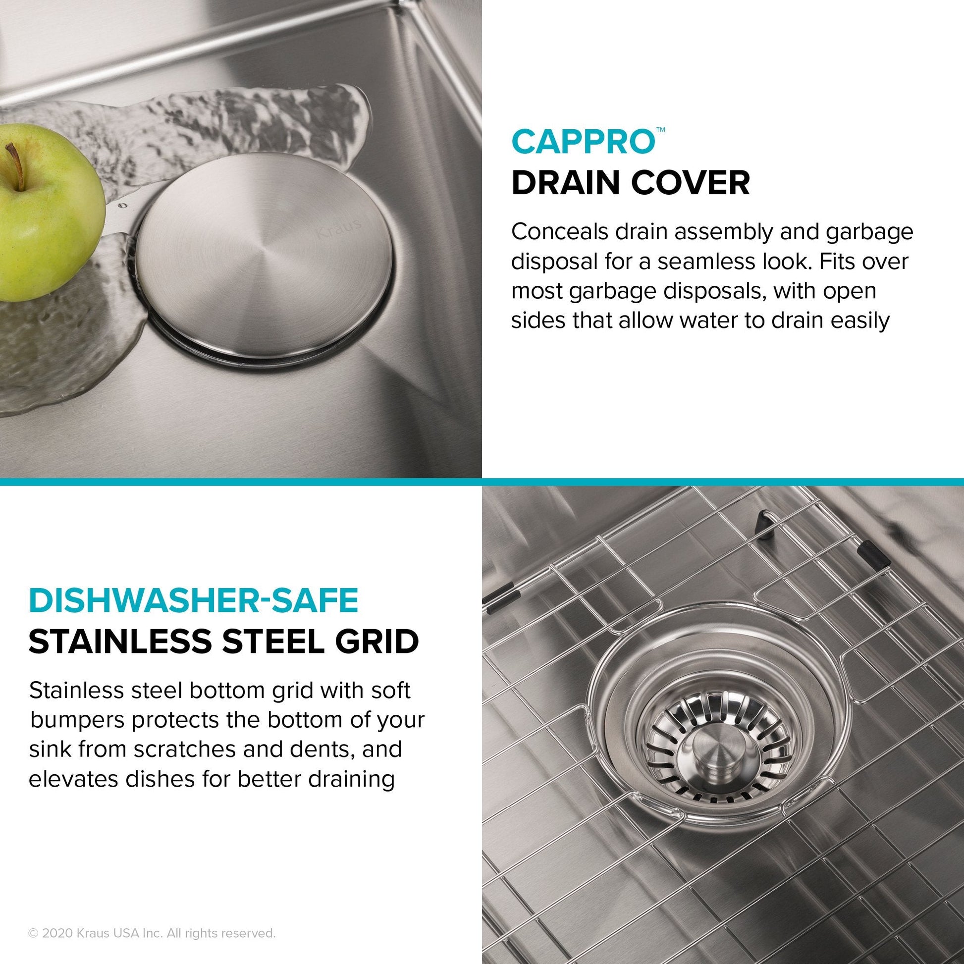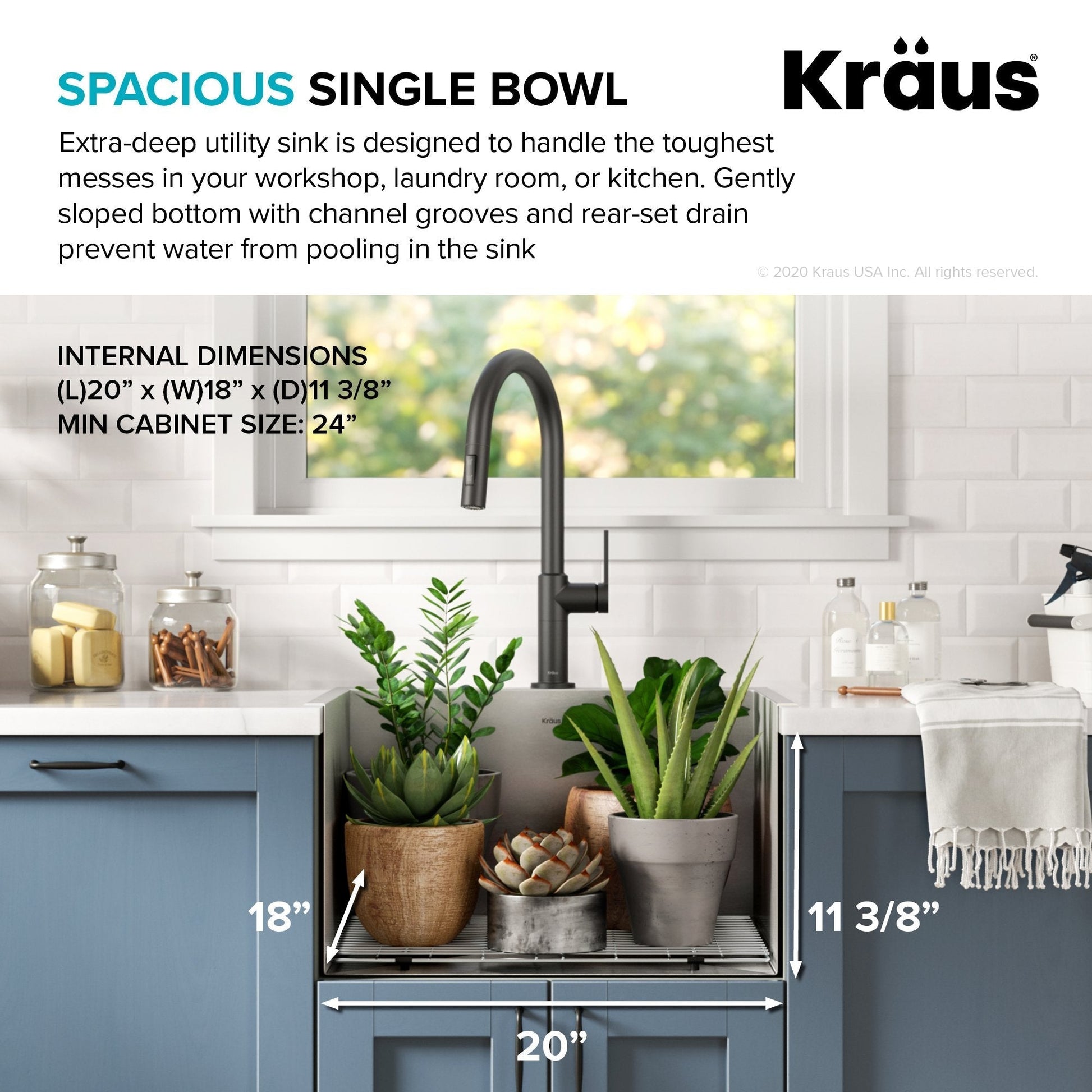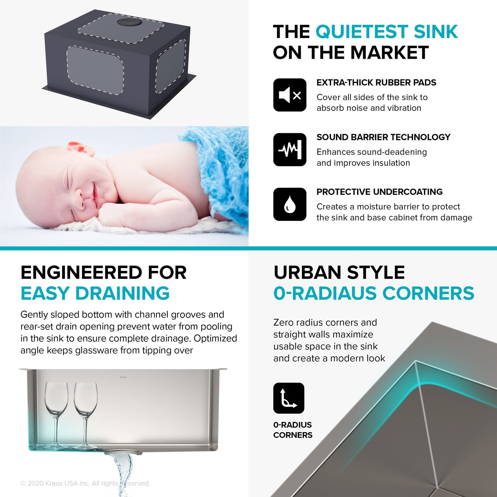 Featuring a sleek modern design with straight walls and easy-to-clean rounded corners, the heavy-duty extra-deep Standard PRO utility Sink creates a beautifully contemporary look in your kitchen, bar, laundry room, mudroom, or workshop. Constructed from proprietary KRAUS TRU16 - a heavy-duty, real 16-gauge stainless steel - this workhorse of a Sink offers superior durability with resistance to dents and damage. With an extra-deep 11 3/8" bowl depth, this versatile Sink will handle the toughest tasks, including washing oversized items and soaking large loads of laundry. Equipped with superior NoiseDefend sound dampening technology, with super-silencer pads to eliminate noise and vibration when the Sink is in use. Non-toxic undercoating insulates the Sink so that water holds its temperature and prevents condensation that can damage the base cabinet. Ideal for Sinks that see a lot of use, the wear-resistant finish is extremely long-lasting, and will not rust or dull over time. Designed to drain quickly and completely, the rear-set drain opening and sloped bottom with channel grooves prevent water from pooling in the Sink, ensuring that it drains better than the traditional flat-bottom laundry Sink. A versatile dual-mount design allows you to install this Sink as a drop-in with any type of kitchen counter, with an extra-thick 4mm deck that sits flat against the countertop for a perfectly finished look. This Sink comes with a protective stainless steel bottom grid and premium drain assembly with removable decorative drain cover that creates a clean and seamless look. Enjoy the advantage of high-end quality and contemporary style beyond the kitchen with the Standart PRO utility Sink.