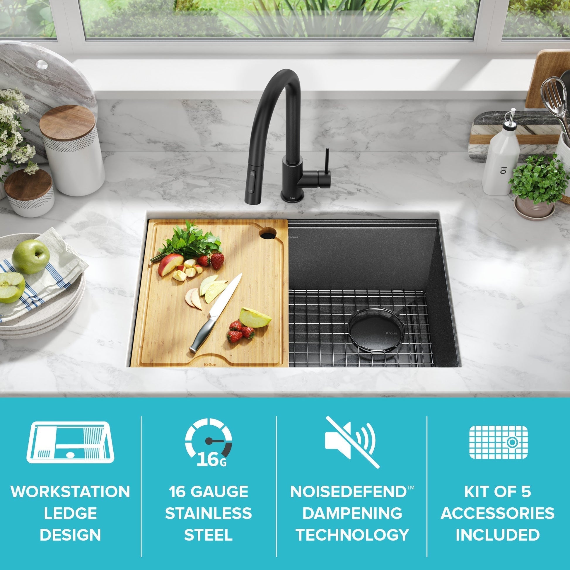 Cook, serve, and entertain in style with a Kore Workstation Sink in bold PVD Gunmetal finish. Offering a unique color option for stainless steel sinks, the PVD Gunmetal finish has a modern yet timeless appearance that blends well with today's popular black stainless steel appliances and makes this sink a showpiece in any kitchen. This sink pairs beautifully with black faucets as well as contrasting finishes for a look that really catches the eye. Engineered with an integrated ledge to support custom sliding accessories, this sink is designed to streamline all your kitchen tasks from meal prep to cleanup. The included cutting board and roll-up dish rack allow you to work right over the sink without taking up counter space.