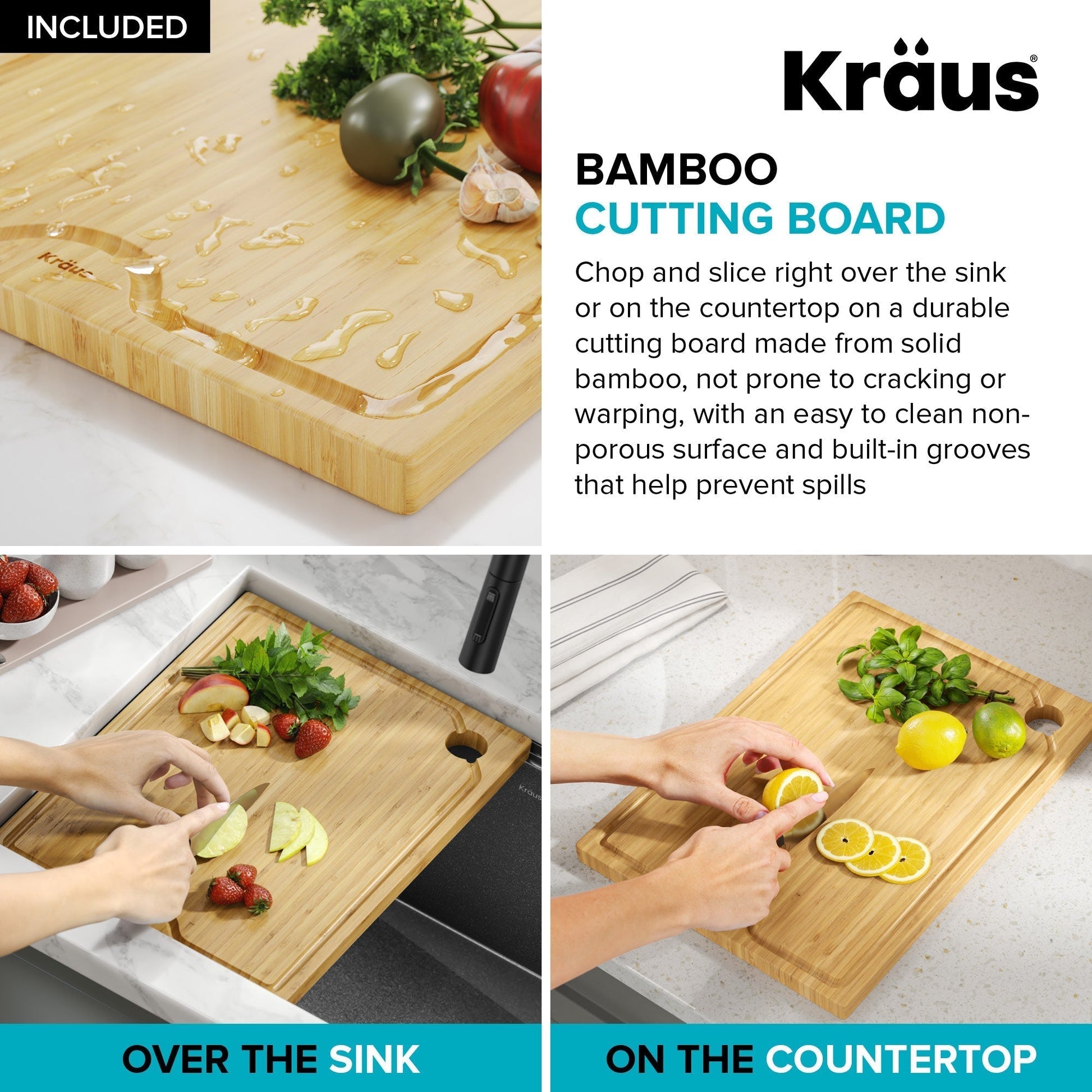 SINK KIT INCLUDES: Stainless steel workstation sink, heavy-duty acacia cutting board, roll-up dish drying rack, matching protective bottom grid, drain assembly, and decorative drain cover