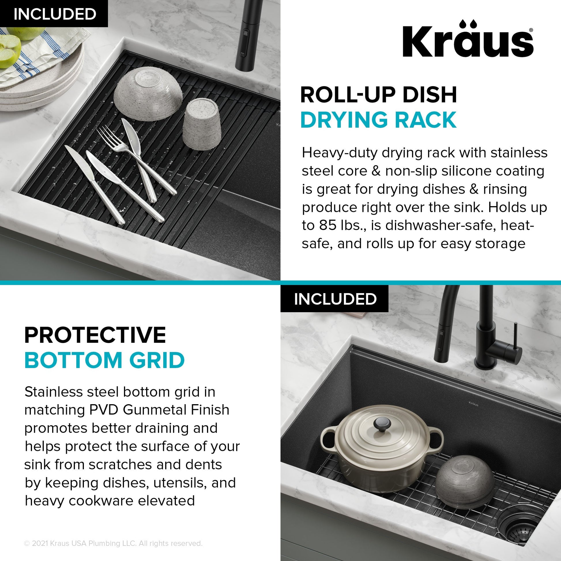 PROTECTIVE BOTTOM GRID: Matching PVD Gunmetal stainless steel bottom grid with soft rubber bumpers safeguards the surface of your sink by keeping dishes and heavy cookware elevated