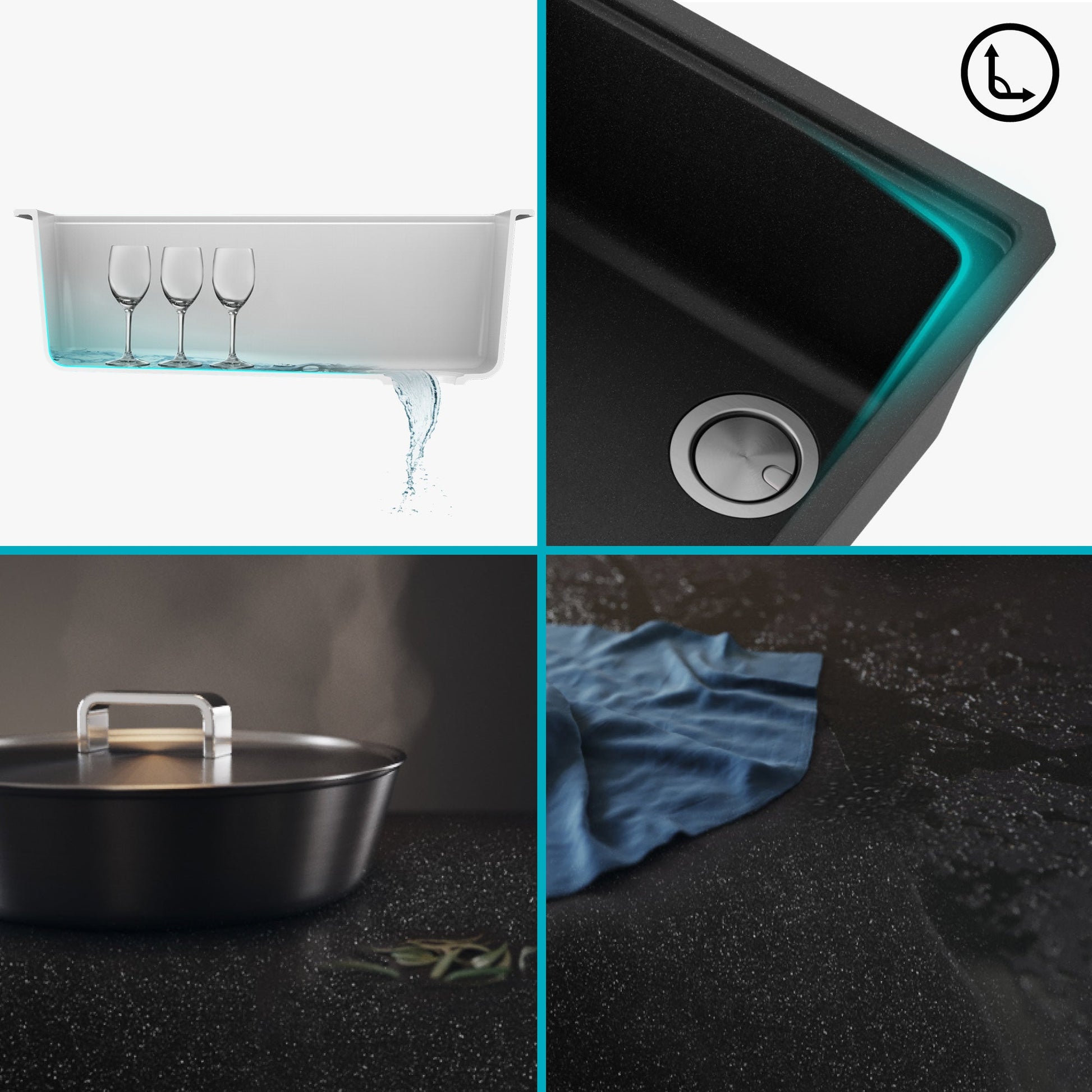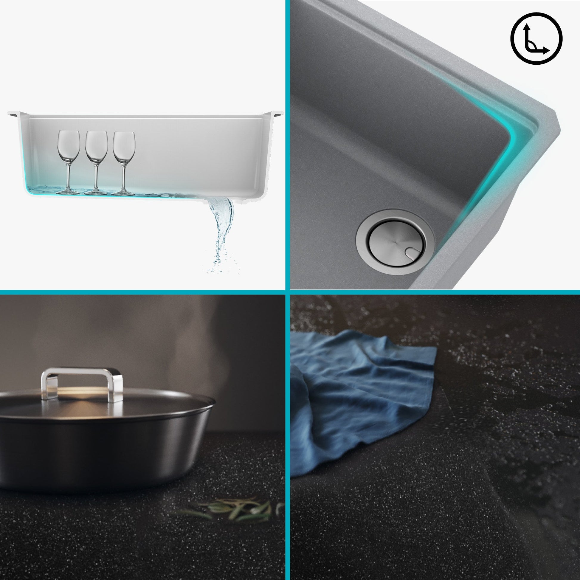 A: High-quality granite composite for durability, heat, and stain resistance.