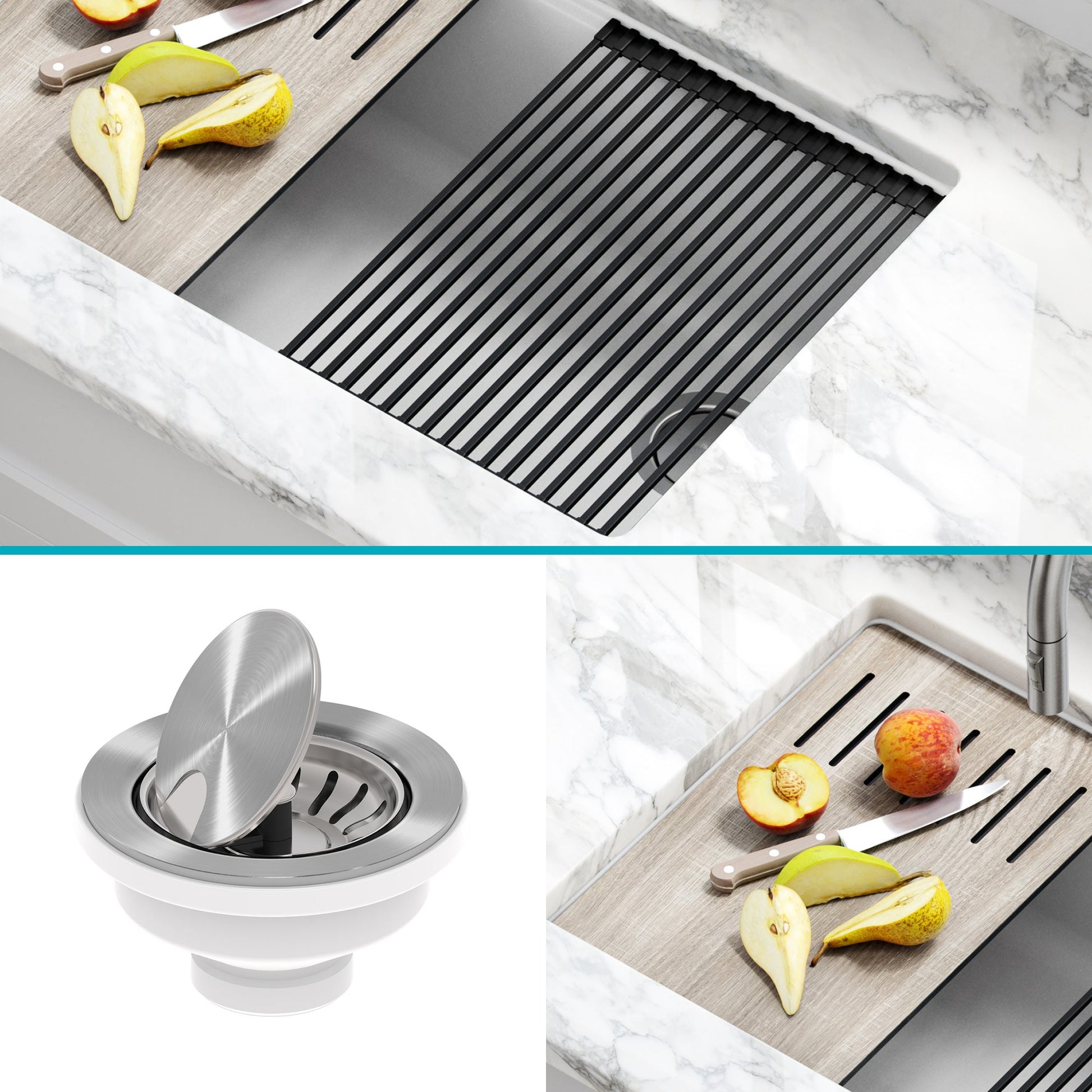 WORKSTATION SINK: An integrated ledge allows you to work directly over the sink, with custom-fit accessories that save space on the kitchen counter and streamline everything from meal-prep to cleanup