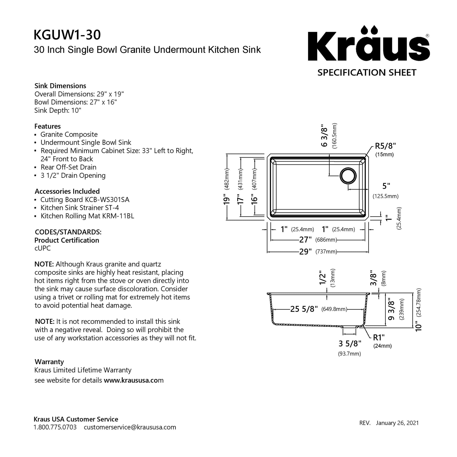OUTER SINK DIMENSIONS: 29" L x 19" W x 10" D - BOWL DIMENSIONS: 27" L x 16" W x 9 3/8" D - Minimum Cabinet Size: 33"