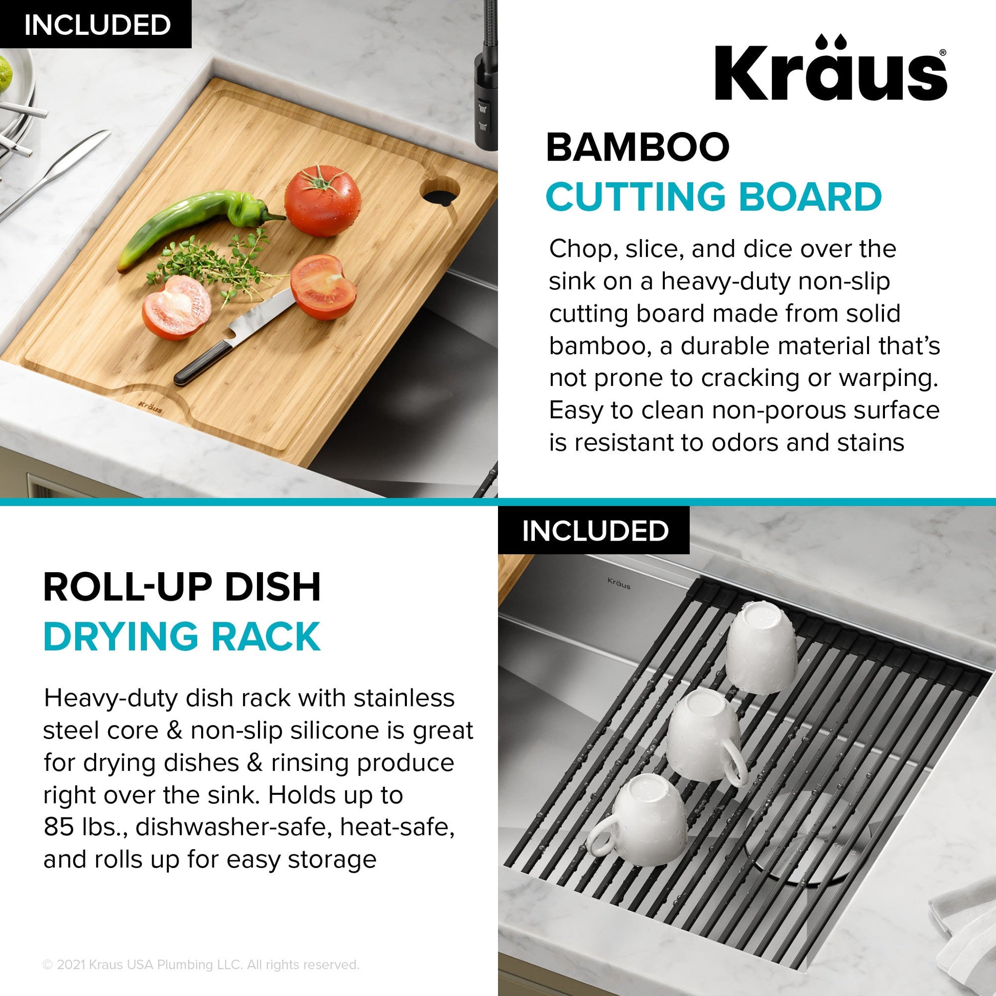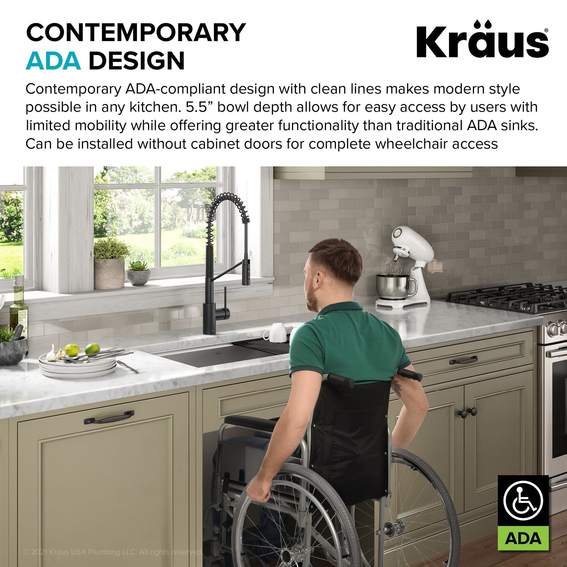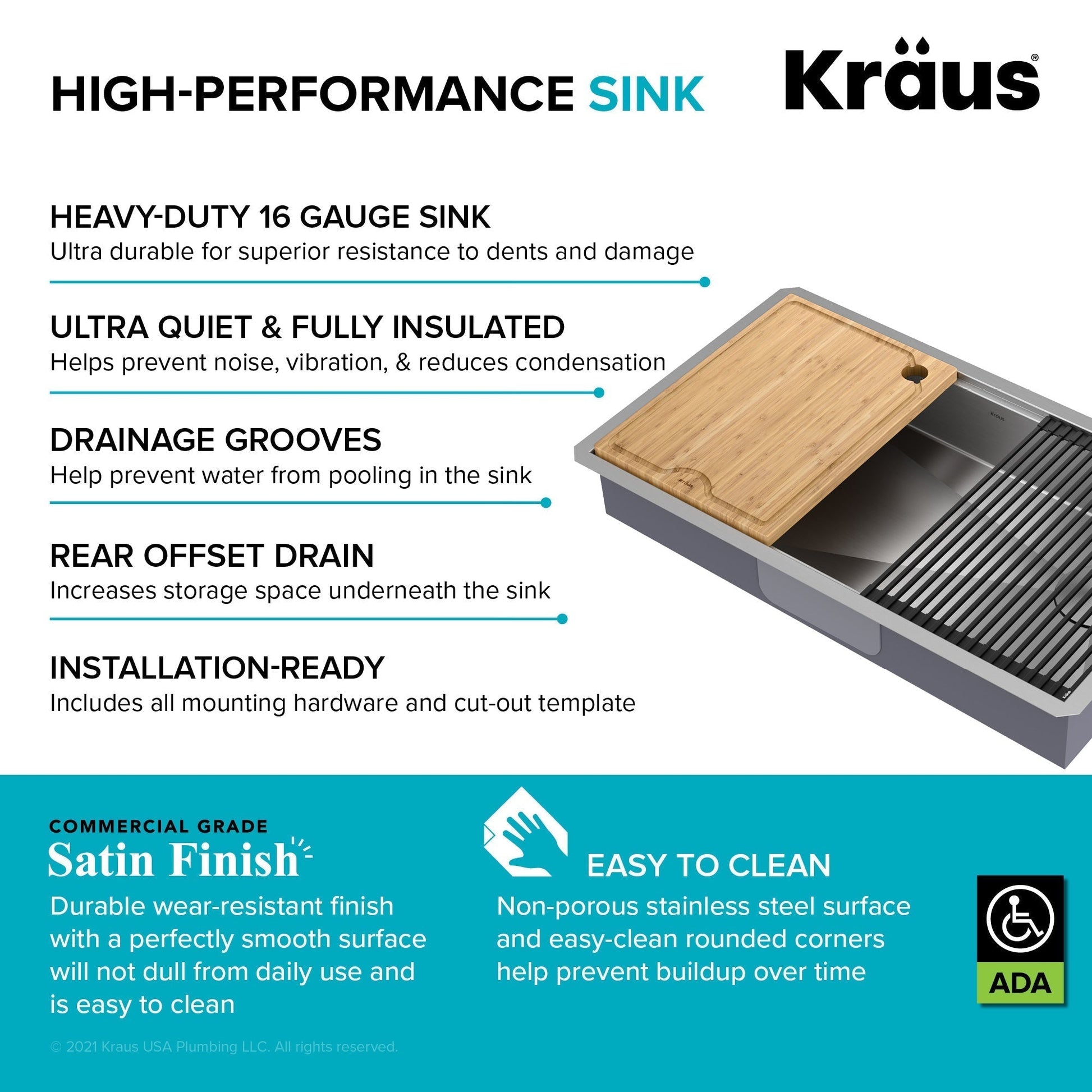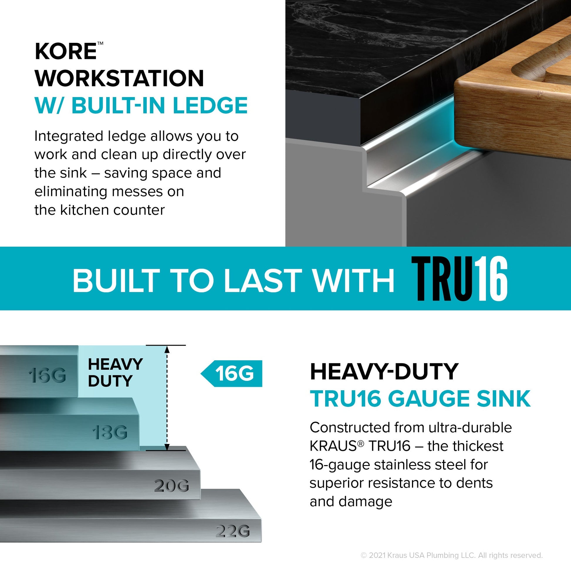 Cook, serve, and entertain in style with KRAUS Kore Workstation Sinks. Engineered with an integrated ledge to support custom sliding accessories, this sink creates a multifunctional workspace to streamline all your kitchen tasks from meal prep to cleanup. This modern ADA-compliant design features a shallow 5.5 inch depth for easy access by users with limited mobility, while offering greater functionality than traditional ADA sinks. The included cutting board and roll-up dish rack allow you to work right over the sink without losing valuable workspace on the kitchen counter. Straight walls and tight-radius corners offer a fresh modern look for any kitchen. Kore sinks are made with KRAUS TRU16 - the thickest 16-gauge steel - for uncompromising durability. Undermount installation creates a seamless transition between sink and countertop, with no exposed mounting deck to trap food and debris. Extra-thick NoiseDefend sound dampening pads on all sides of the sink absorb noise and vibration, for an ultra-quiet experience while the sink is in use. Designed for quick and complete drainage, the large single bowl with offset drain easily accommodates your biggest cookware and stacks of dishes. The sink kit comes with a set of matching accessories, including a stainless steel bottom grid and drain assembly with decorative cover for a clean look.