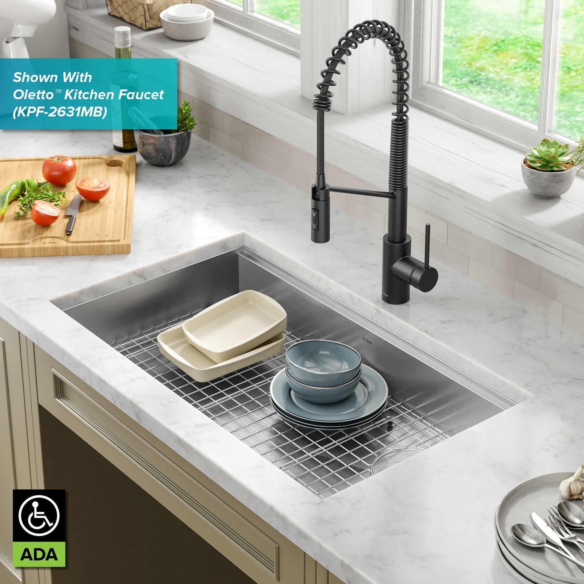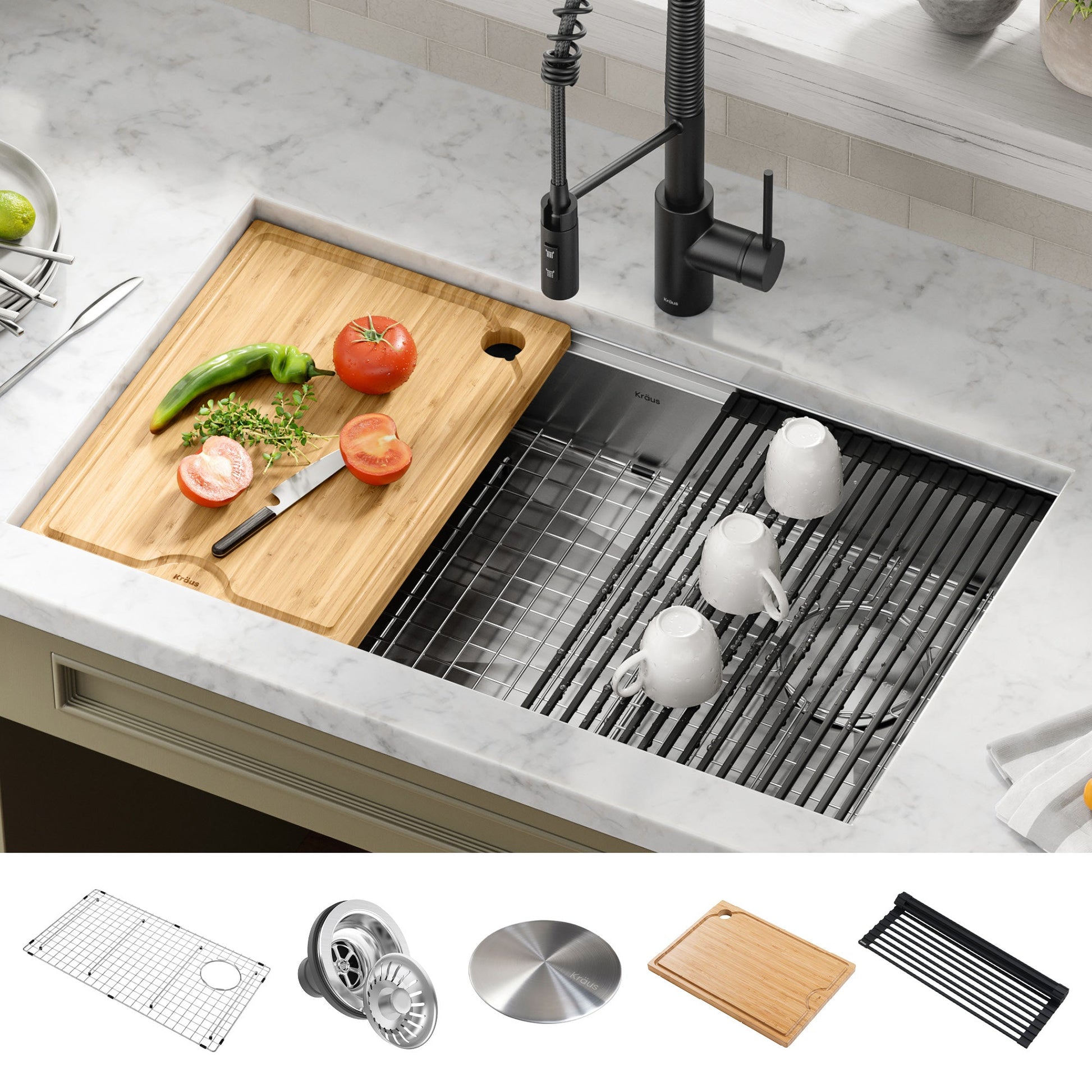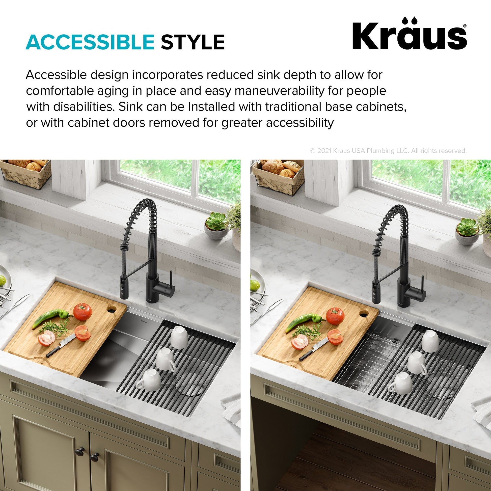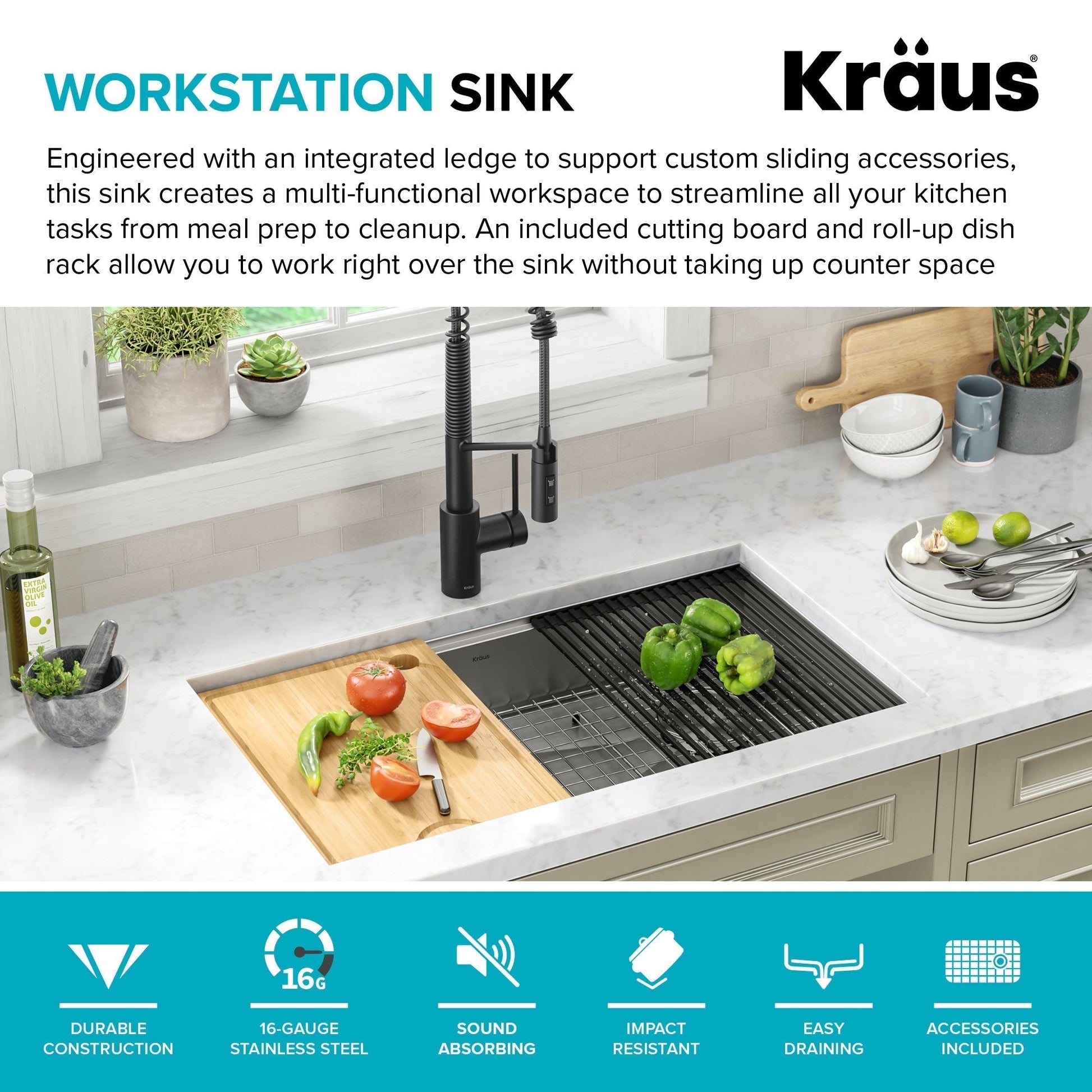 Cook, serve, and entertain in style with KRAUS Kore Workstation Sinks. Engineered with an integrated ledge to support custom sliding accessories, this sink creates a multifunctional workspace to streamline all your kitchen tasks from meal prep to cleanup. This modern ADA-compliant design features a shallow 5.5 inch depth for easy access by users with limited mobility, while offering greater functionality than traditional ADA sinks. The included cutting board and roll-up dish rack allow you to work right over the sink without losing valuable workspace on the kitchen counter. Straight walls and tight-radius corners offer a fresh modern look for any kitchen. Kore sinks are made with KRAUS TRU16 - the thickest 16-gauge steel - for uncompromising durability. Undermount installation creates a seamless transition between sink and countertop, with no exposed mounting deck to trap food and debris. Extra-thick NoiseDefend sound dampening pads on all sides of the sink absorb noise and vibration, for an ultra-quiet experience while the sink is in use. Designed for quick and complete drainage, the large single bowl with offset drain easily accommodates your biggest cookware and stacks of dishes. The sink kit comes with a set of matching accessories, including a stainless steel bottom grid and drain assembly with decorative cover for a clean look.