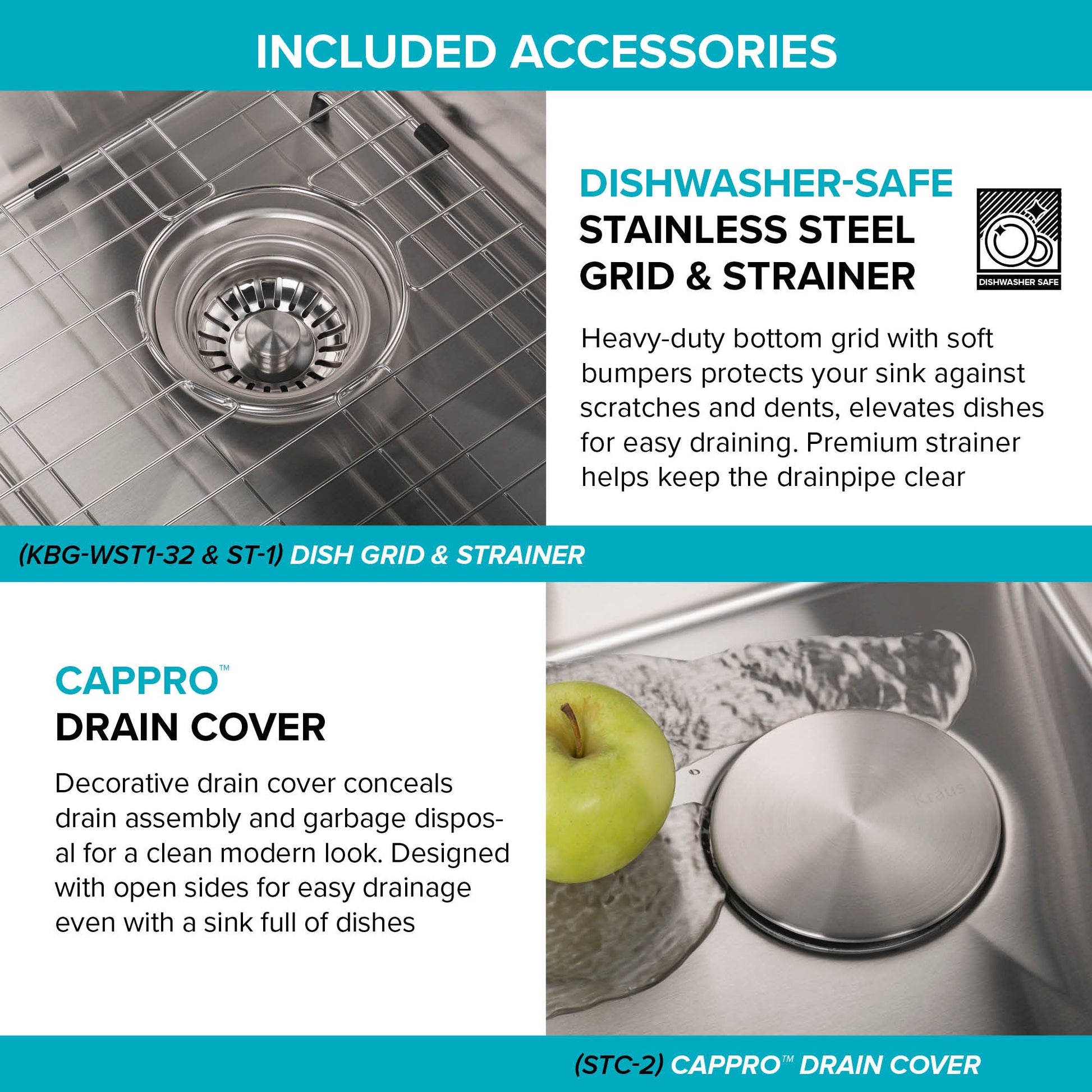 STAINLESS STEEL BOTTOM GRID: Dishwasher-safe dish rack protects sink surface and keeps dishes elevated for optimal draining