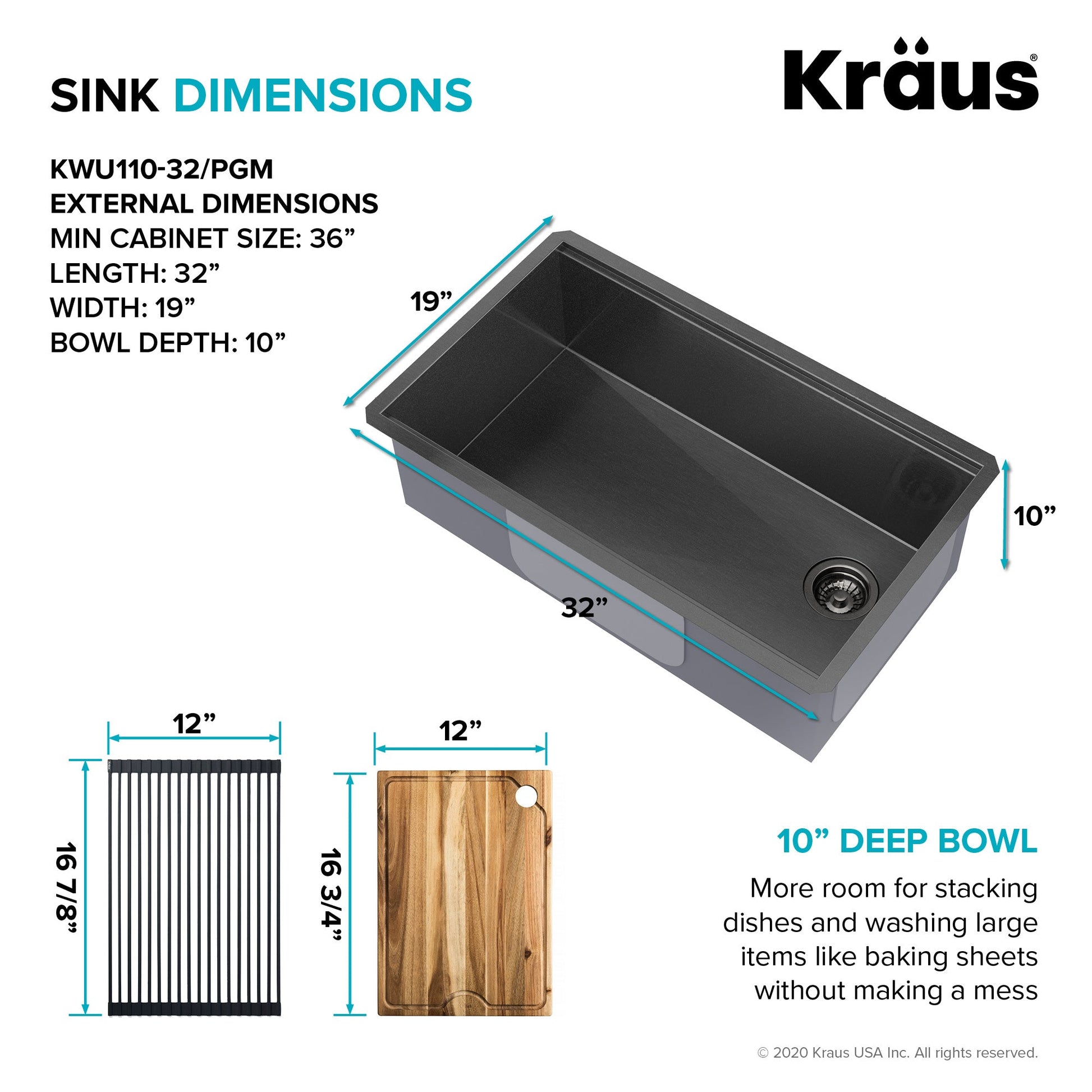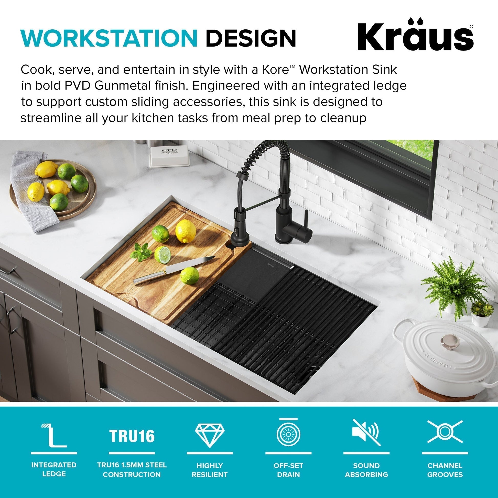 Cook, serve, and entertain in style with a Kore Workstation Sink in bold PVD Gunmetal finish. Offering a unique color option for stainless steel sinks, the PVD Gunmetal finish has a modern yet timeless appearance that blends well with today's popular black stainless steel appliances and makes this sink a showpiece in any kitchen. This sink pairs beautifully with black faucets as well as contrasting finishes for a look that really catches the eye. Engineered with an integrated ledge to support custom sliding accessories, this sink is designed to streamline all your kitchen tasks from meal prep to cleanup. The included cutting board and roll-up dish rack allow you to work right over the sink without taking up counter space. Kore sinks are made with KRAUS TRU16 - the thickest steel on the market - for uncompromising durability. DuraShield PVD finish application results in a color coating that bonds completely to the steel, greatly improving durability with superior resistance to abrasion, chips, and corrosion. Sandblasted matte texture resists water spots and fingerprints while enhancing the modern appearance. Undermount installation creates a clean transition between sink and countertop, with no exposed mounting deck to trap food and debris. Designed for perfect drainage, the large single bowl with offset drain easily accommodates your biggest cookware and stacks of dishes. The kit comes with a set of matching accessories, including a stainless steel bottom grid and drain assembly with decorative cover for a continuous look