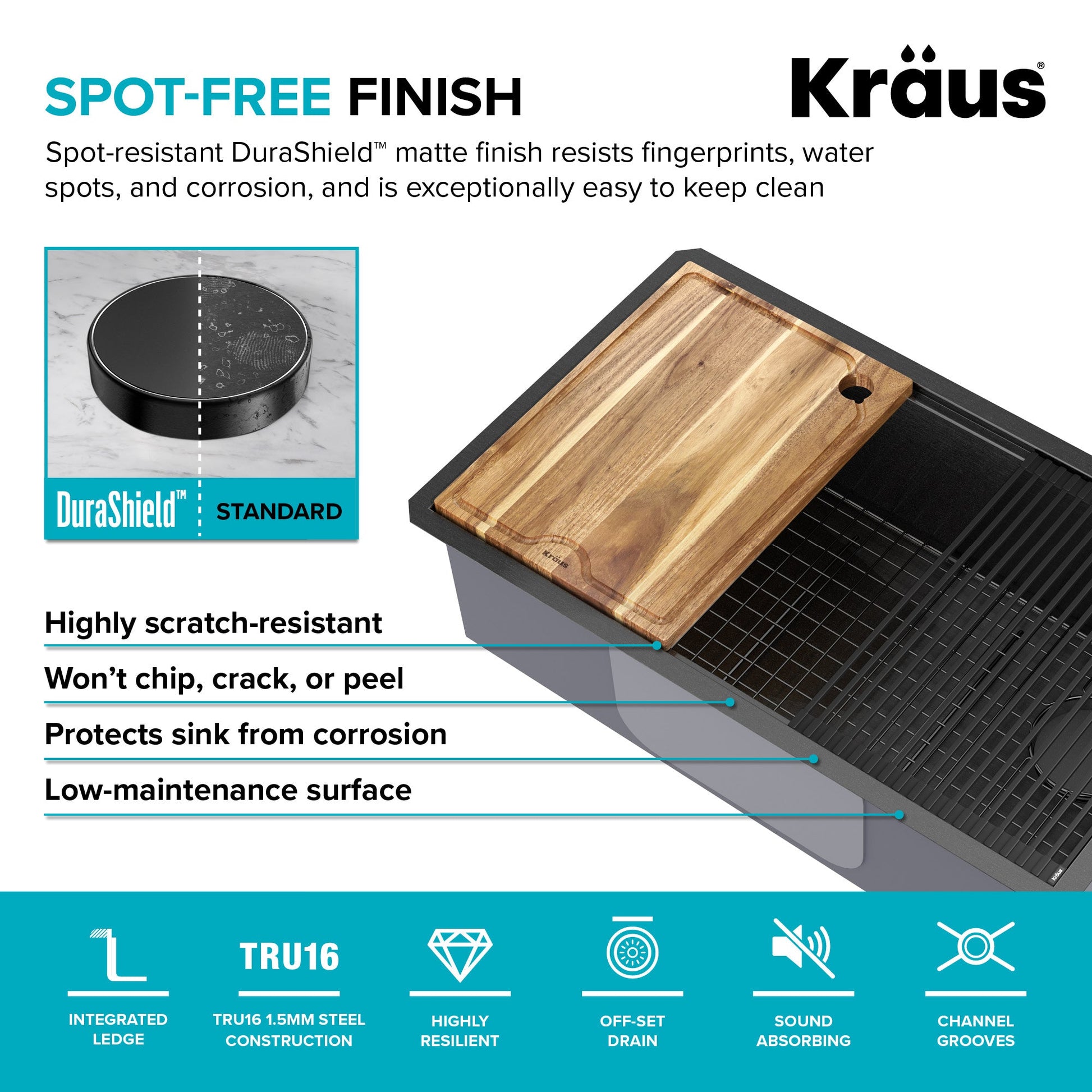 HIGH-PERFORMANCE 16 GAUGE STEEL: Constructed from proprietary KRAUS TRU16 - the thickest 16-gauge stainless steel for superior durability and resistance to dents and damage