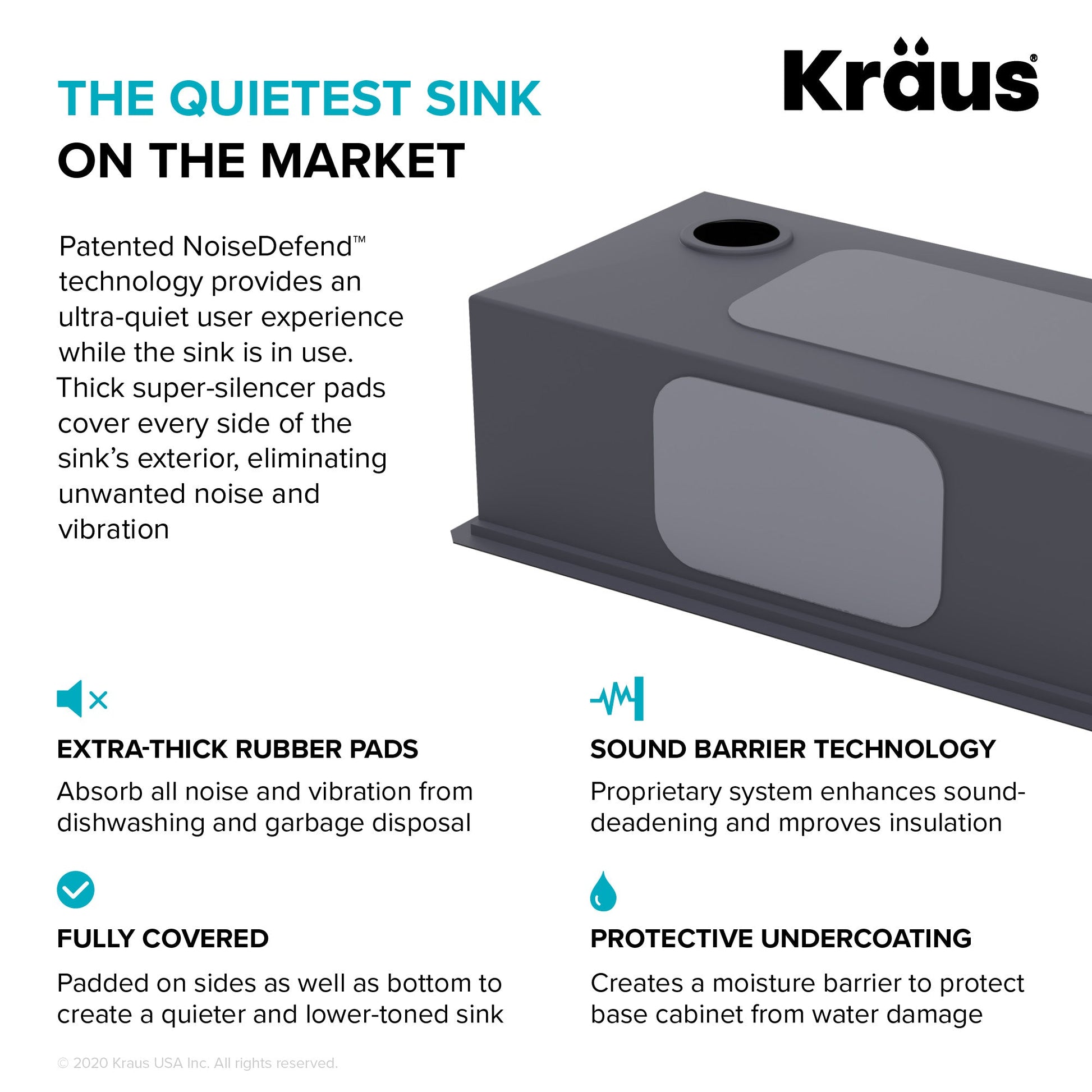 SUPER SILENT SINK: Proprietary NoiseDefend soundproofing technology with thick super silencer pads that cover all sides of the sink eliminates noise and vibration - Fully insulated with anti-condensation undercoating that prevents water damage