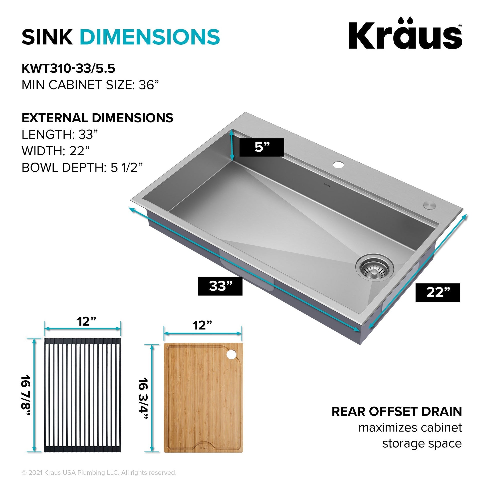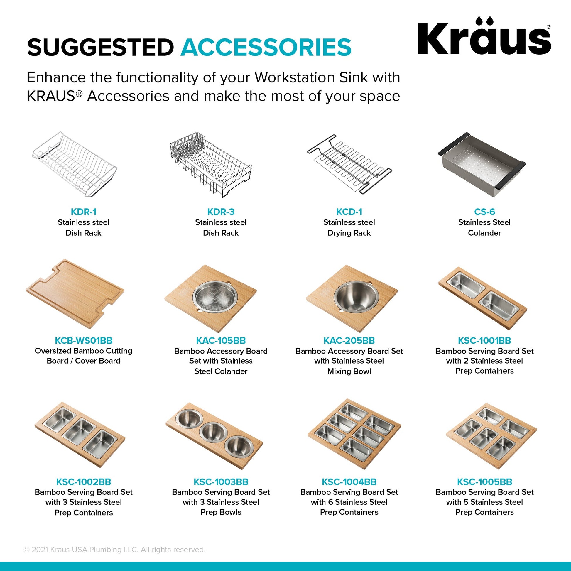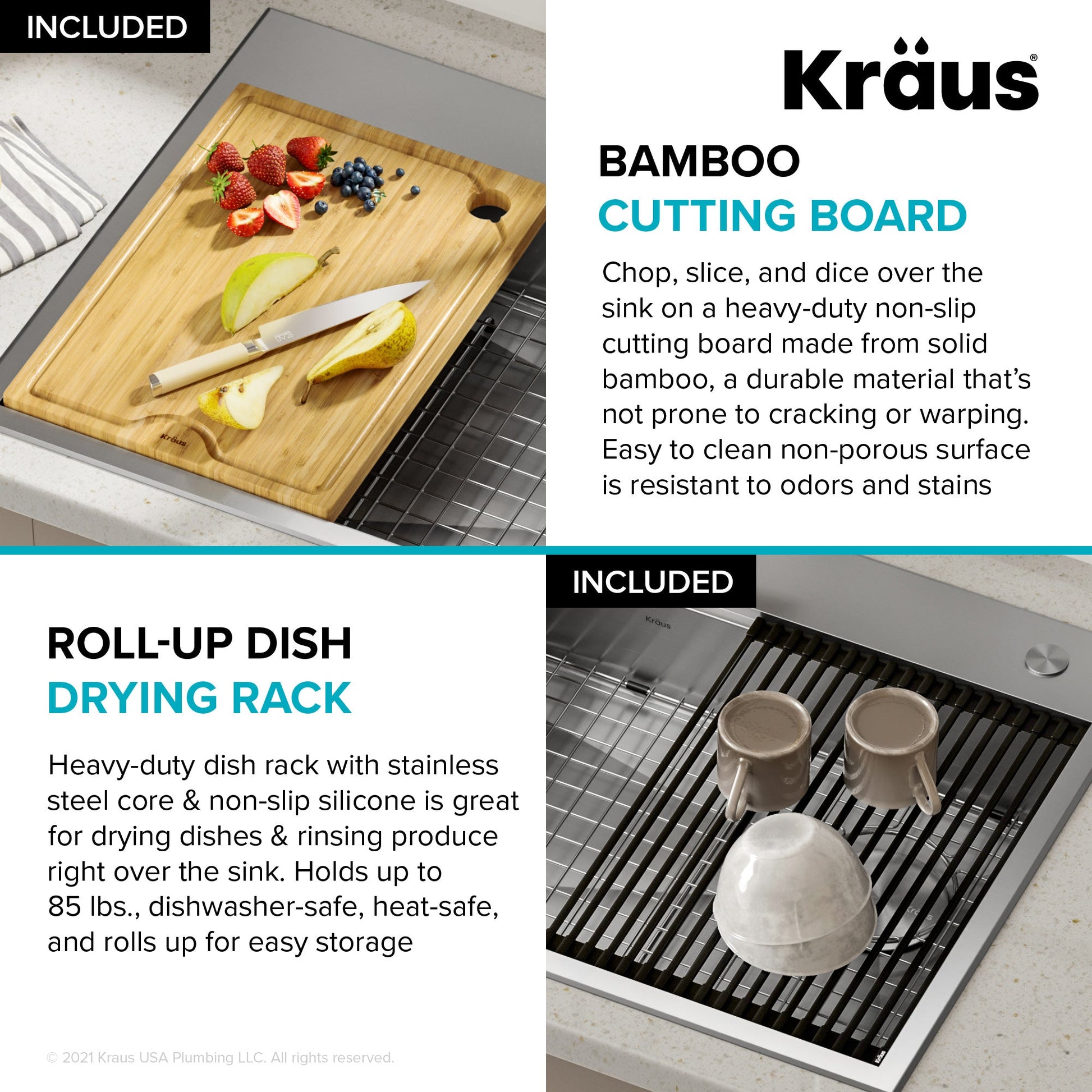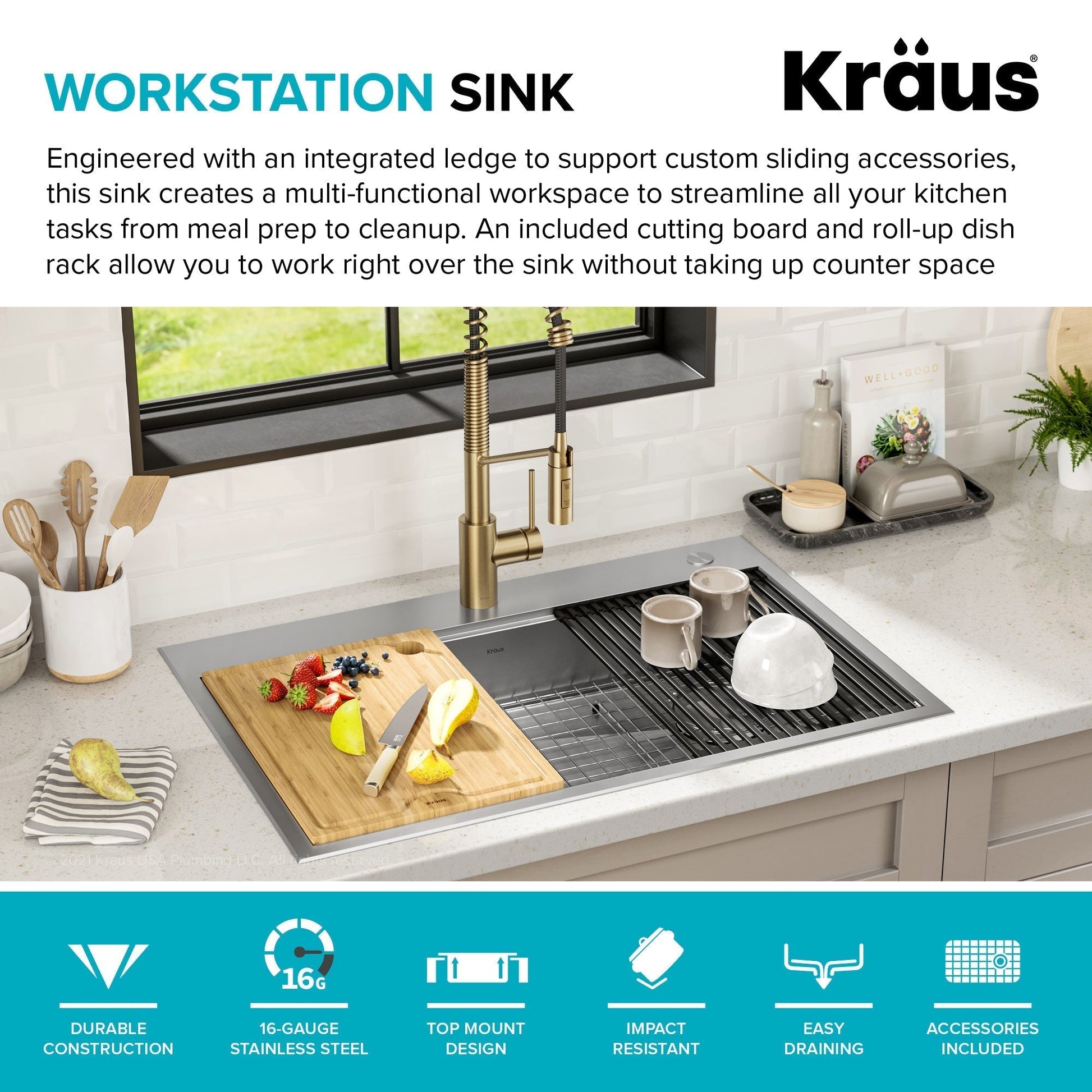 SINK KIT INCLUDES: Stainless steel workstation sink, heavy-duty bamboo cutting board, roll-up dish drying rack, protective bottom grid, drain assembly and decorative drain cover