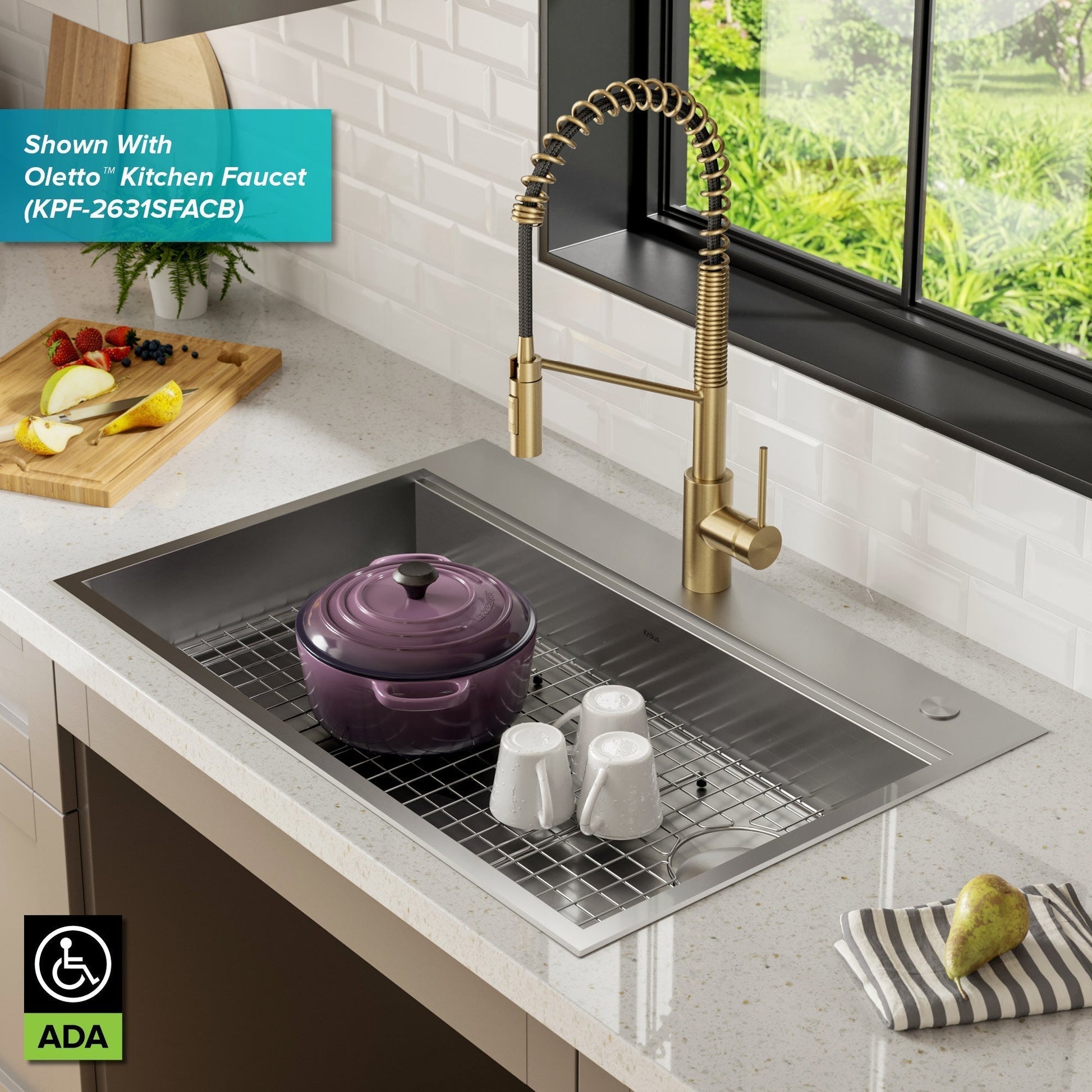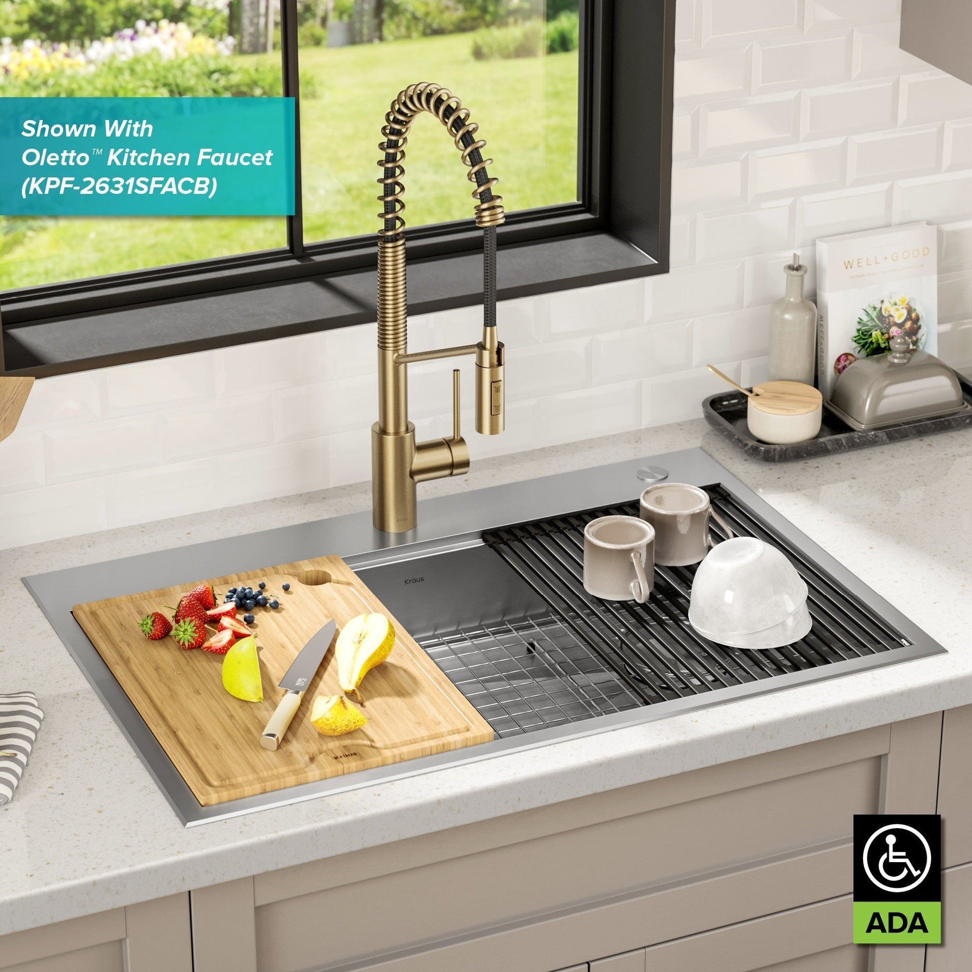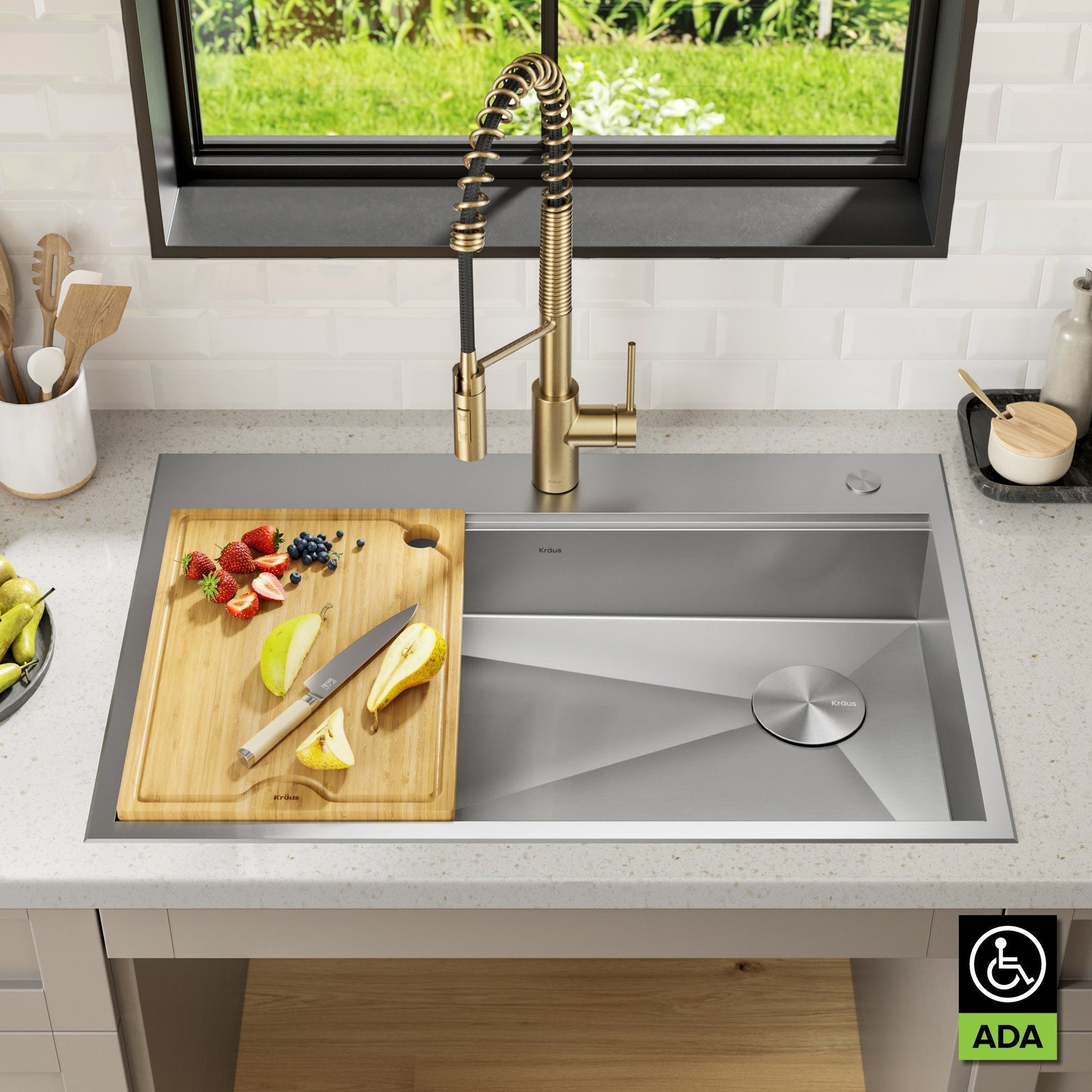 Cook, serve, and entertain in style with KRAUS Kore Workstation Sinks. Engineered with an integrated ledge to support custom sliding accessories, this sink creates a multifunctional workspace to streamline all your kitchen tasks from meal prep to cleanup. This modern ADA-compliant design features a shallow 5.5 inch depth for easy access by users with limited mobility, while offering greater functionality than traditional ADA sinks. The included cutting board and roll-up dish rack allow you to work right over the sink without losing valuable workspace on the kitchen counter. Straight walls and tight-radius corners offer a fresh modern look for any kitchen.