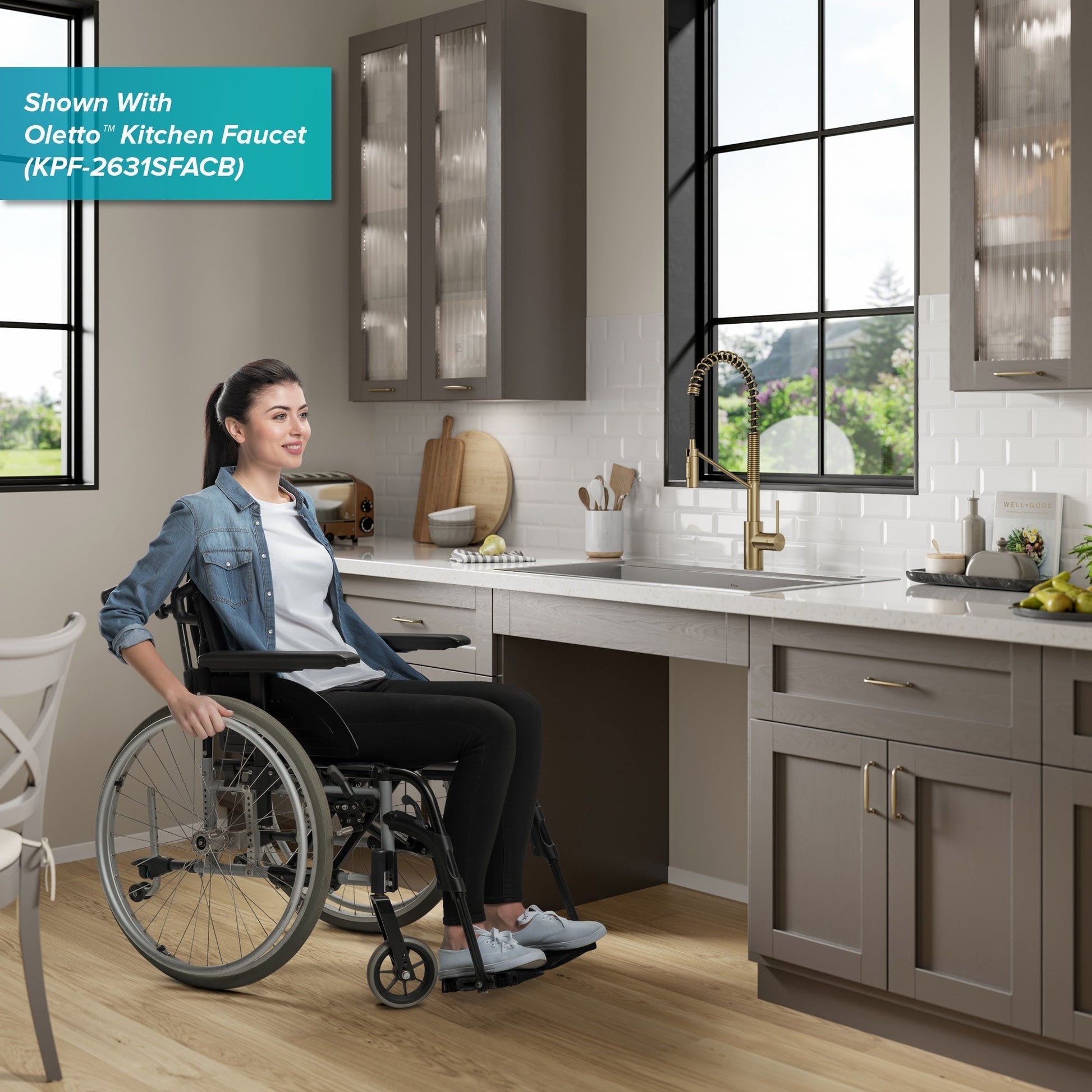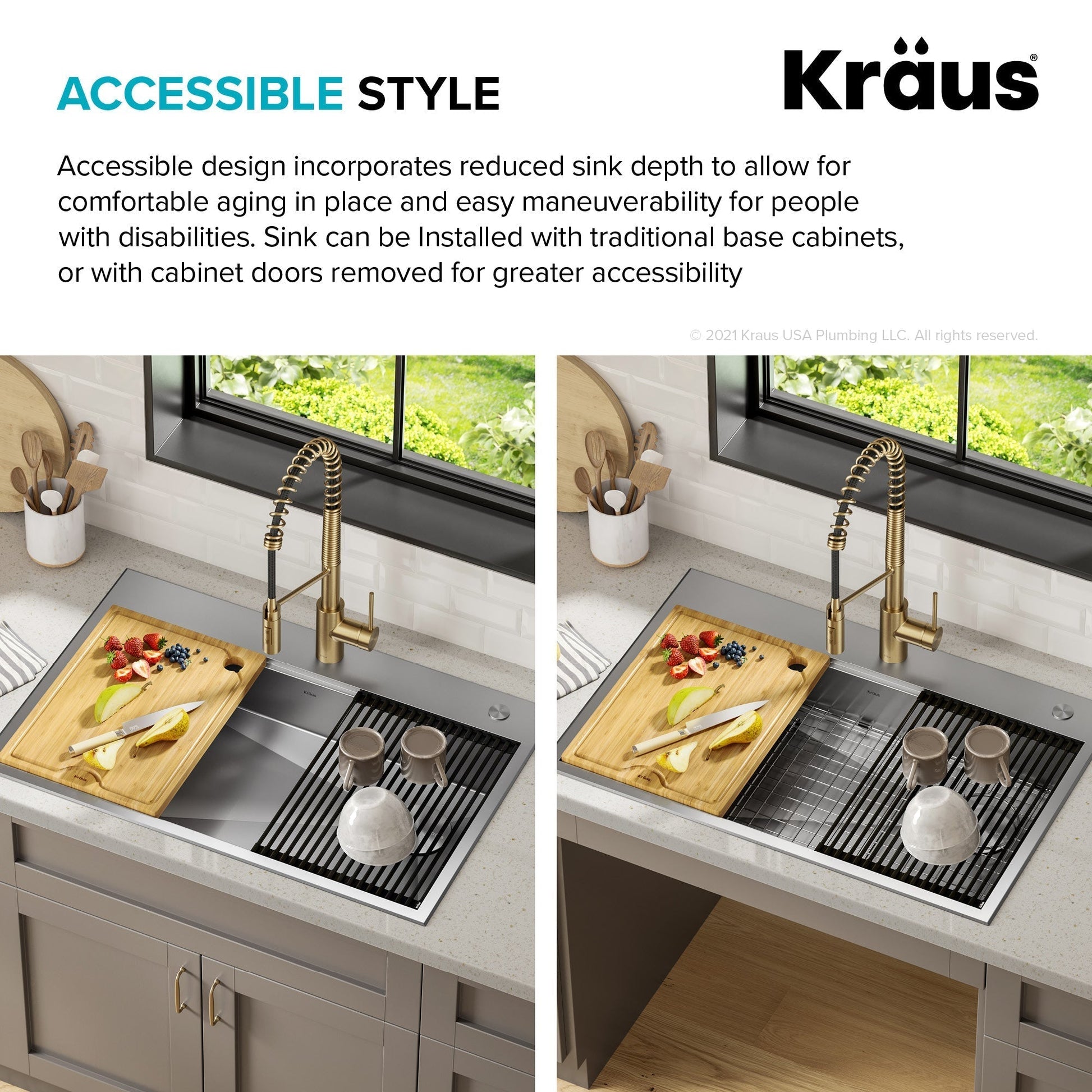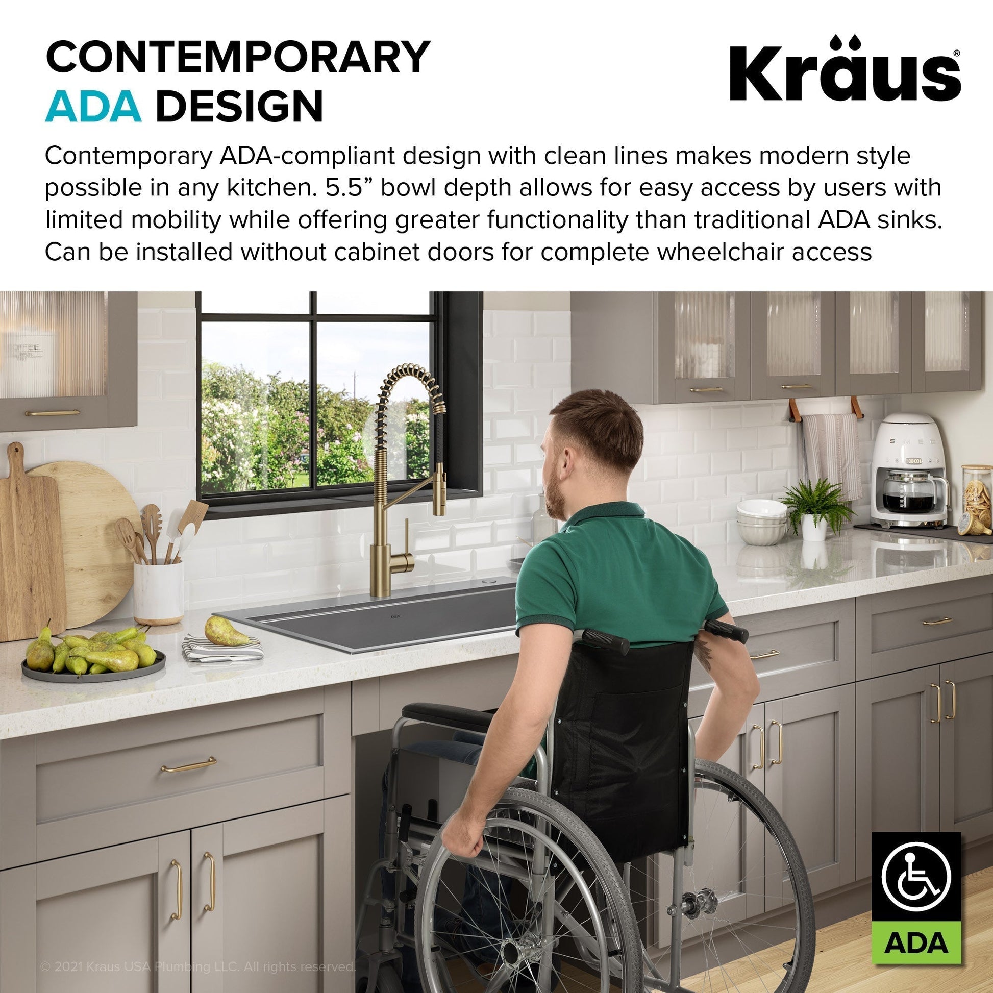 ADA-COMPLIANT SINK with reduced 5.5" bowl depth offers ease of use for individuals with limited mobility, and makes an ideal solution for aging in place - Sink can be installed with traditional cabinets, or without cabinet doors for full wheelchair access