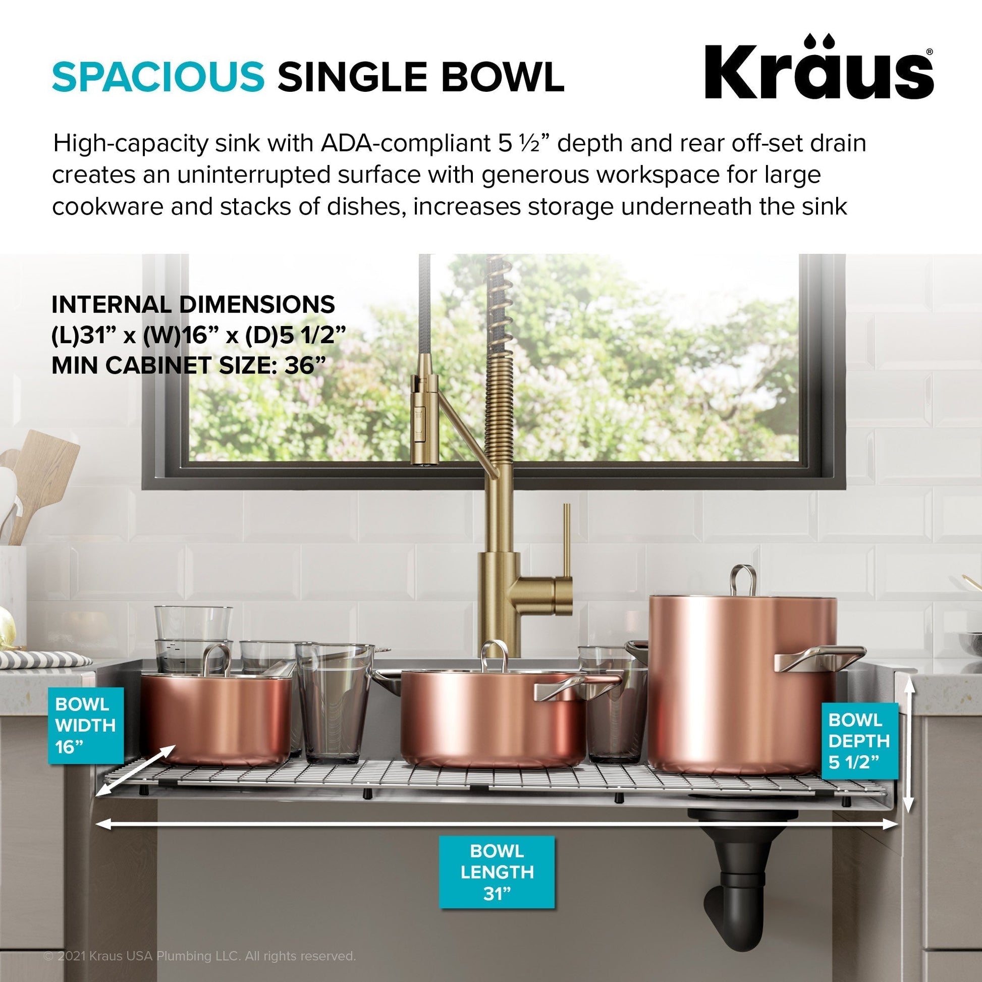 SPACIOUS SINGLE BOWL: High-capacity single bowl sink creates an uninterrupted surface with generous workspace for large cookware and stacks of dishes - Rear offset drain increases cabinet storage space underneath the sink