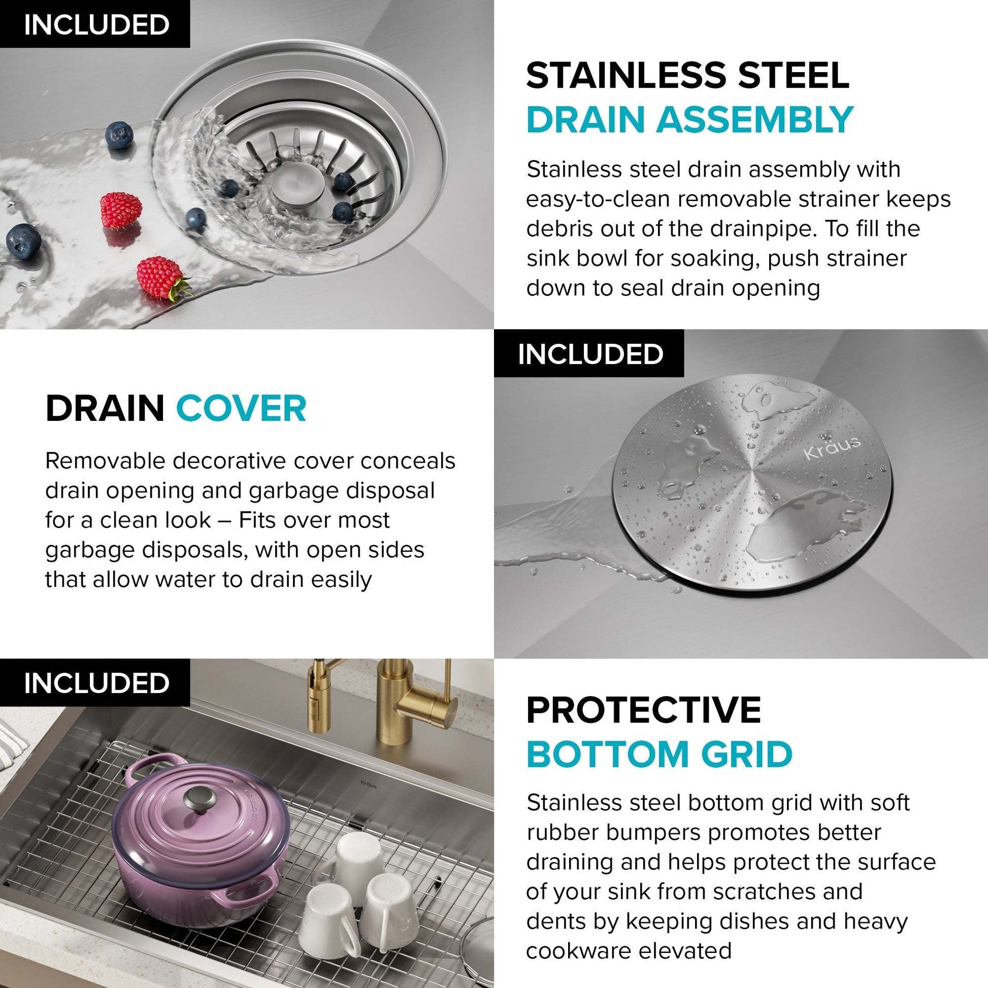 PROTECTIVE BOTTOM GRID: Stainless steel bottom grid with soft rubber bumpers promotes better draining and helps protect the surface of your sink from scratches and dents by keeping dishes and heavy cookware elevated