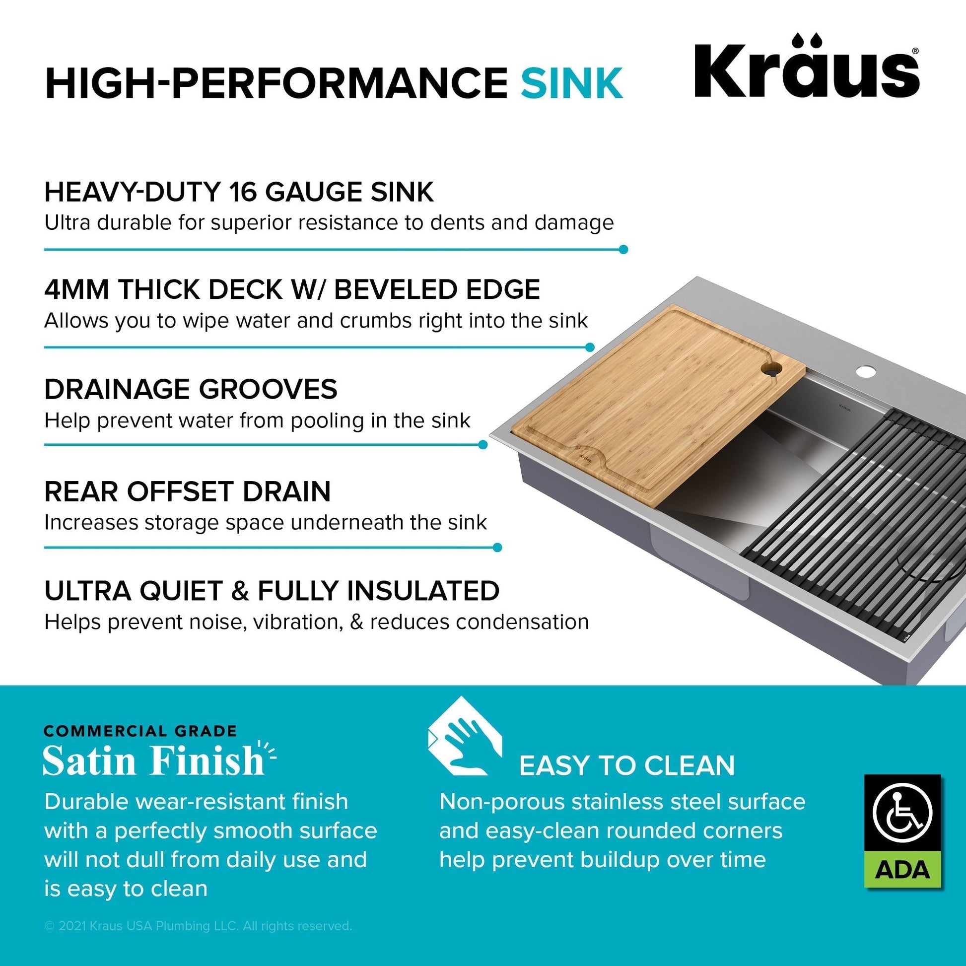 HEAVY-DUTY 16 GAUGE SINK: Constructed from ultra-durable KRAUS TRU16 - the thickest 16-gauge stainless steel for superior resistance to dents and damage