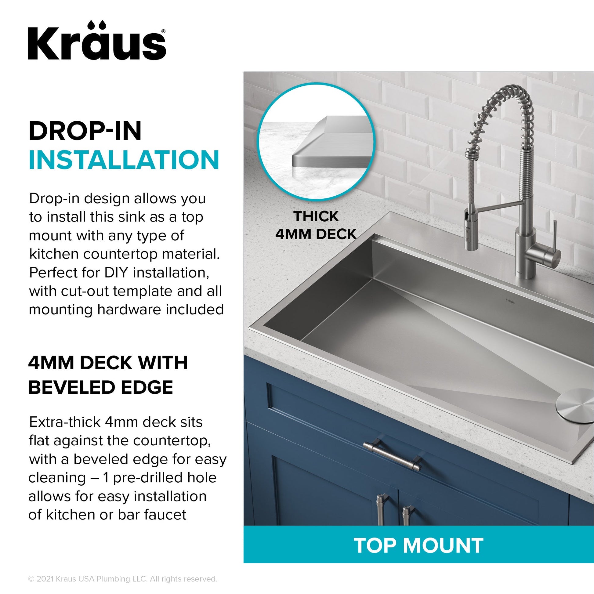 DROP-IN/UNDERMOUNT DESIGN: Dual-mount sink with 2 -pre-drilled holes can be installed as undermount or topmount with any kind of kitchen countertop - EXTRA-THICK 4mm deck sits flat against the countertop, with a beveled edge that allows you to wipe water and crumbs directly into the sink