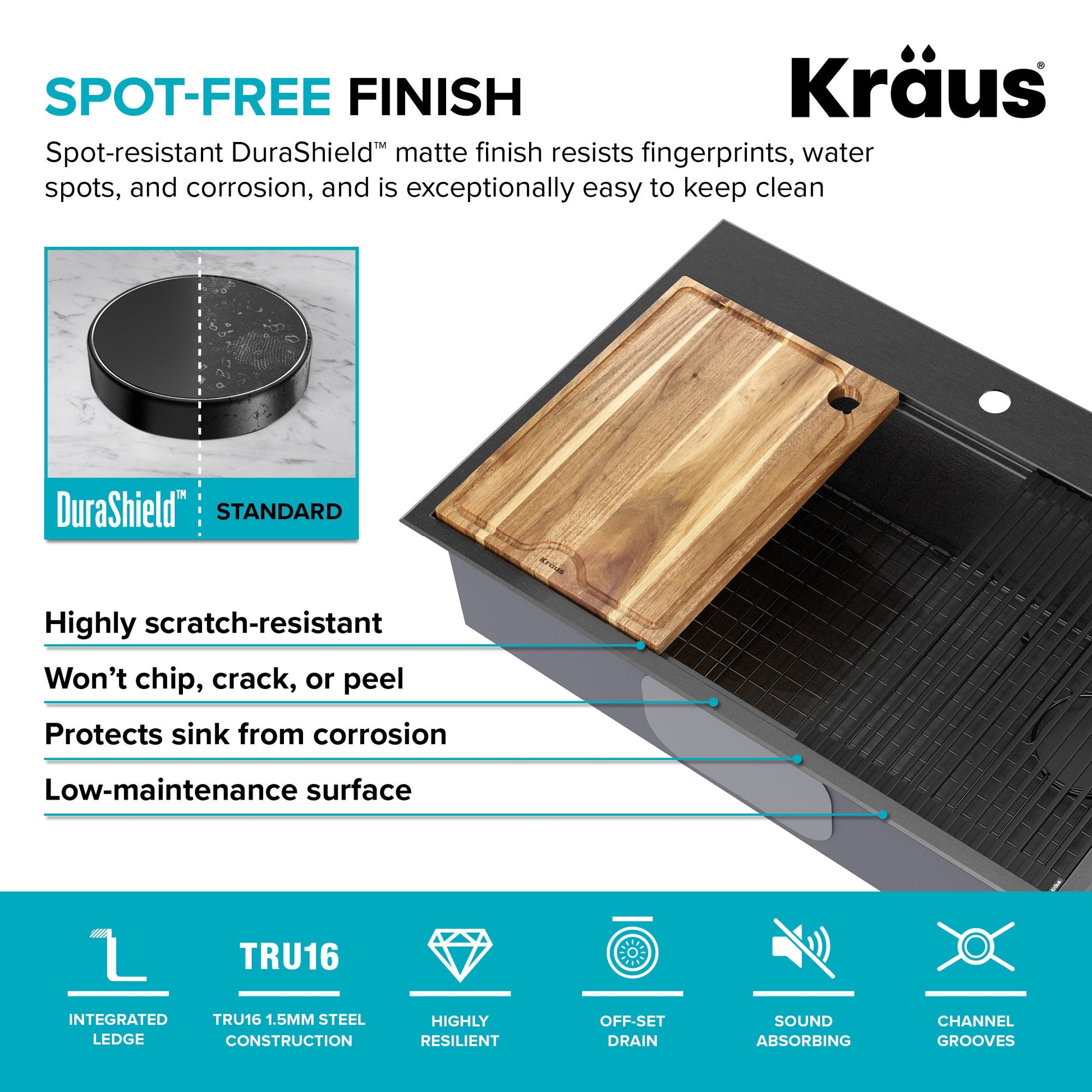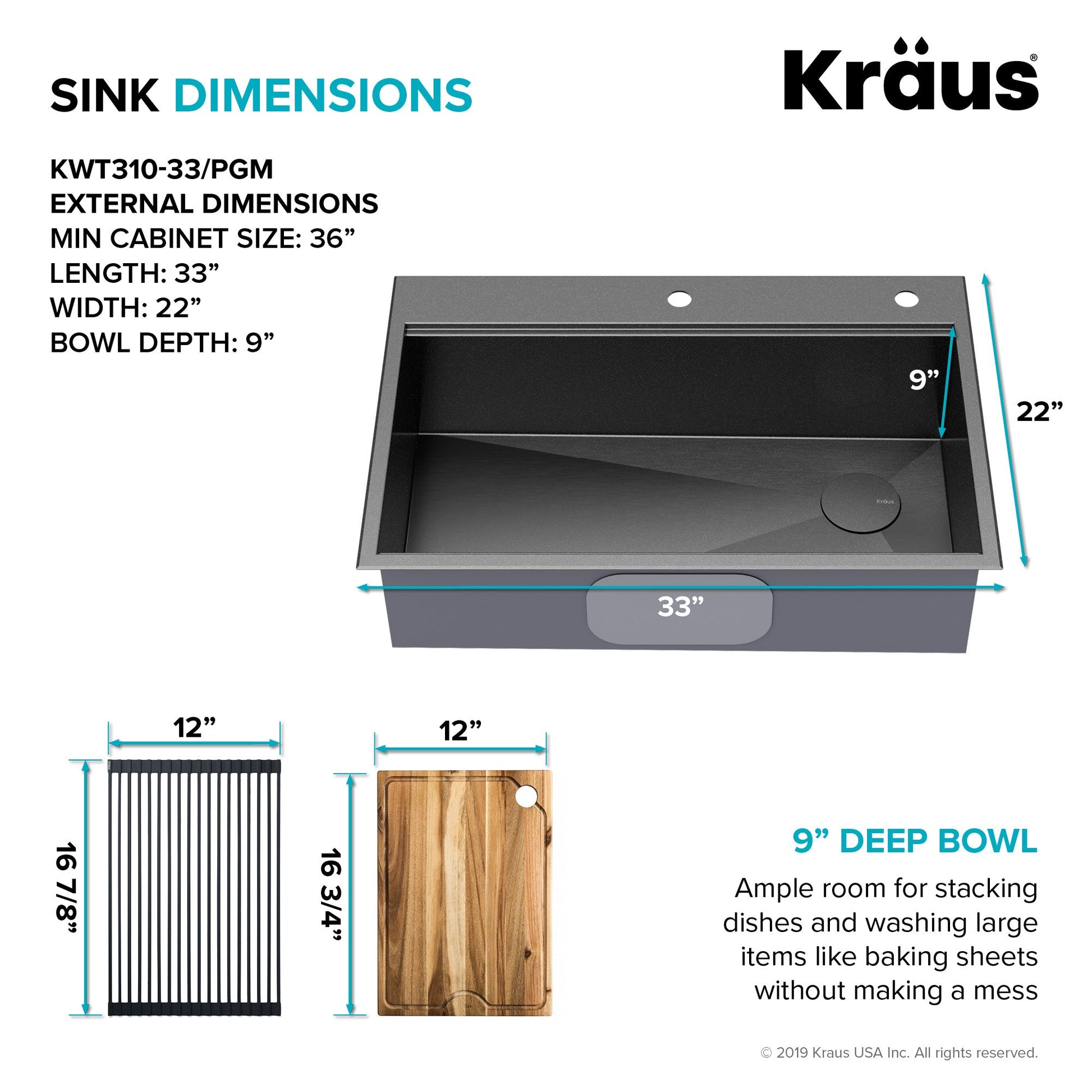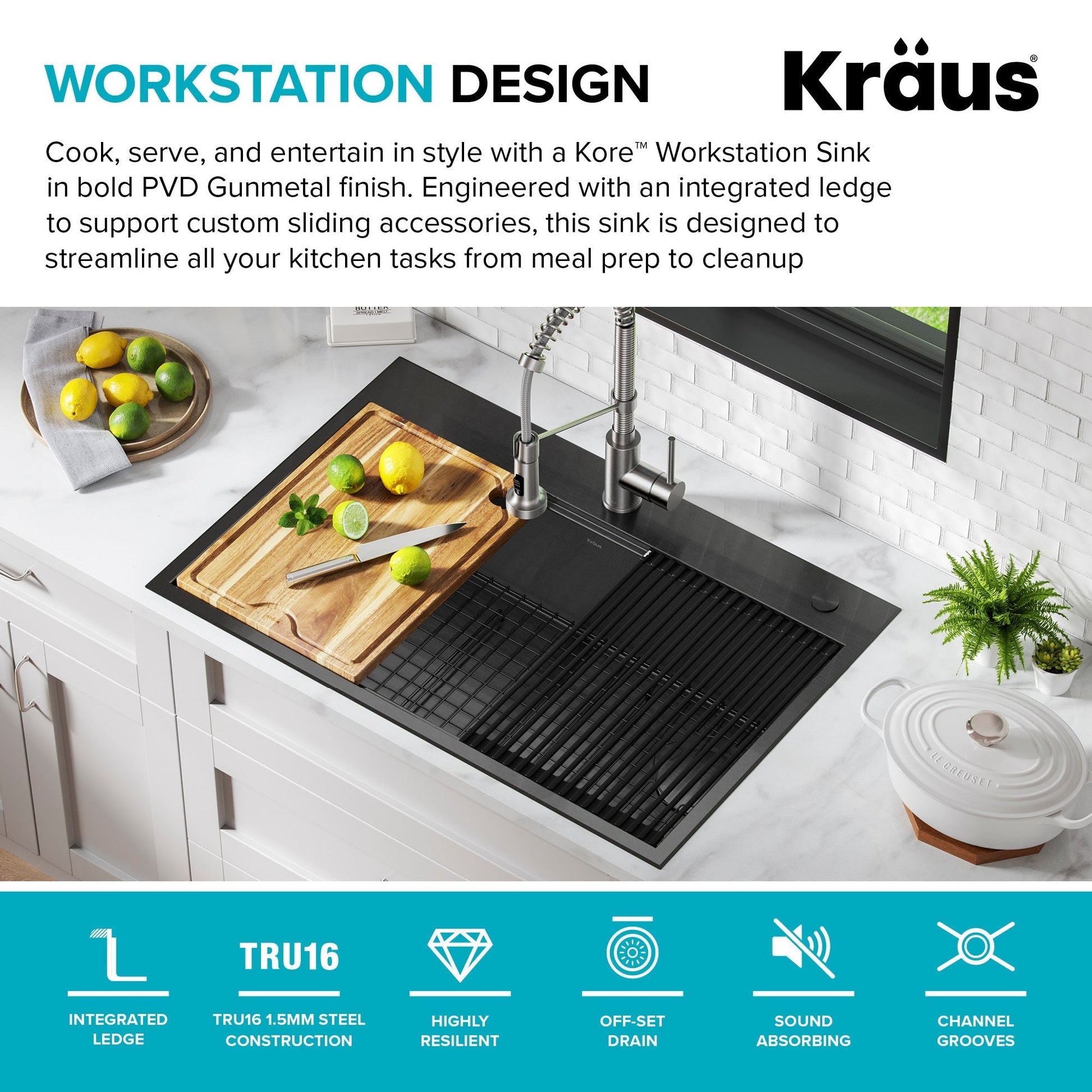 Cook, serve, and entertain in style with a Kore Workstation Sink in bold PVD Gunmetal finish. Offering a unique color option for stainless steel sinks, the PVD Gunmetal finish has a modern yet timeless appearance that blends well with today's popular black stainless steel appliances and makes this sink a showpiece in any kitchen. This sink pairs beautifully with black faucets as well as contrasting finishes for a look that really catches the eye. Engineered with an integrated ledge to support custom sliding accessories, this sink is designed to streamline all your kitchen tasks from meal prep to cleanup. The included cutting board and roll-up dish rack allow you to work right over the sink without taking up counter space. Kore sinks are made with KRAUS TRU16 - the thickest steel on the market - for uncompromising durability. DuraShield PVD finish application results in a color coating that bonds completely to the steel, greatly improving durability with superior resistance to abrasion, chips, and corrosion. Sandblasted matte texture resists water spots and fingerprints while enhancing the modern appearance. A versatile topmount design allows you to install this sink as a drop-in with any type of kitchen counter, with an extra-thick 4mm deck that sits flat against the countertop for a finished look. Designed for perfect drainage, the large single bowl with offset drain easily accommodates your biggest cookware and stacks of dishes. The kit comes with a set of matching accessories, including a stainless steel bottom grid and drain assembly with decorative cover for a continuous look