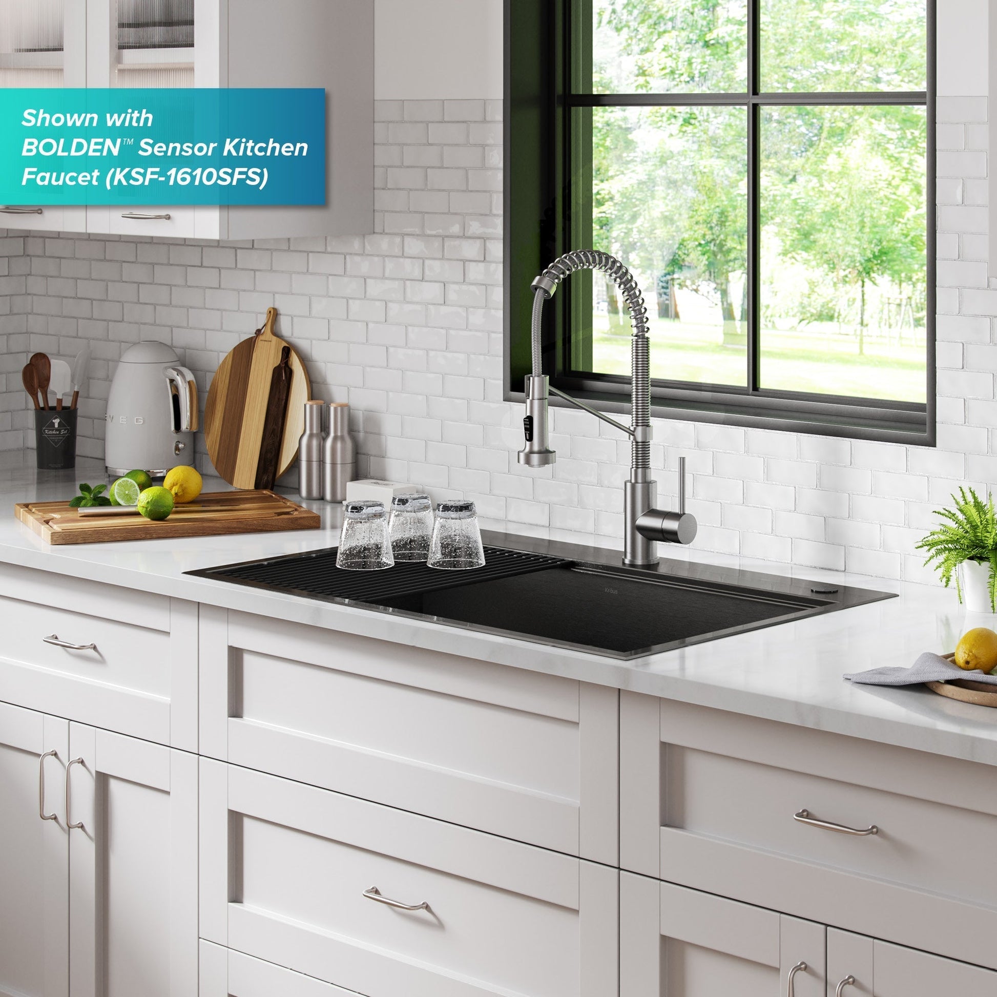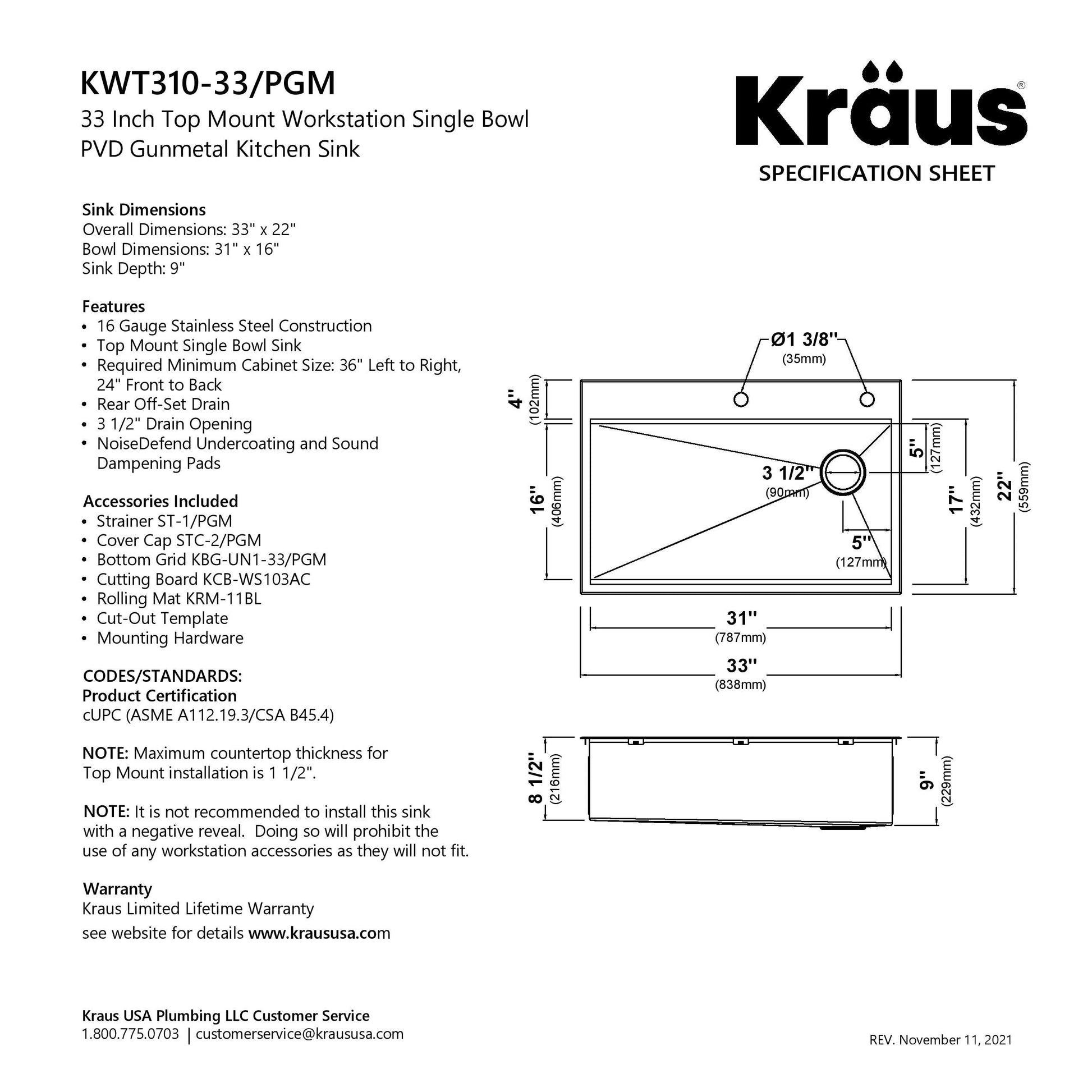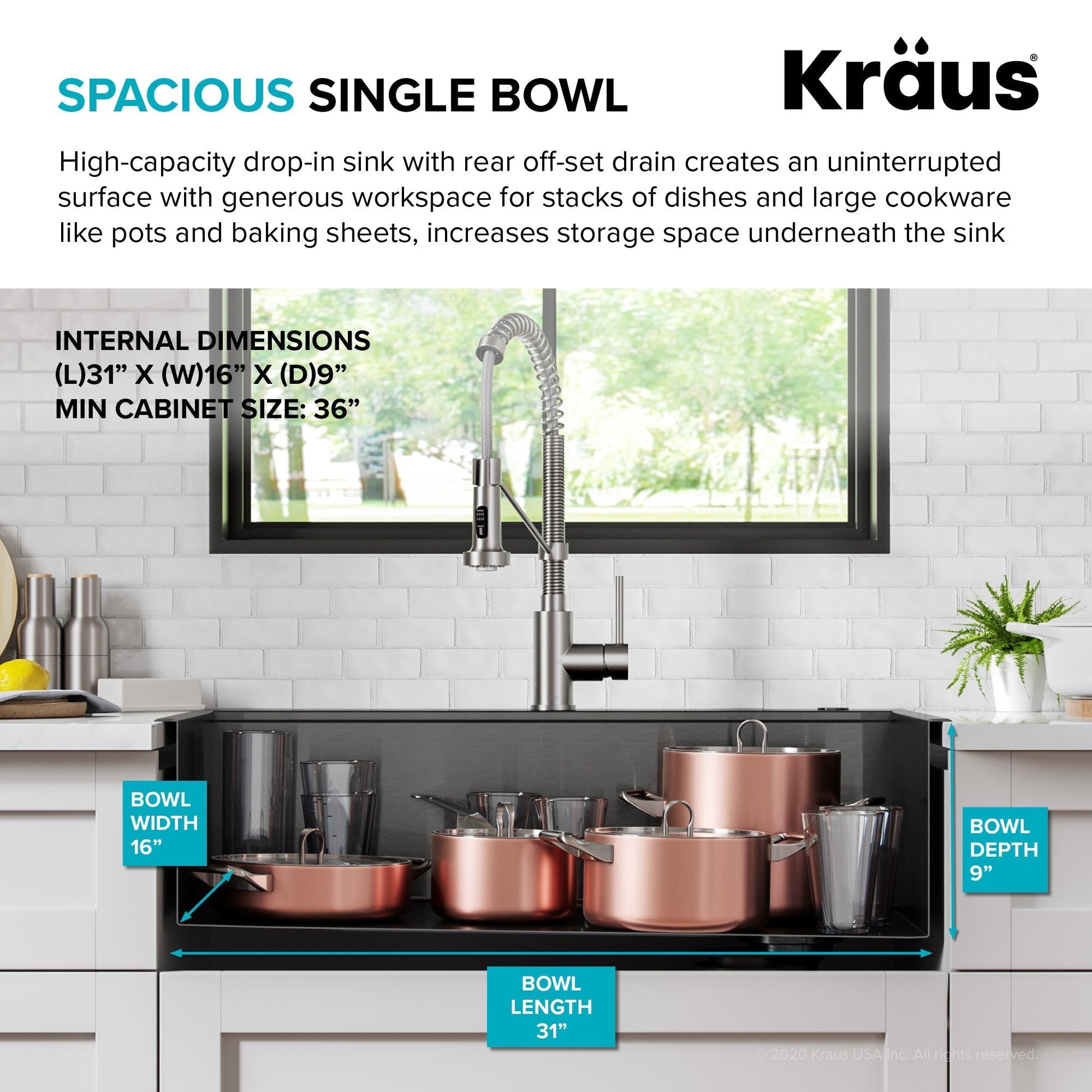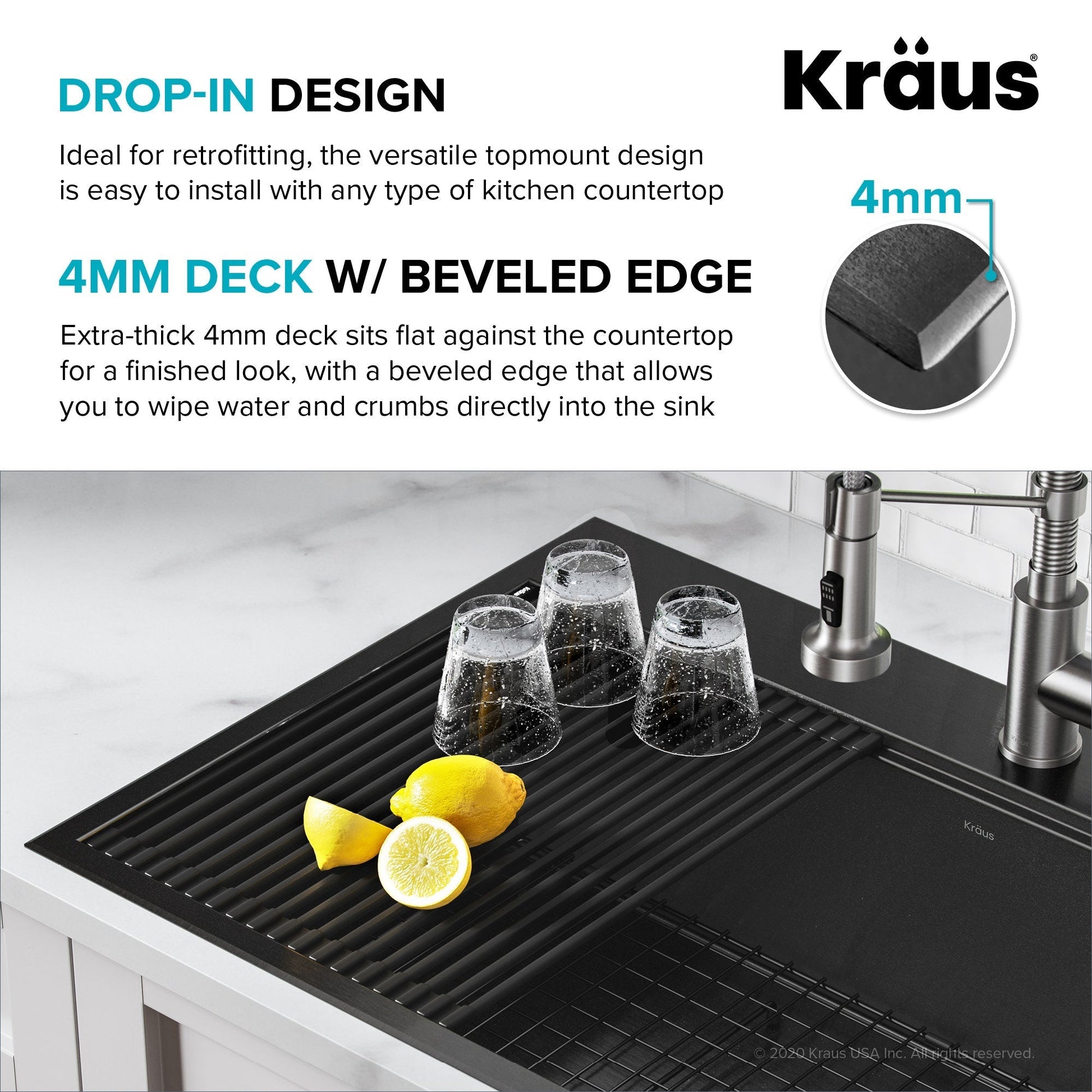 Cook, serve, and entertain in style with a Kore Workstation Sink in bold PVD Gunmetal finish. Offering a unique color option for stainless steel sinks, the PVD Gunmetal finish has a modern yet timeless appearance that blends well with today's popular black stainless steel appliances and makes this sink a showpiece in any kitchen. This sink pairs beautifully with black faucets as well as contrasting finishes for a look that really catches the eye. Engineered with an integrated ledge to support custom sliding accessories, this sink is designed to streamline all your kitchen tasks from meal prep to cleanup. The included cutting board and roll-up dish rack allow you to work right over the sink without taking up counter space. Kore sinks are made with KRAUS TRU16 - the thickest steel on the market - for uncompromising durability. DuraShield PVD finish application results in a color coating that bonds completely to the steel, greatly improving durability with superior resistance to abrasion, chips, and corrosion. Sandblasted matte texture resists water spots and fingerprints while enhancing the modern appearance. A versatile topmount design allows you to install this sink as a drop-in with any type of kitchen counter, with an extra-thick 4mm deck that sits flat against the countertop for a finished look. Designed for perfect drainage, the large single bowl with offset drain easily accommodates your biggest cookware and stacks of dishes. The kit comes with a set of matching accessories, including a stainless steel bottom grid and drain assembly with decorative cover for a continuous look