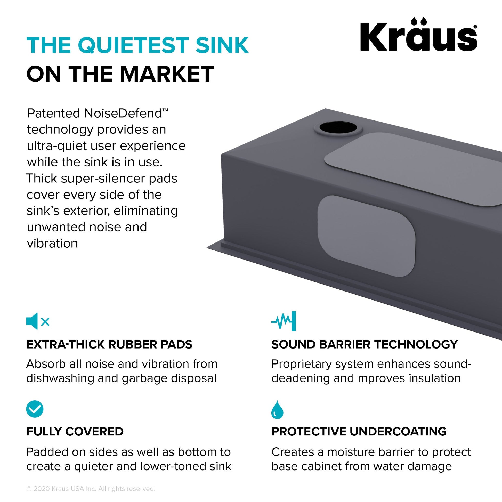 SUPER SILENT SINK: Proprietary NoiseDefend soundproofing technology with thick super silencer pads that cover all sides of the sink eliminates noise and vibration - Fully insulated with anti-condensation undercoating that prevents water damage