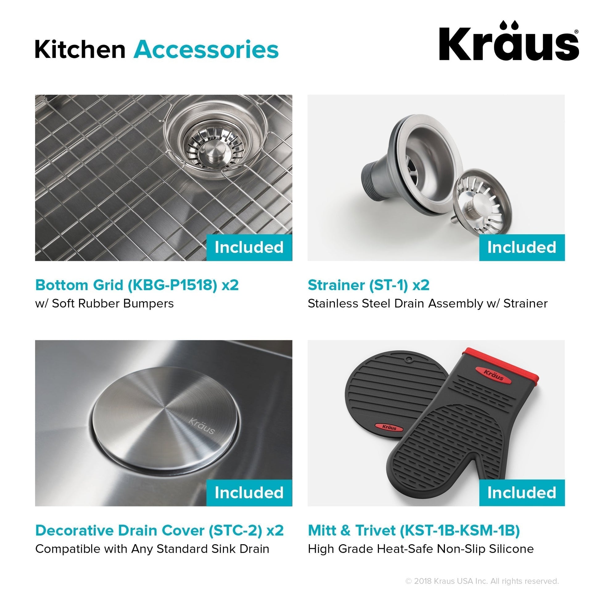 Kitchen Set Includes: Sink, bottom grid x2, drain assembly x2, removable drain cap x2, KRAUS kitchen towel, mounting hardware, cutout template