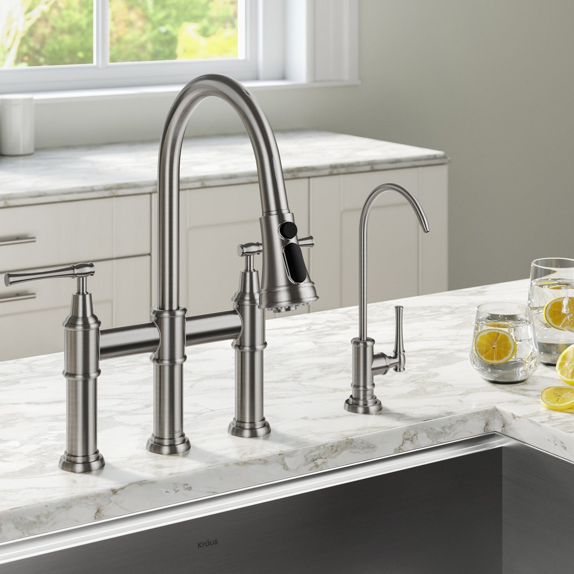 PERFECT MATCH: Create elegant transitional style and redefine the functionality of your kitchen with the Allyn combo, featuring a bridge faucet and matching water filter faucet