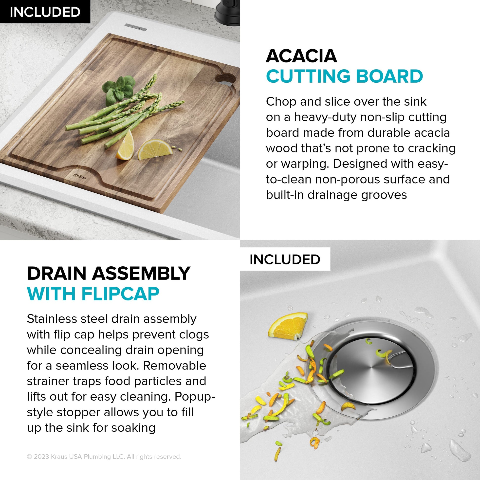 Kraus Workstation Sinks combine advanced granite composite material with innovative workstation design to enhance the style and functionality of any kitchen. Engineered with an integrated ledge to support sliding accessories, this high-capacity sink creates a multifunctional workspace to streamline tasks from meal prep to cleanup. The included acacia cutting board allows you to prepare meals right over the sink without taking up counter space. This sink is made in Italy from an advanced quartz composite material with metallic particles that provide a shimmering effect with the look and feel of real stone. Colored all the way through, the vibrant material resists discoloration and fading over time. The easy-to-clean non-porous blend creates a hard, smooth sink surface that is resistant to scratches, stains, impact, and thermal shock. Top mount design with thick mounting deck allows you to install as a drop-in sink with any countertop material; thick deck features a beveled edge for easier cleaning. The high-capacity single bowl creates an uninterrupted surface with ample space for cookware and stacks of dishes. Designed with rounded corners for easy cleaning and a gently sloped bottom for better draining. Rear-offset drain creates a modern look and adds storage space under the sink. The naturally sound-absorbing material helps reduce noise and vibration. The installation-ready sink comes with mounting hardware and drain assembly.
