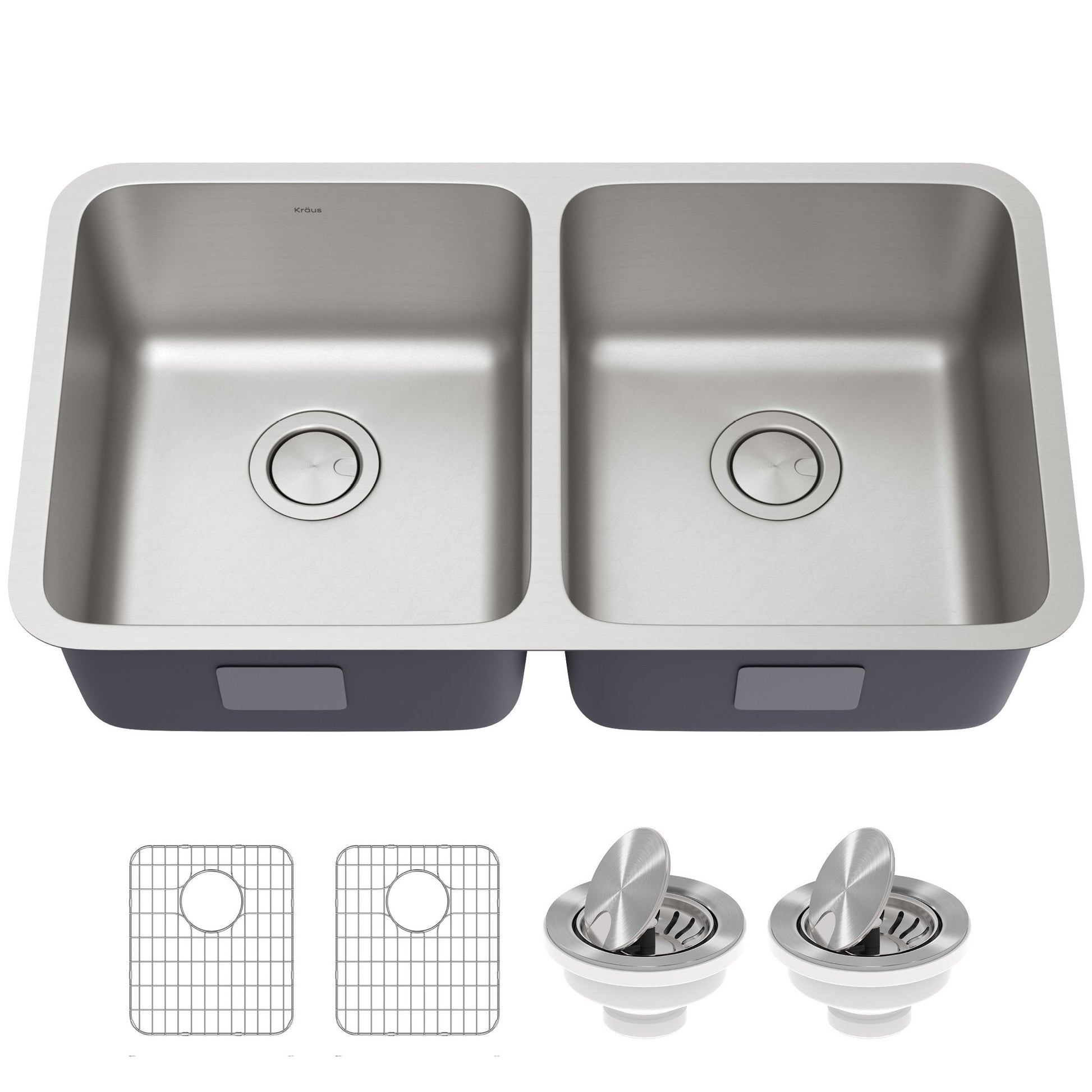 SINK KIT INCLUDES: Large double bowl undermount sink, protective bottom grid with soft rubber bumpers (x2), VersiDrain assembly with removable strainer and FlipCap (x2)