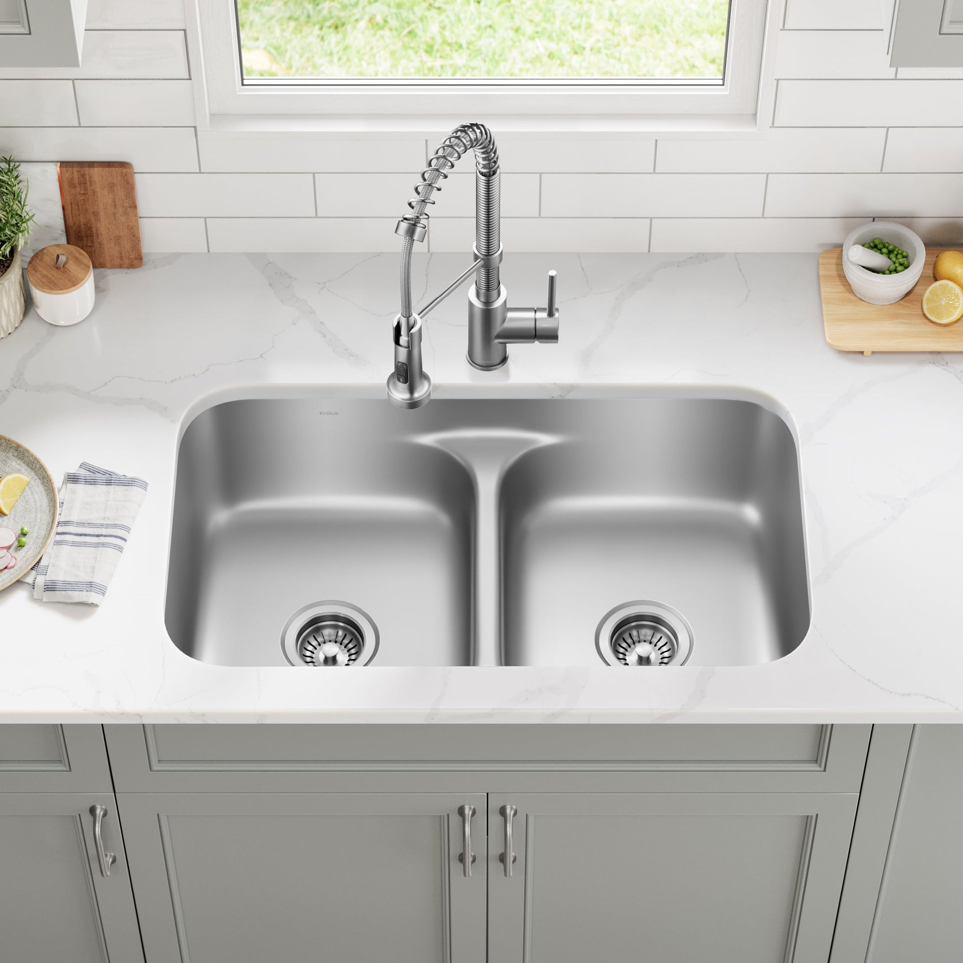 KIT INCLUDES: Kitchen sink, kitchen faucet, stainless steel bottom grid (x2), drain assembly with removable strainer (x2), mounting hardware, cutout template HEAVY-DUTY 18-GAUGE STEEL: Designed for lasting durability, high-performance 18-gauge stainless steel sink stands up to everyday use with resistance to corrosion, dents, and damage