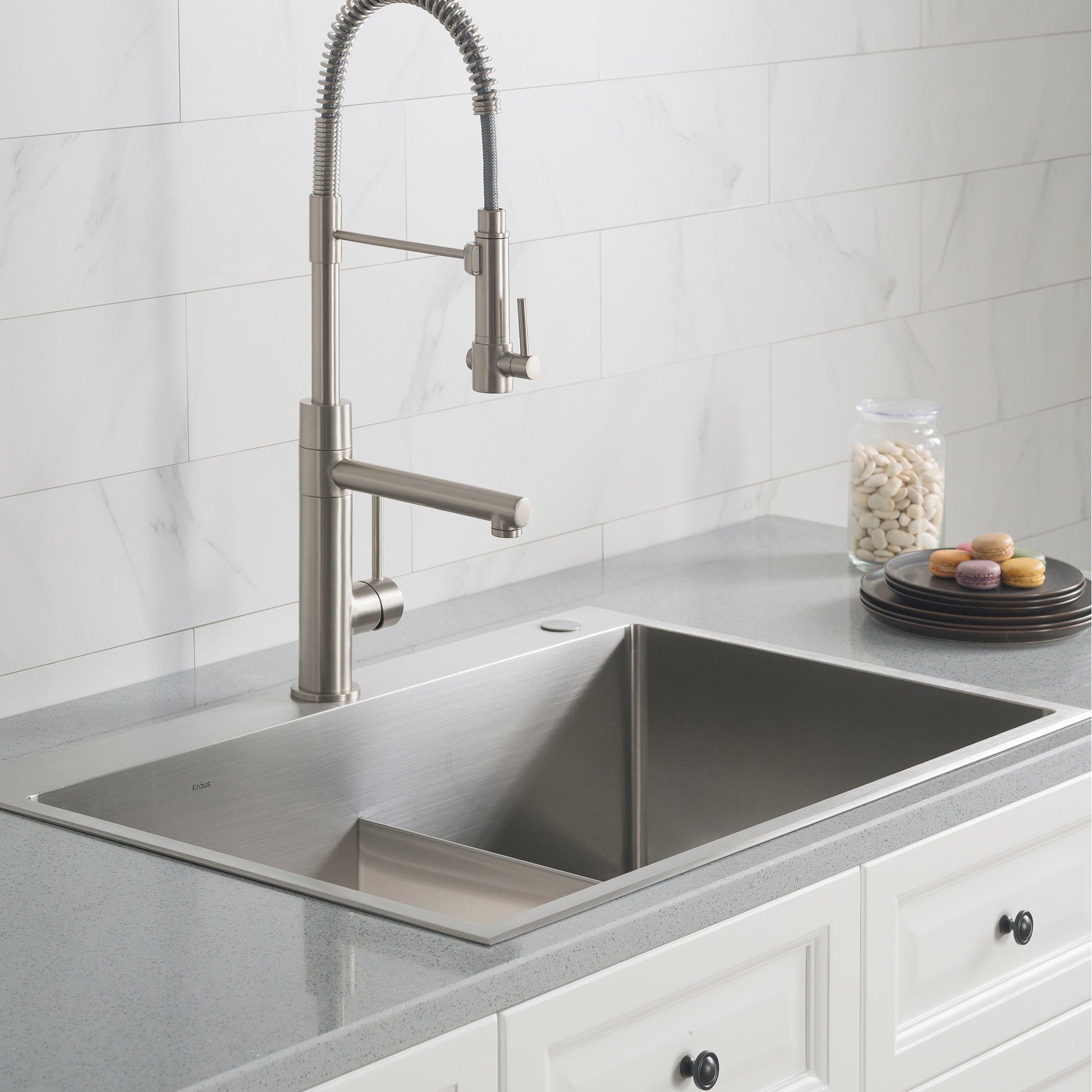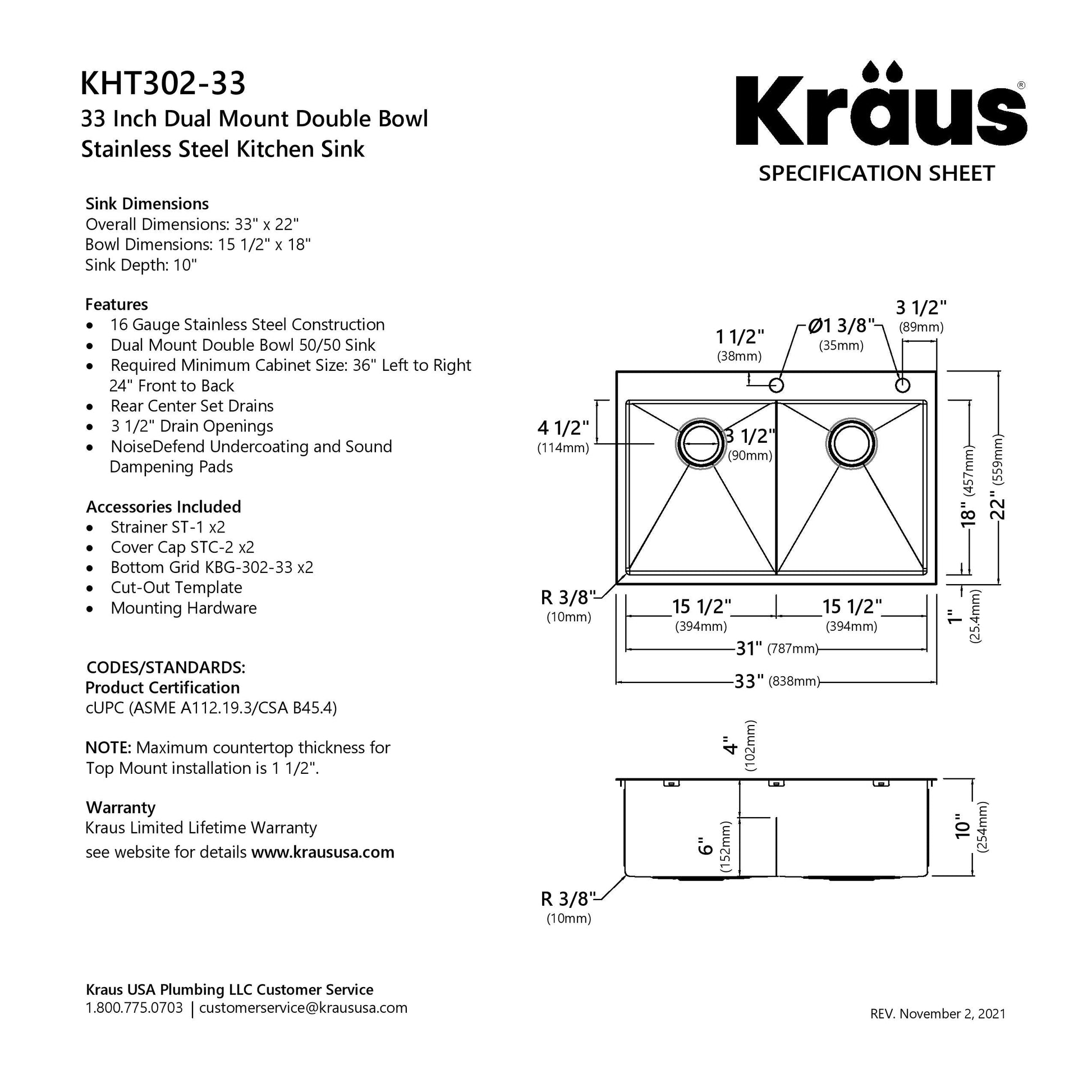 KITCHEN SET INCLUDES: Sink, bottom grid x2, drain assembly x2, removable drain cap x2, Kraus kitchen towel, mounting hardware, cutout template