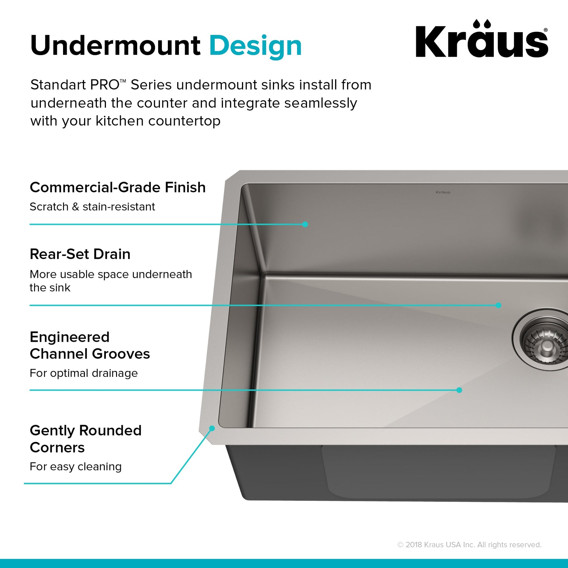 Known for outstanding quality and dependability, Standart PRO undermount sinks are designed with straight walls and tight-radius corners to create a contemporary look in any kitchen. Built to impress with rugged T304 construction, wear-resistant finish, and industry-best NoiseDefend soundproofing technology, this KRAUS sink is designed to efficiently handle the toughest messes. Undermount installation creates a seamless transition between sink and countertop for a beautifully finished look.