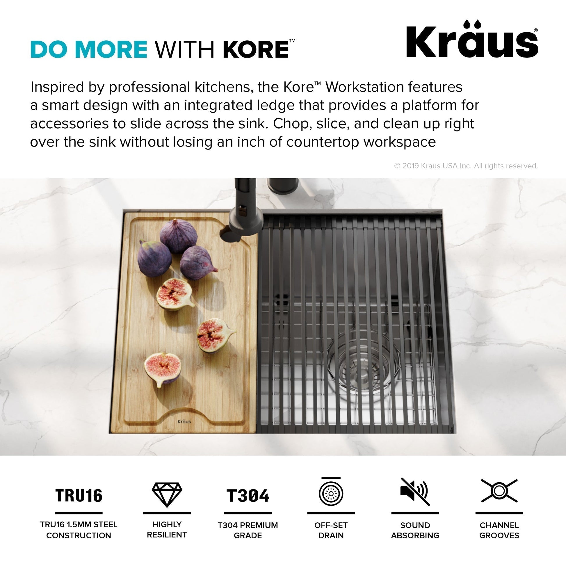 Do more with Kore - The ultimate sink for the modern home chef. Inspired by professional kitchens, the Kore Workstation Series instantly transforms your kitchen sink into a full-service prep station. Packed with premium accessories such as the multi-purpose dish drying rack and bamboo cutting board, the ultra-functional design of the integrated ledge system allows you to wash and dry, or chop and slice without losing an inch of counter space.Â
