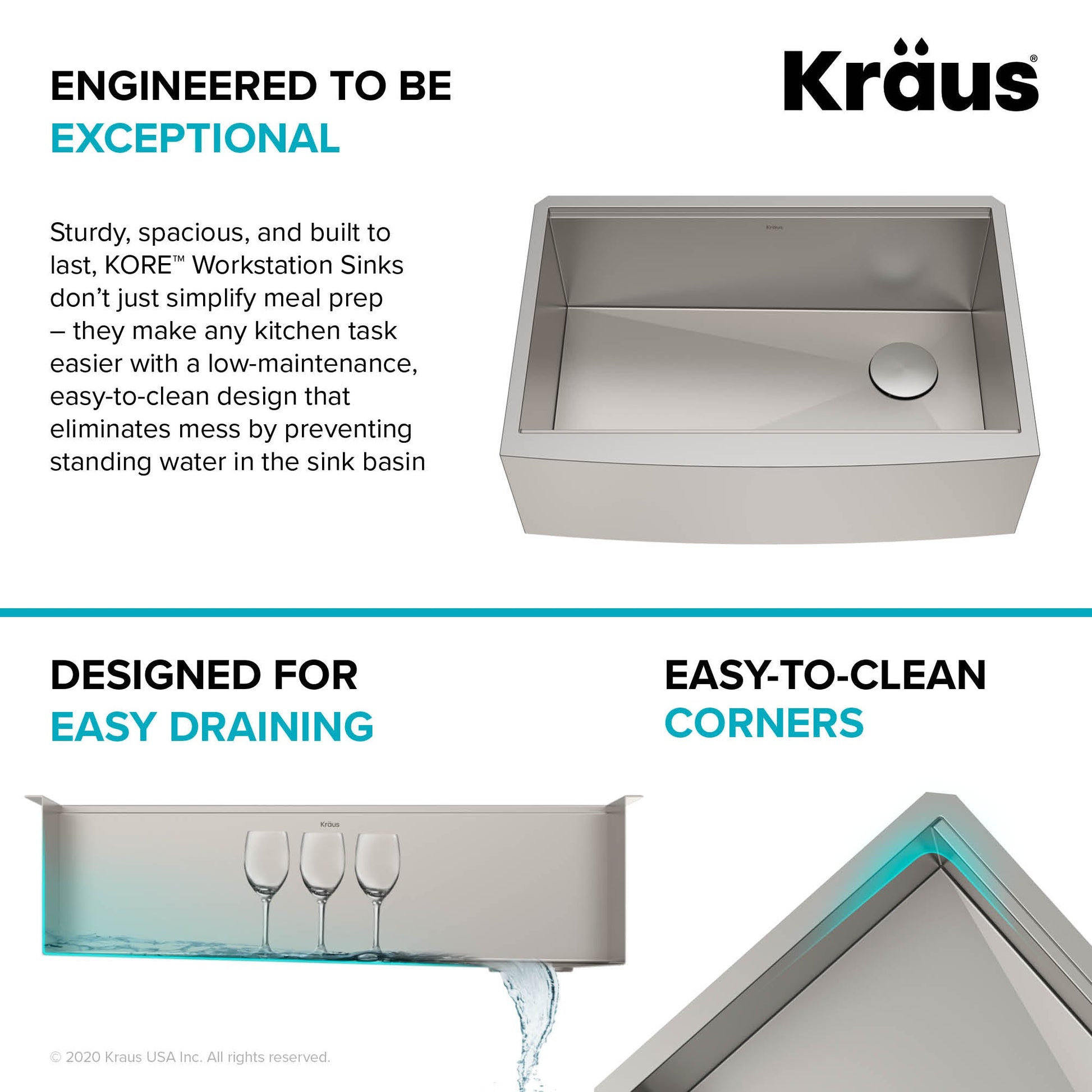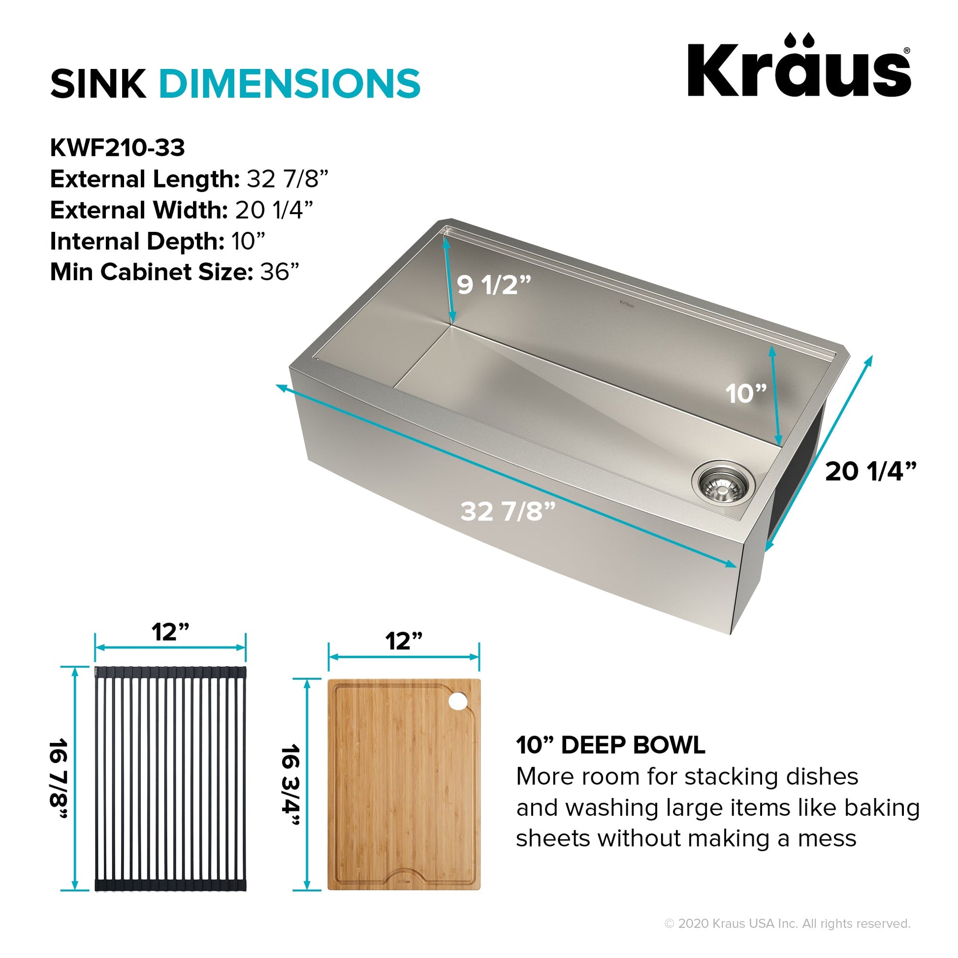 Featuring a traditionally-inspired curved apron front, this deep-capacity farmhouse sink combines practical convenience with charming country style. A kitchen fixture that will endure in both beauty and performance, the farmhouse sink creates a distinctive focal point that instantly upgrades any décor. Packed with premium accessories such as the multi-purpose dish drying rack and bamboo cutting board, the integrated ledge system allows you to wash and dry, or chop and slice without losing an inch of counter space. Workstation Sink with integrated ledge that allows you to slide custom accessories across the sink to streamline meal prep and cleanup