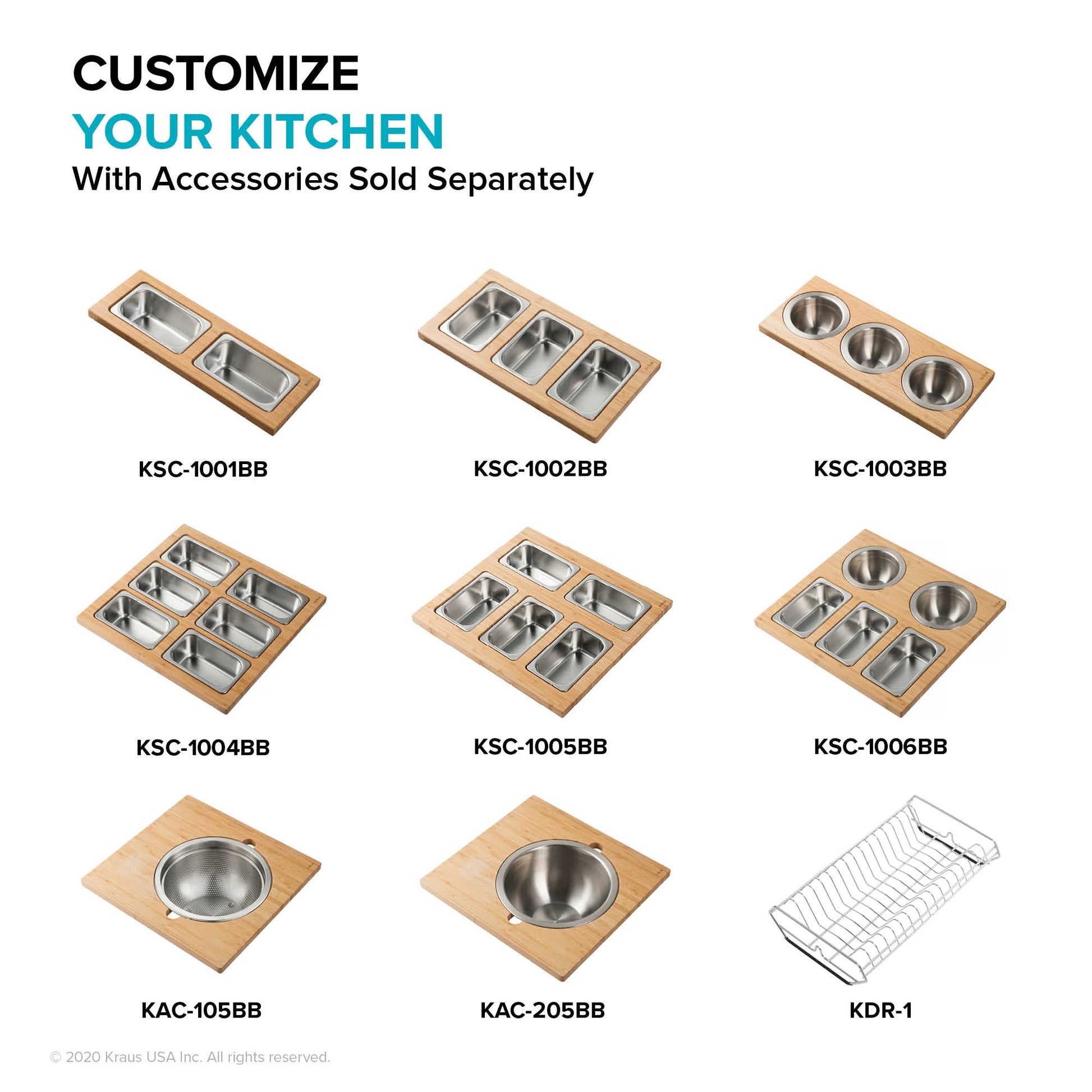 Includes premium accessories: bamboo cutting board, roll-up dish rack, bottom grid, and drain assembly