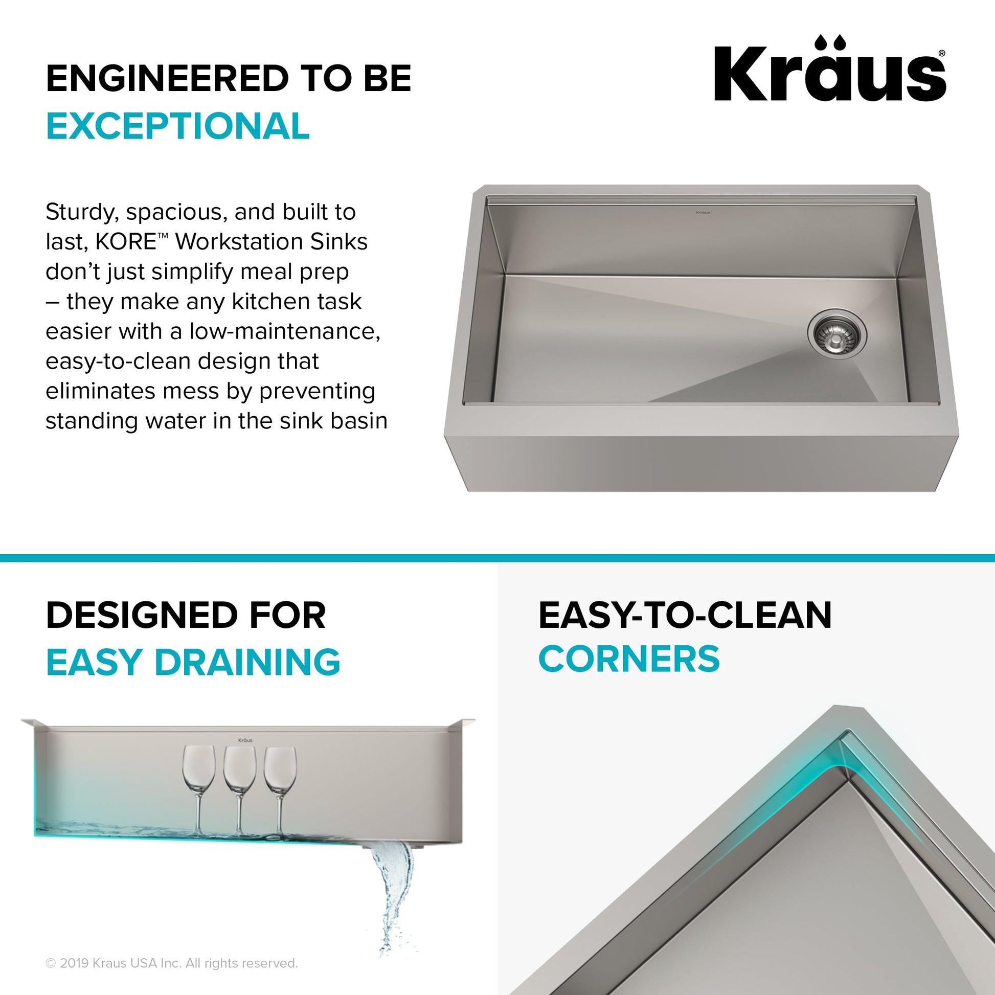 The ultimate sink for the modern home chef. Inspired by professional kitchens, the Kore Workstation Series instantly transforms your kitchen sink into a full-service prep station. With an impressive flat apron front design, this farmhouse sink creates a focal point with a distinctive modern look. Packed with premium accessories such as the multi-purpose dish drying rack and bamboo cutting board, the integrated ledge system allows you to wash and dry, or chop and slice without losing an inch of counter space. Made with real 16-gauge stainless steel, this kitchen workhorse is one of the toughest and most durable sinks on the market. ccessories across the sink to streamline meal prep and cleanup
