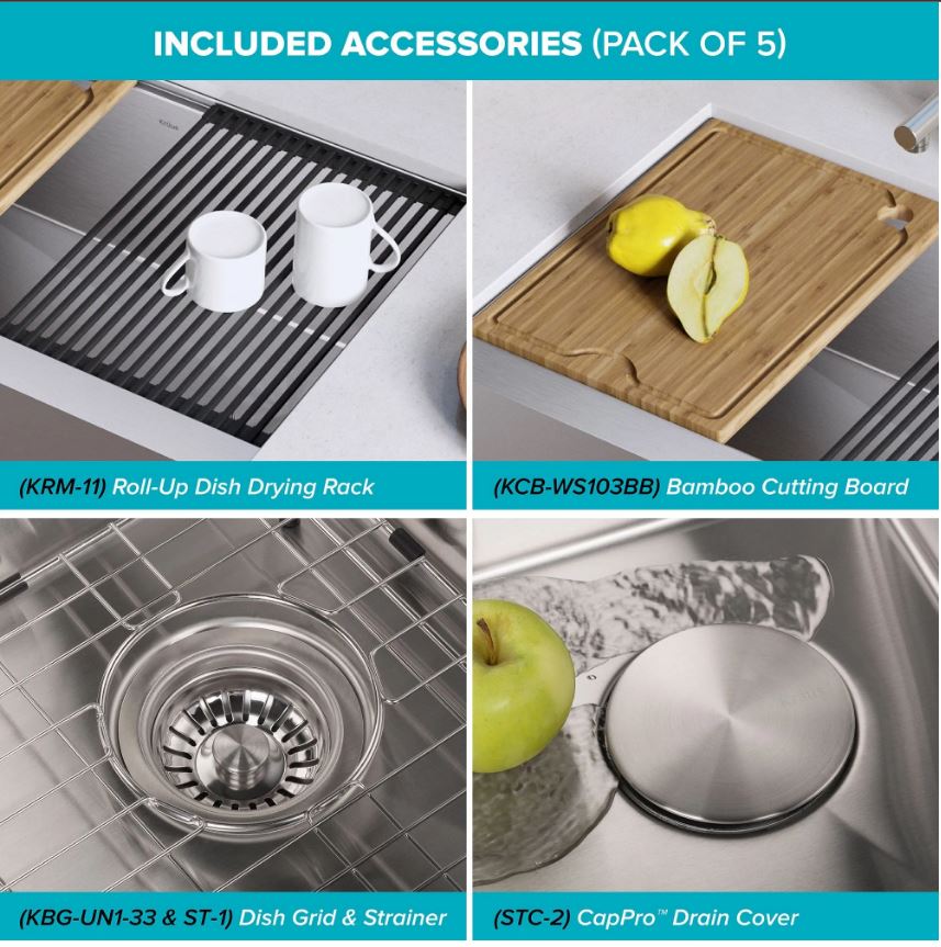 A: Yes, includes a bamboo cutting board, roll-up drying rack, drain assembly, and stainless steel bottom grid.
