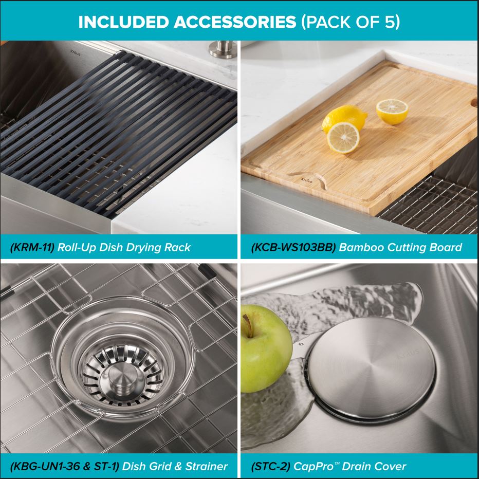5-Piece Chef's Kit: To make full use of your Workstation Sink the package includes a solid bamboo cutting board and a multi-purpose roll-up dish drying rack that allows you to rinse produce and drip-dry dishes right over the sink