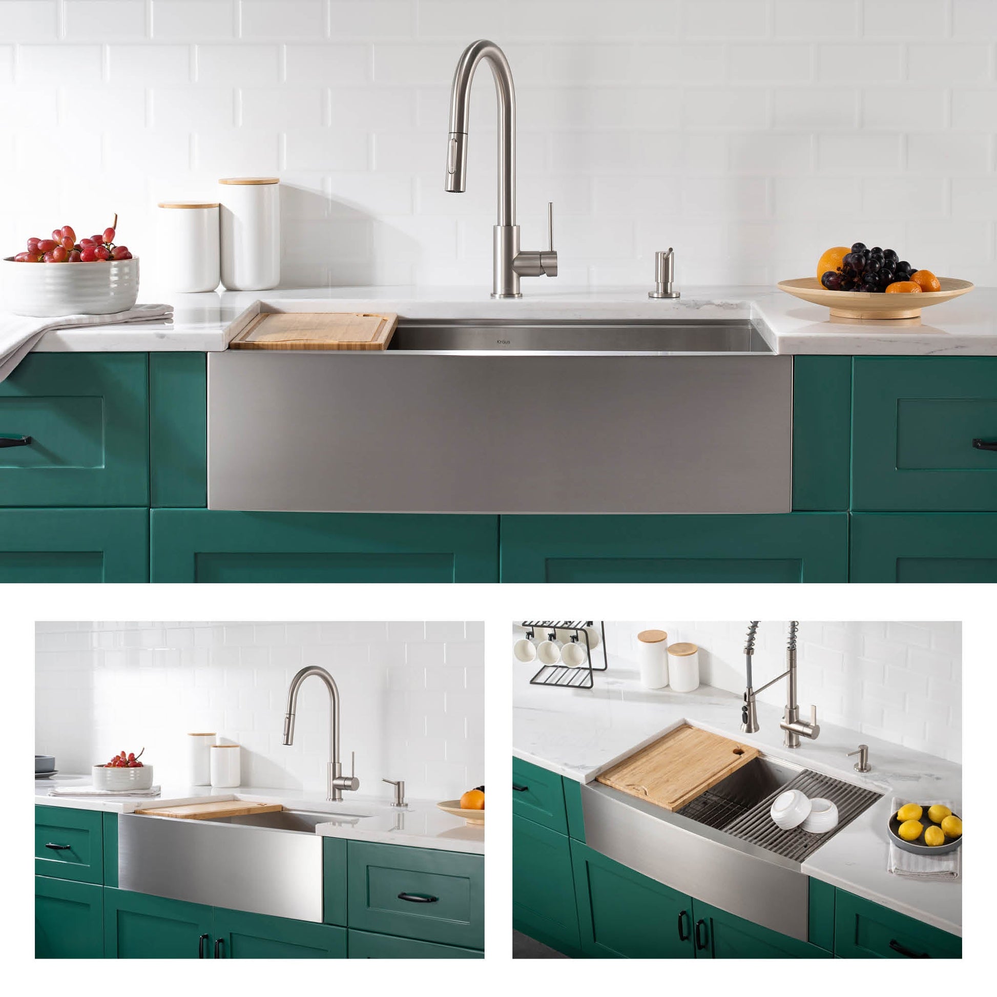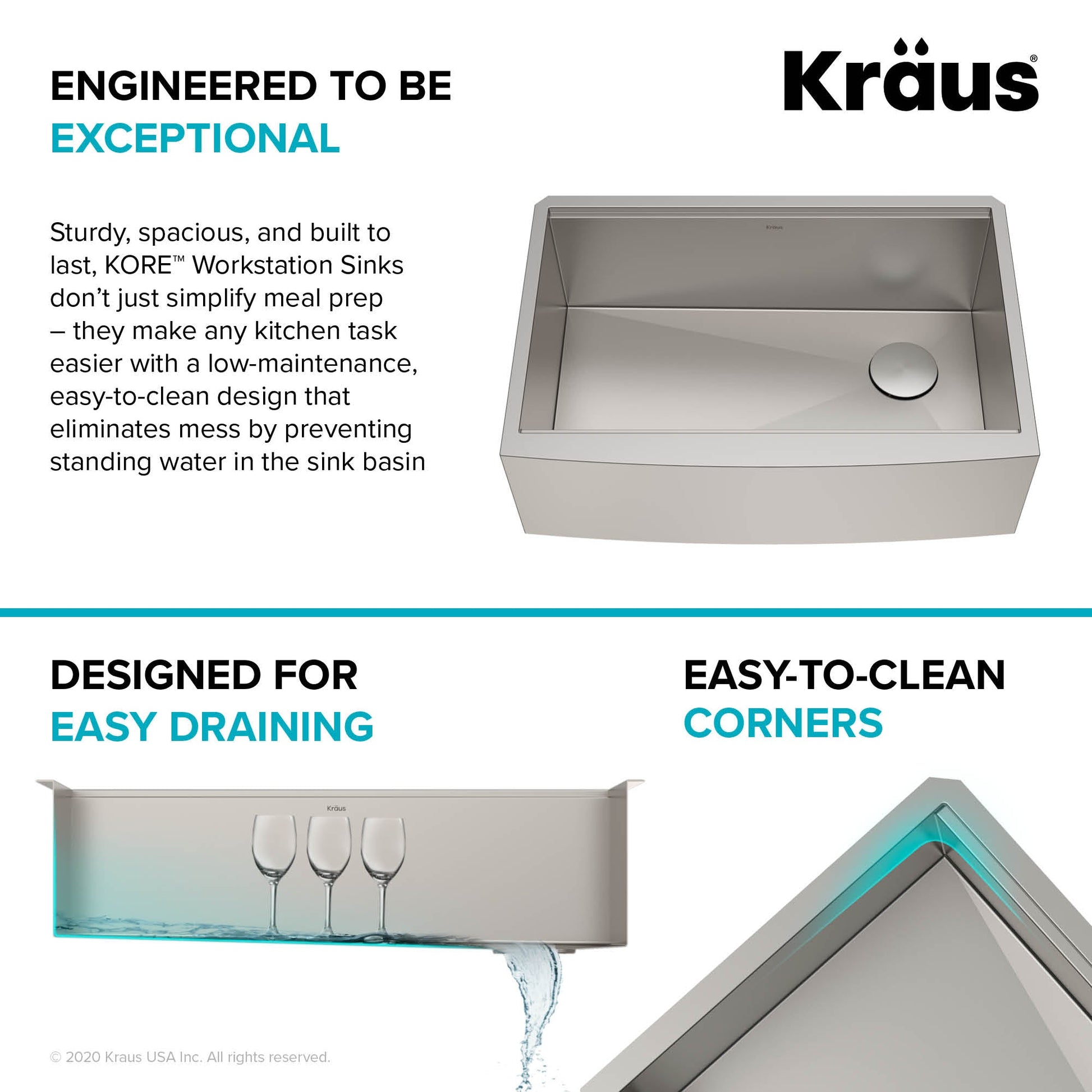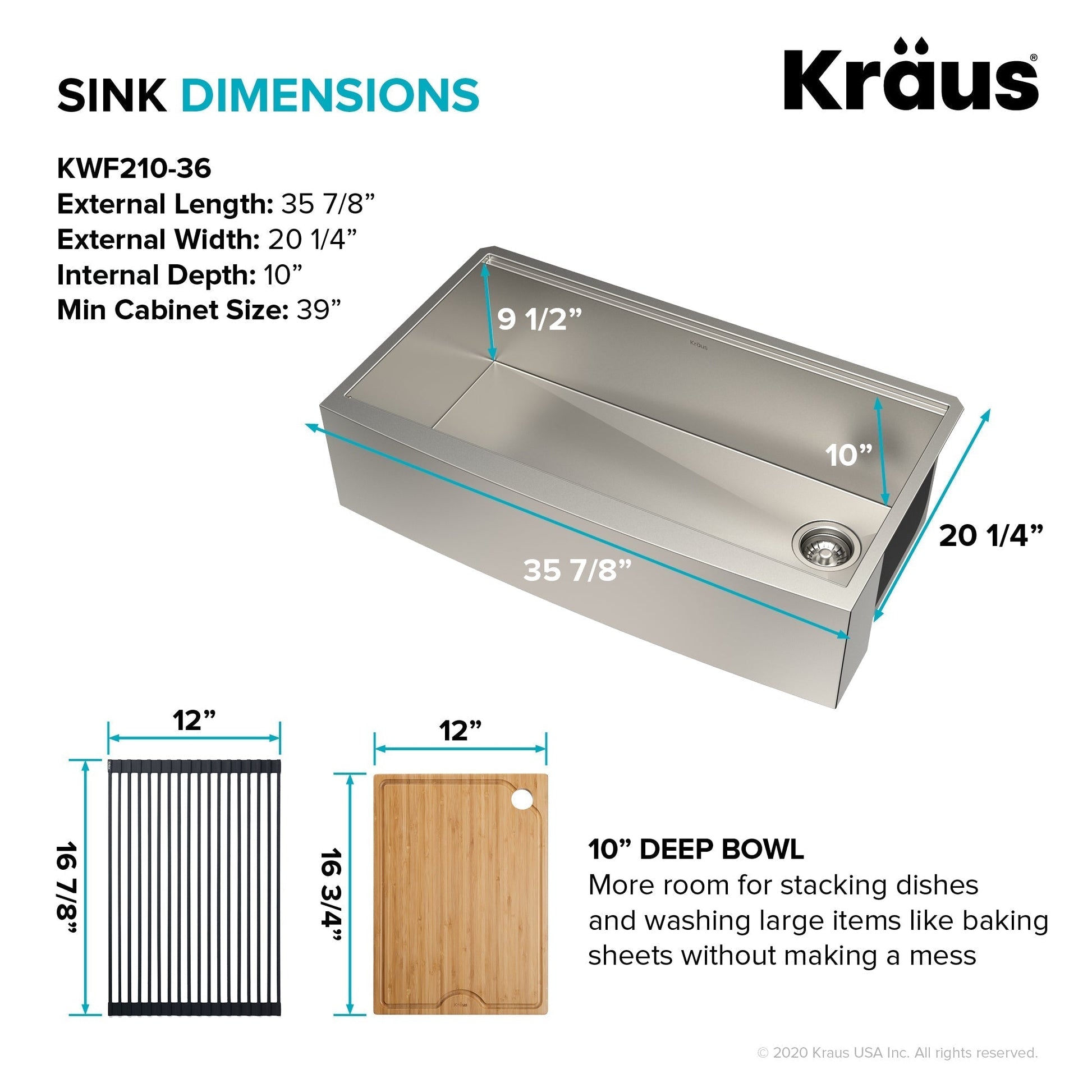 KRAUS Kore 36-inch 16 Gauge Farmhouse Workstation Kitchen Sink. This Apron Front Kitchen Sink has an enormous basin measuring at 34" x 16" with 10" depth at the Drain.