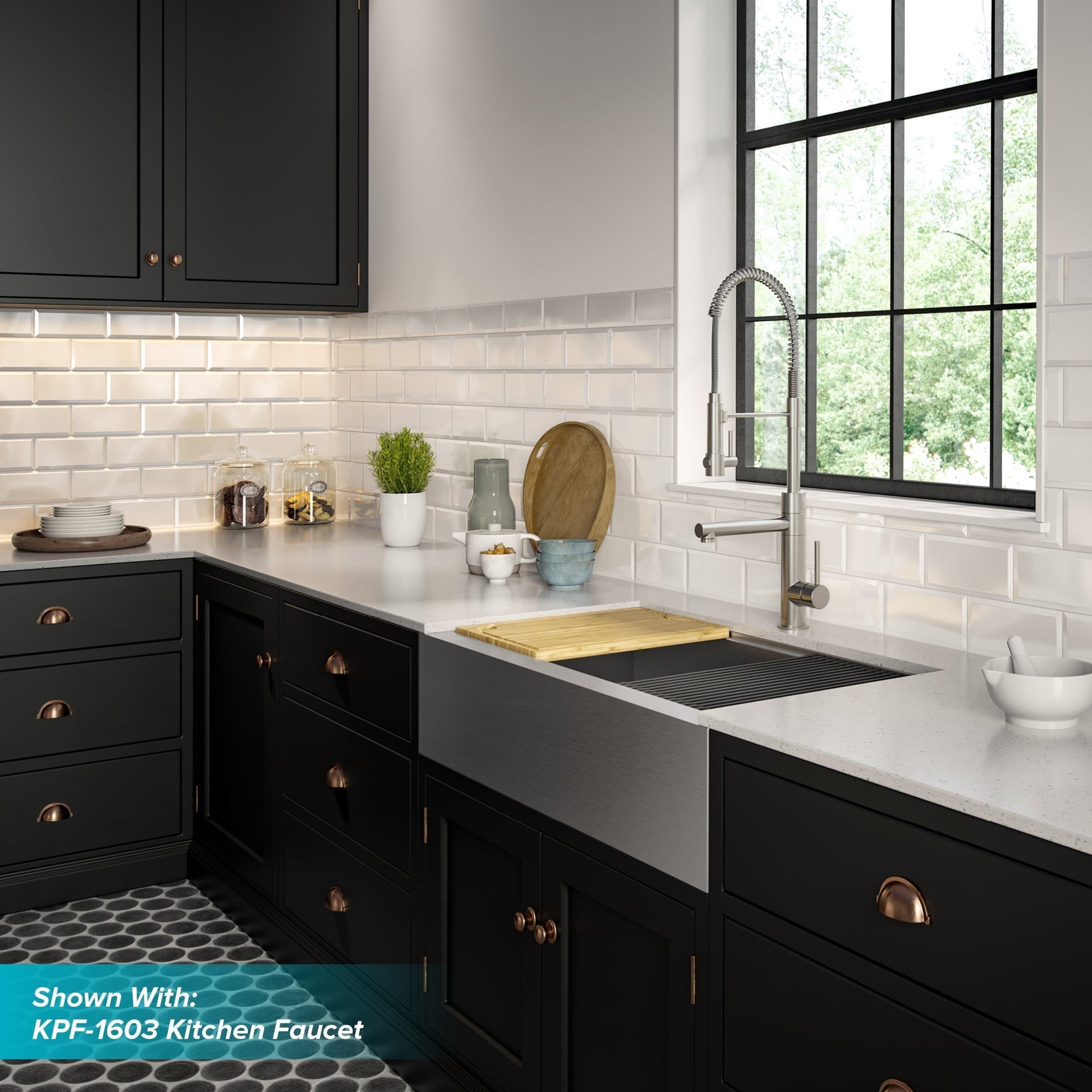 Do more with Kore - The ultimate sink for the modern home chef. Inspired by professional kitchens, the Kore Workstation Series instantly transforms your kitchen sink into a full-service prep station. With an impressive flat apron front design, this farmhouse sink creates a focal point with a distinctive modern look. Packed with premium accessories such as the multi-purpose dish drying rack and bamboo cutting board, the integrated ledge system allows you to wash and dry, or chop and slice without losing an inch of counter space. Made with real 16-gauge stainless steel, this kitchen workhorse is one of the toughest and most durable sinks on the market. The advanced modern look and culinary-inspired design is an instant upgrade to any home kitchen. Take the functionality of your kitchen sink to a whole new level with the Kore Workstation Series and experience the KRAUS difference