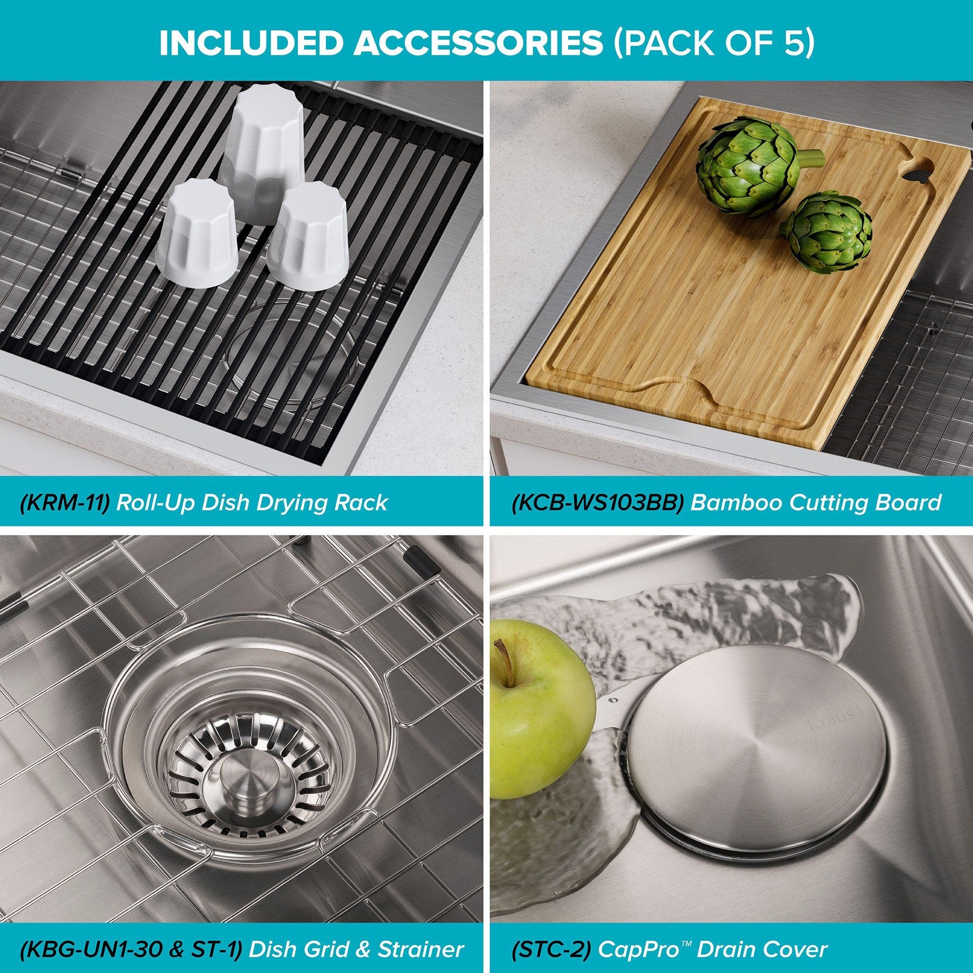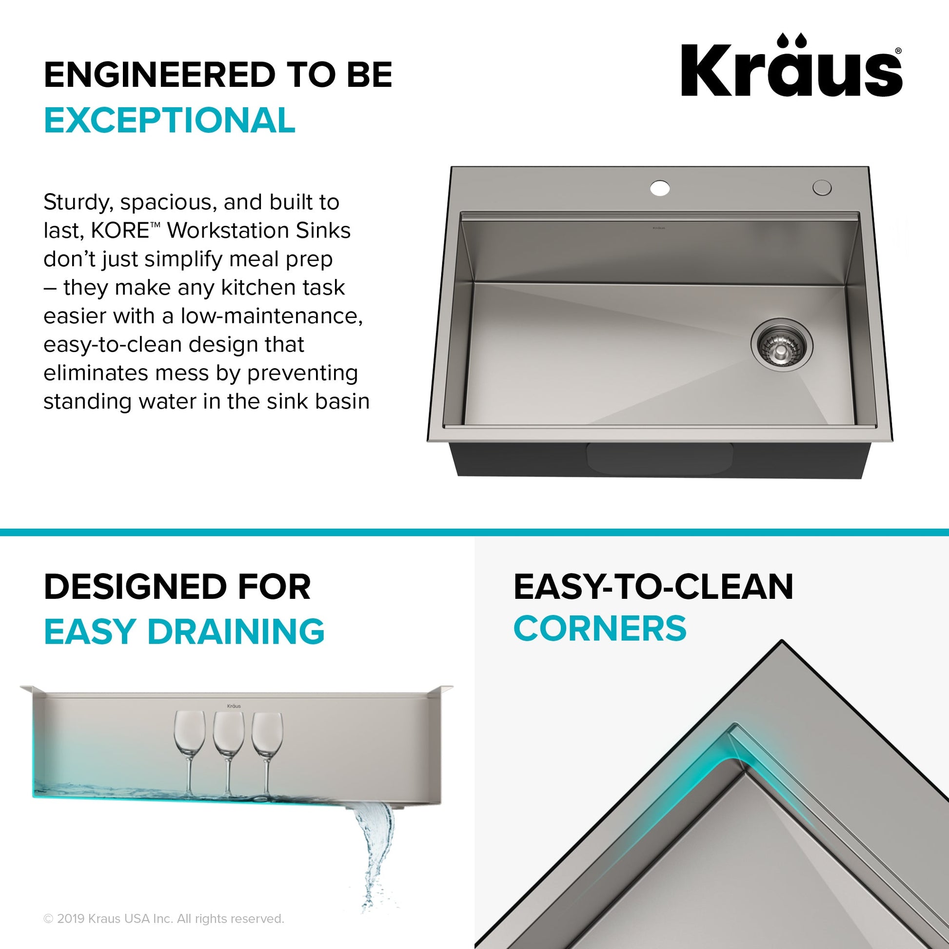 Cook, serve, and entertain in style with KRAUS Kore Workstation Sinks. Engineered with an integrated ledge to support custom sliding accessories, this sink creates a multifunctional workspace to streamline all your kitchen tasks from meal prep to cleanup. The kit includes a heavy-duty cutting board and roll-up dish rack that allow you to work right over the sink without losing space on the kitchen counter. Kore sinks are made with KRAUS TRU16 the thickest 16-gauge stainless steel for maximum durability. Ideal for retrofitting into an existing countertop cutout, the versatile dual-mount design installs as an undermount or drop-in with any type of kitchen counter material. The extra-thick 4mm mounting deck sits flat against the countertop for a perfectly finished look, with two pre-drilled holes for easy installation of a kitchen faucet and soap dispenser. The high-capacity single bowl sink creates an uninterrupted working surface with ample space for large cookware and stacks of dishes. Thick NoiseDefend sound dampening pads absorb noise and vibration for an ultra-quiet experience. Wear-resistant finish is easy to clean and not prone to corrosion, while rounded corners on the sink bottom reduce buildup over time. Channel grooves and a sloped bottom improve drainage, with a rear off-set drain that adds storage space underneath the sink. The installation-ready sink comes with a protective stainless steel bottom grid and drain assembly with matching cover for a clean look.