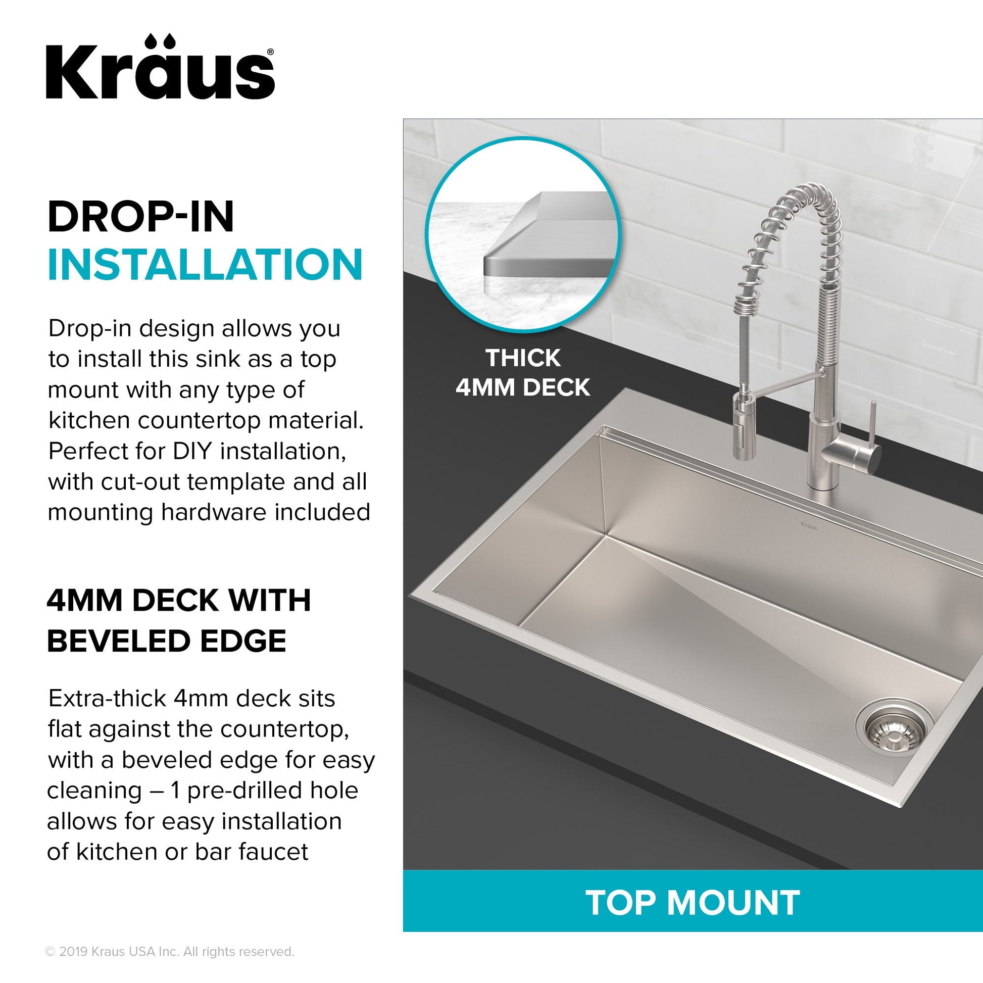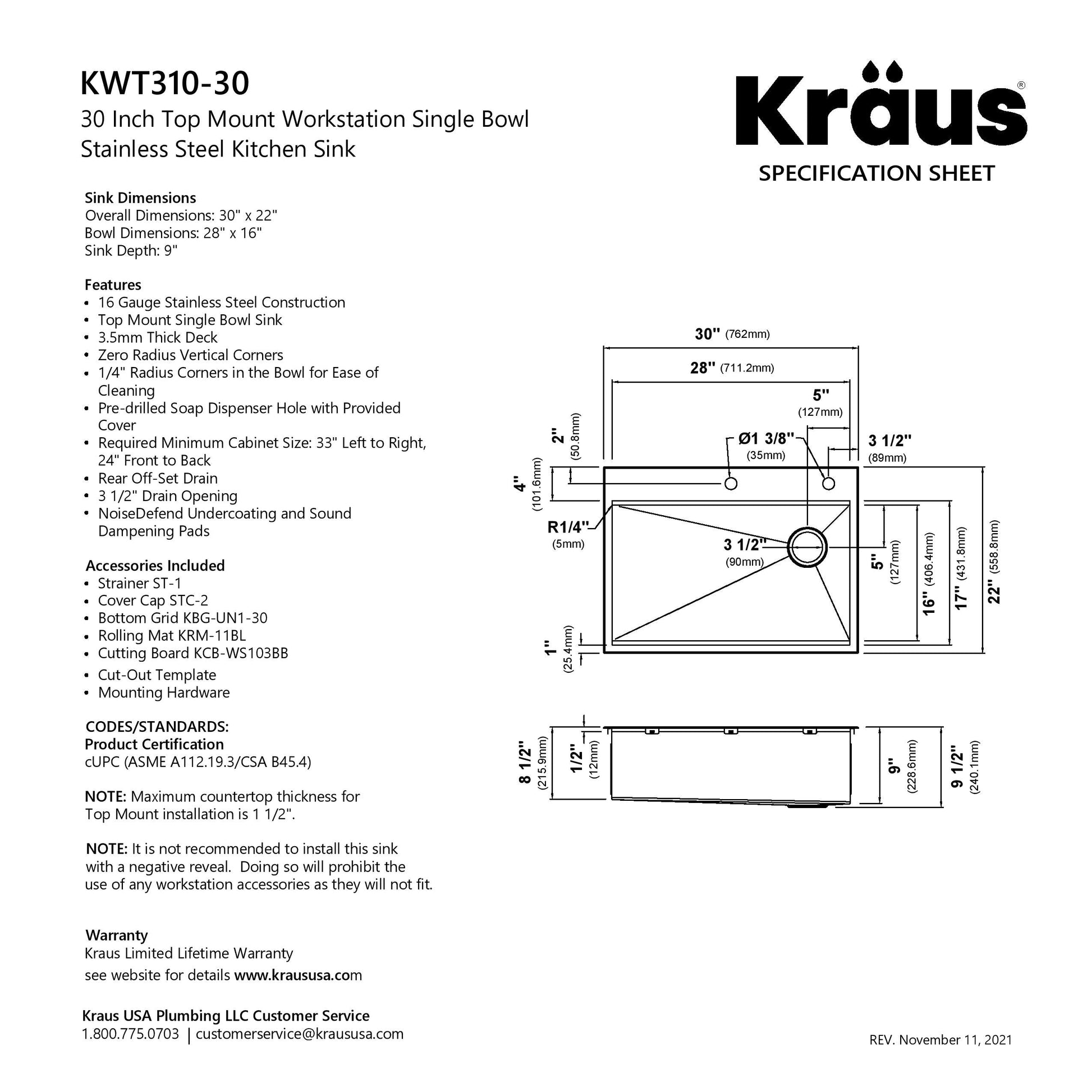 Note from DirectSinks about the KWT310-30 - We know Sinks. We also know that a 30" Top Mount Sink is a rare find. Great News: If you have a 33" Cabinet, this sink has you covered. Not bad considering It's a Workstation Sink from Kraus, made of 16 Gauge Stainless Steel, and includes accessories! Although we show this sink as a Top Mount sink, this sink can also be undermounted according to Kraus. Either way, this is a great Workstation Sink for a 33" Cabinet.