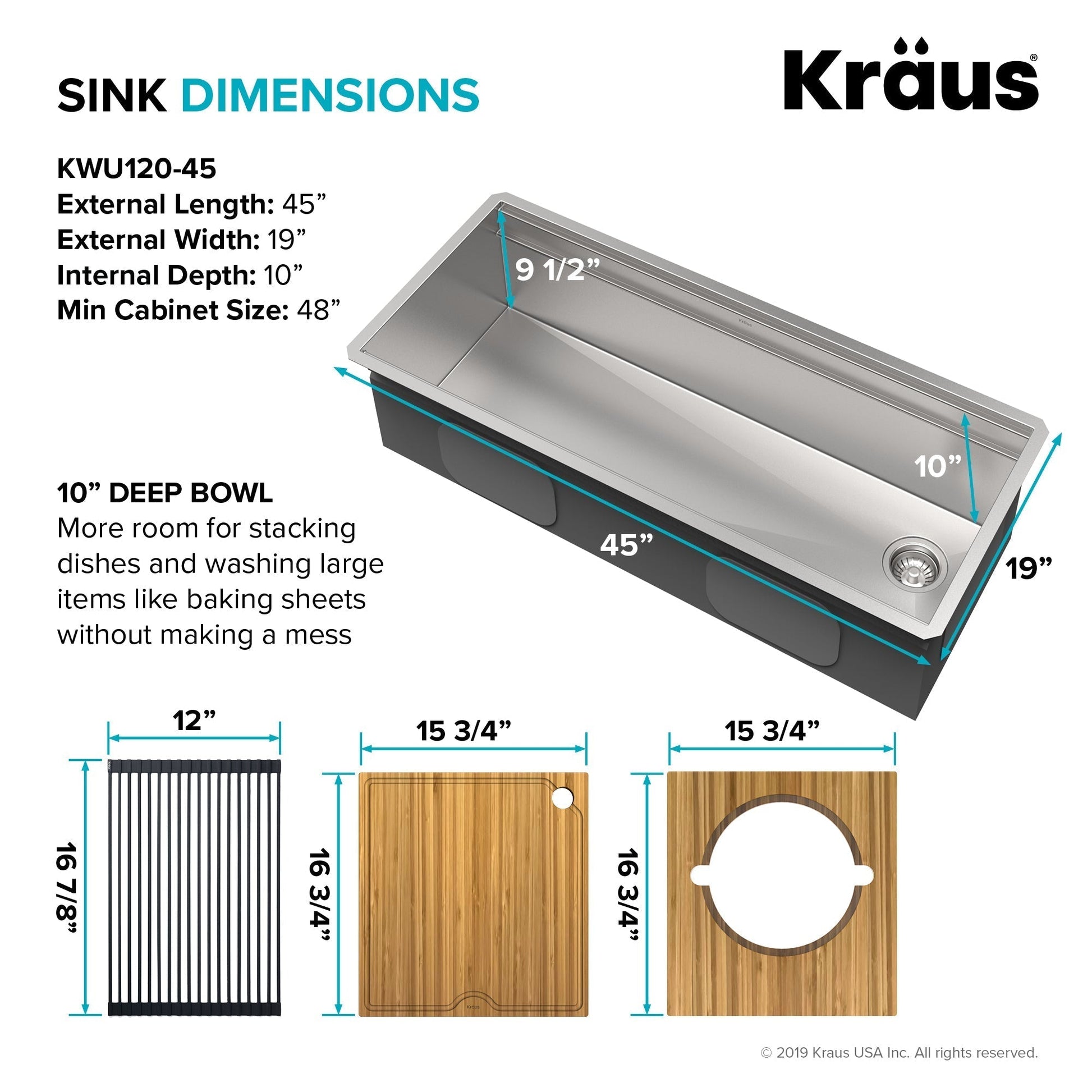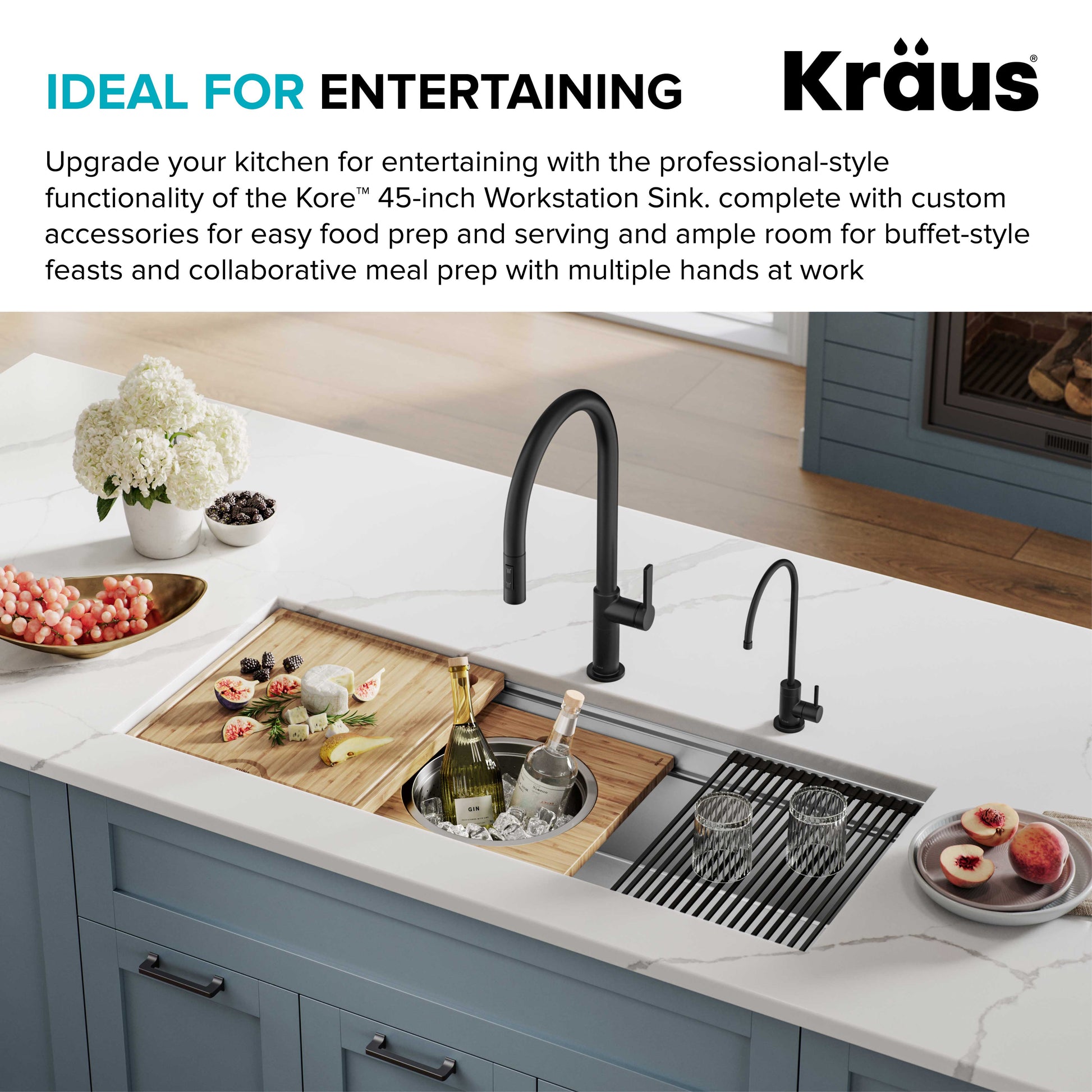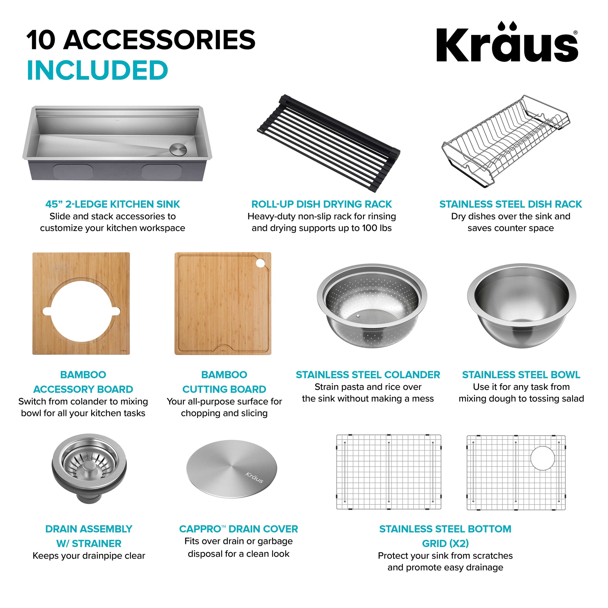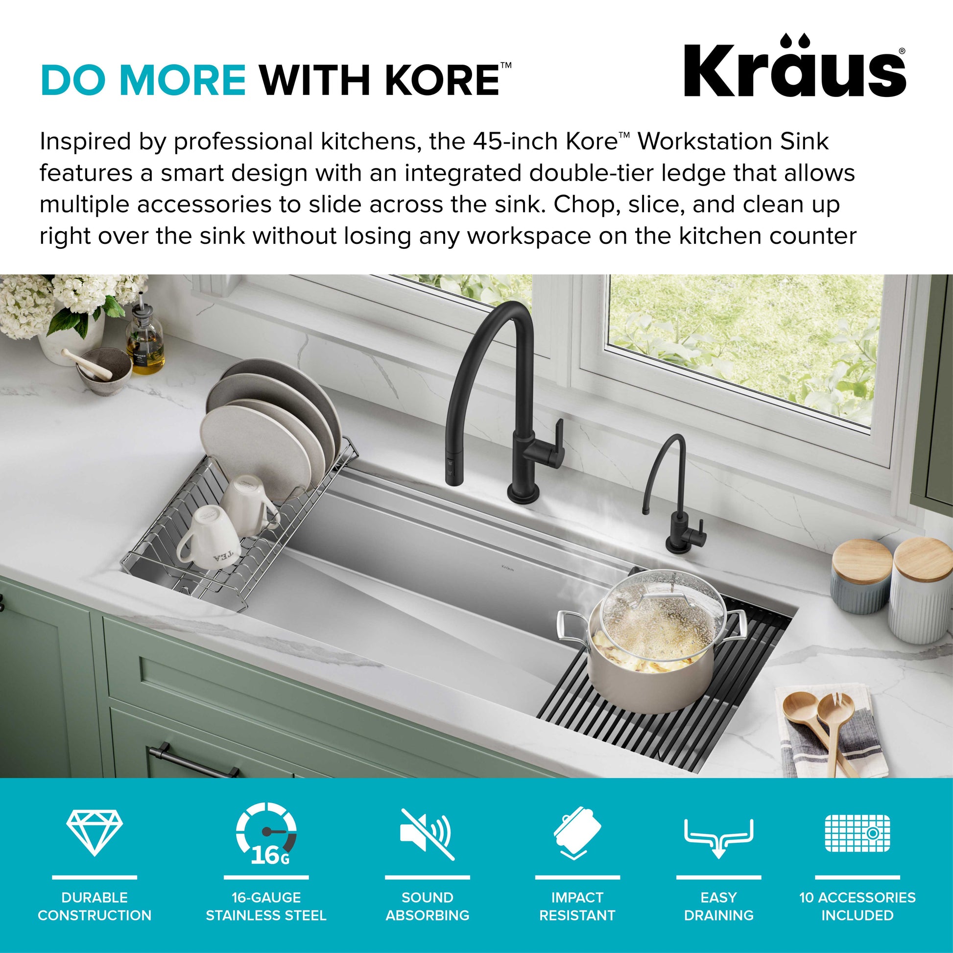 The impressive 45-inch Kore Workstation sink instantly transforms any kitchen into a full-service prep station. Equipped with a premium 10-piece chef's kit, the ultra-functional design features a 2-tier track system that allows you to slide accessories across the sink on two levels, maximizing functionality and creating a seamless workflow for everything from prepping to entertaining and cleanup. With generous dimensions, and a smart design that adds valuable counter space by allowing you to work right over the sink, the 45-inch Kore is perfect for a kitchen of any size. The chef's kit includes a serving board with bowl and colander, roll-up dish drying rack, and bamboo cutting board, allowing you to wash, chop, slice, and serve all in one place. Made with real 16-gauge stainless steel, this kitchen workhorse is one of the toughest and most durable sinks on the market. The advanced modern look and culinary-inspired design is an instant upgrade to any home kitchen. Take the functionality of your kitchen sink to a whole new level with the Kore Workstation Series, and experience the KRAUS difference.