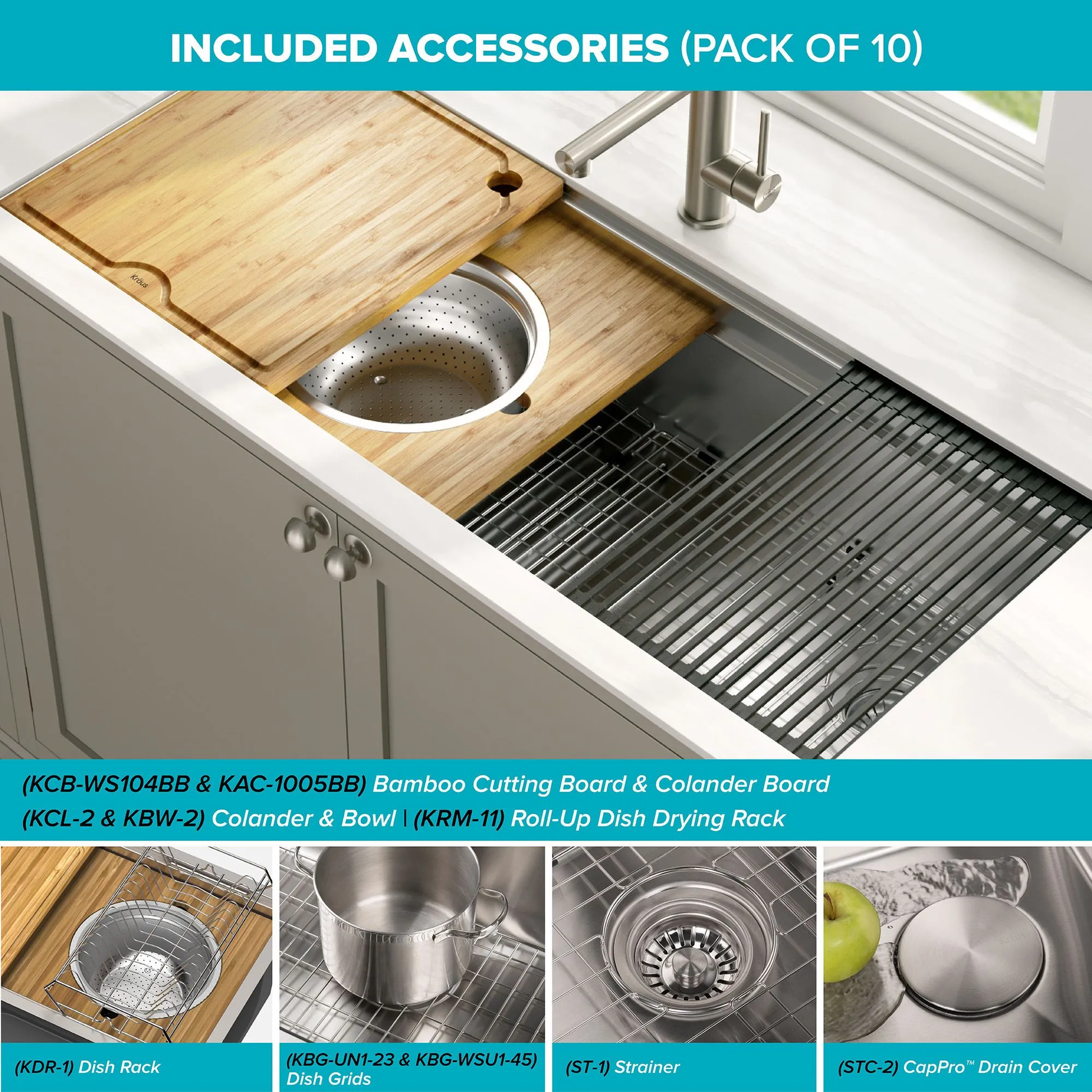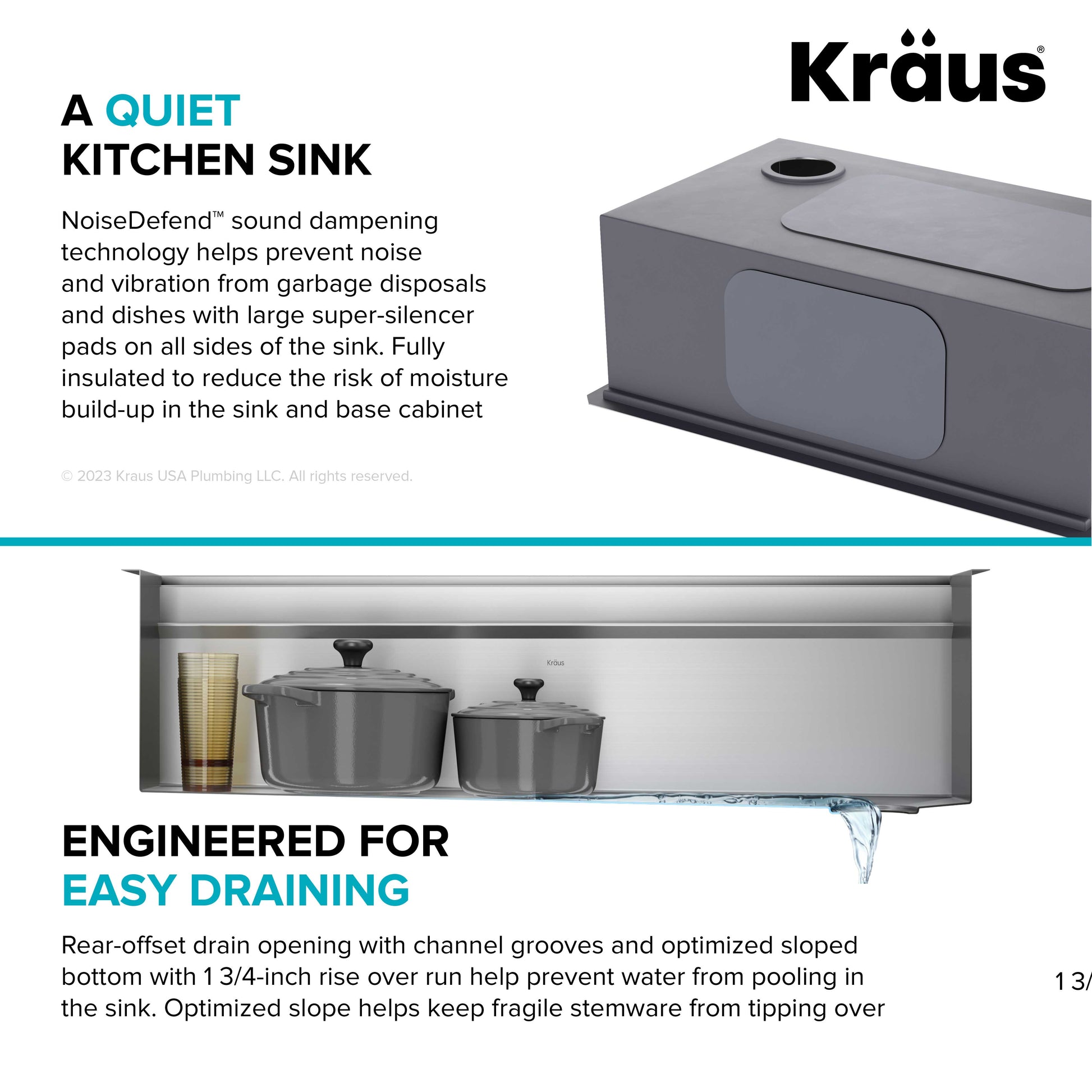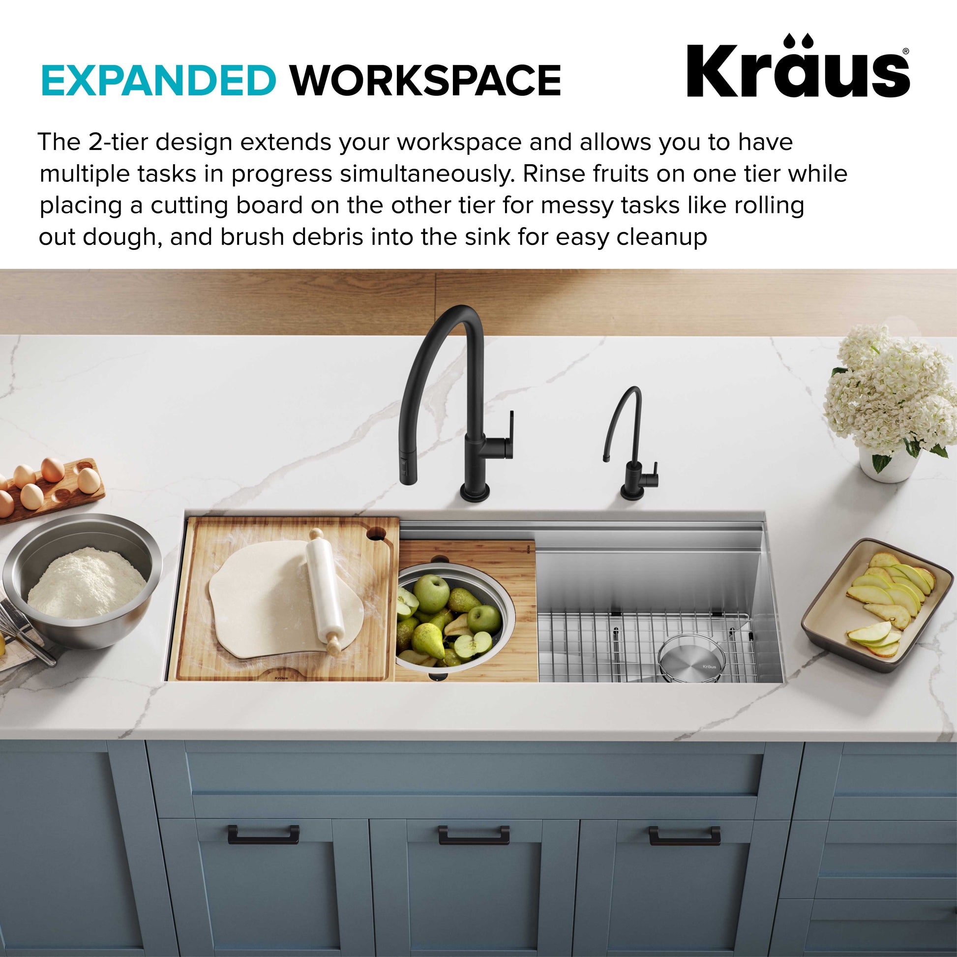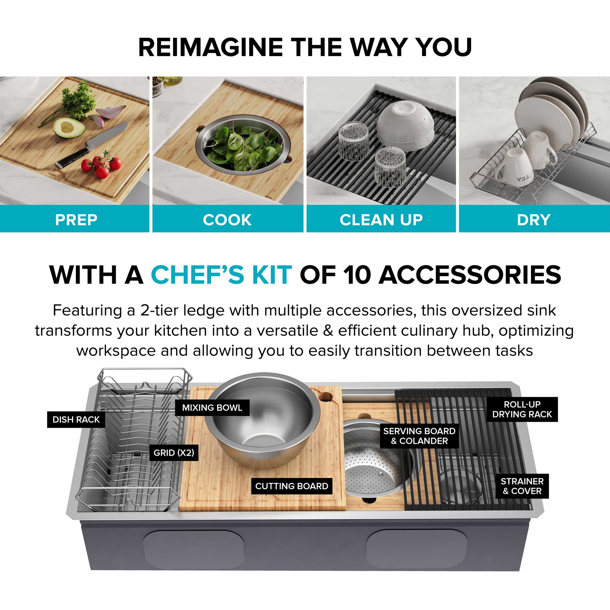 The impressive 45-inch Kore Workstation sink instantly transforms any kitchen into a full-service prep station. Equipped with a premium 10-piece chef's kit, the ultra-functional design features a 2-tier track system that allows you to slide accessories across the sink on two levels, maximizing functionality and creating a seamless workflow for everything from prepping to entertaining and cleanup. With generous dimensions, and a smart design that adds valuable counter space by allowing you to work right over the sink, the 45-inch Kore is perfect for a kitchen of any size. The chef's kit includes a serving board with bowl and colander, roll-up dish drying rack, and bamboo cutting board, allowing you to wash, chop, slice, and serve all in one place. Made with real 16-gauge stainless steel, this kitchen workhorse is one of the toughest and most durable sinks on the market. The advanced modern look and culinary-inspired design is an instant upgrade to any home kitchen. Take the functionality of your kitchen sink to a whole new level with the Kore Workstation Series, and experience the KRAUS difference.