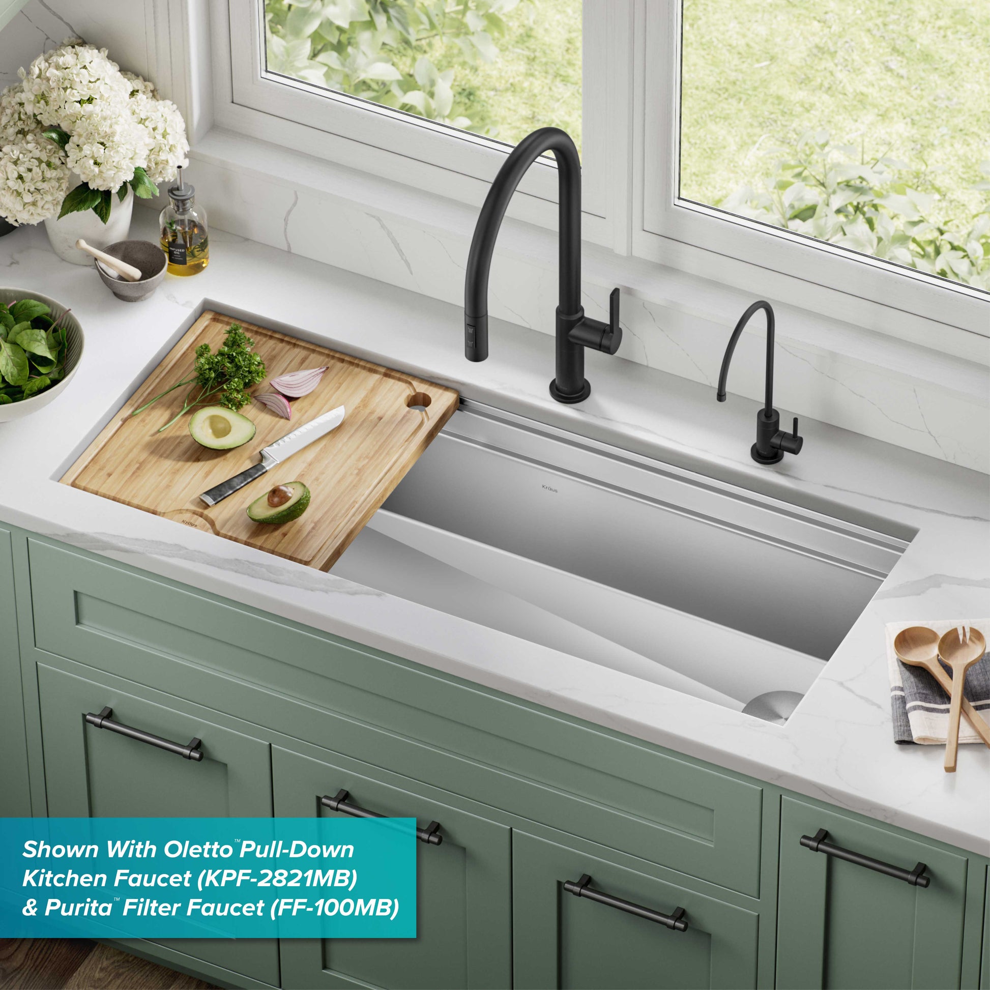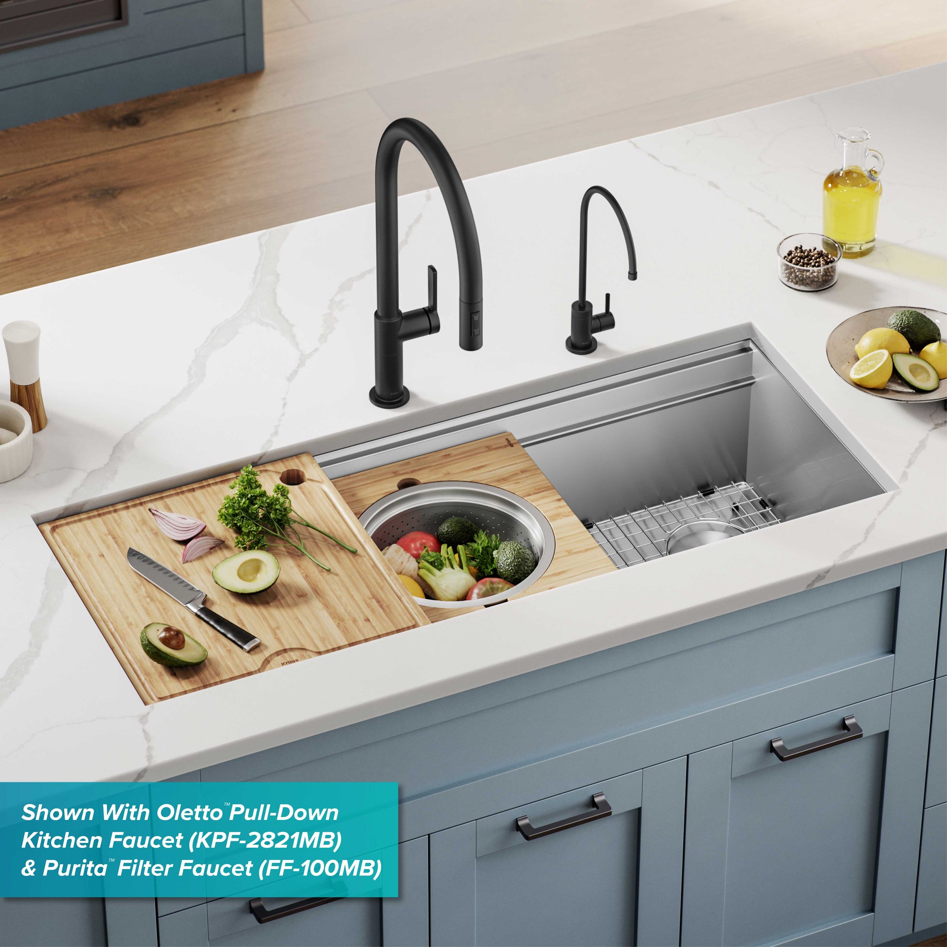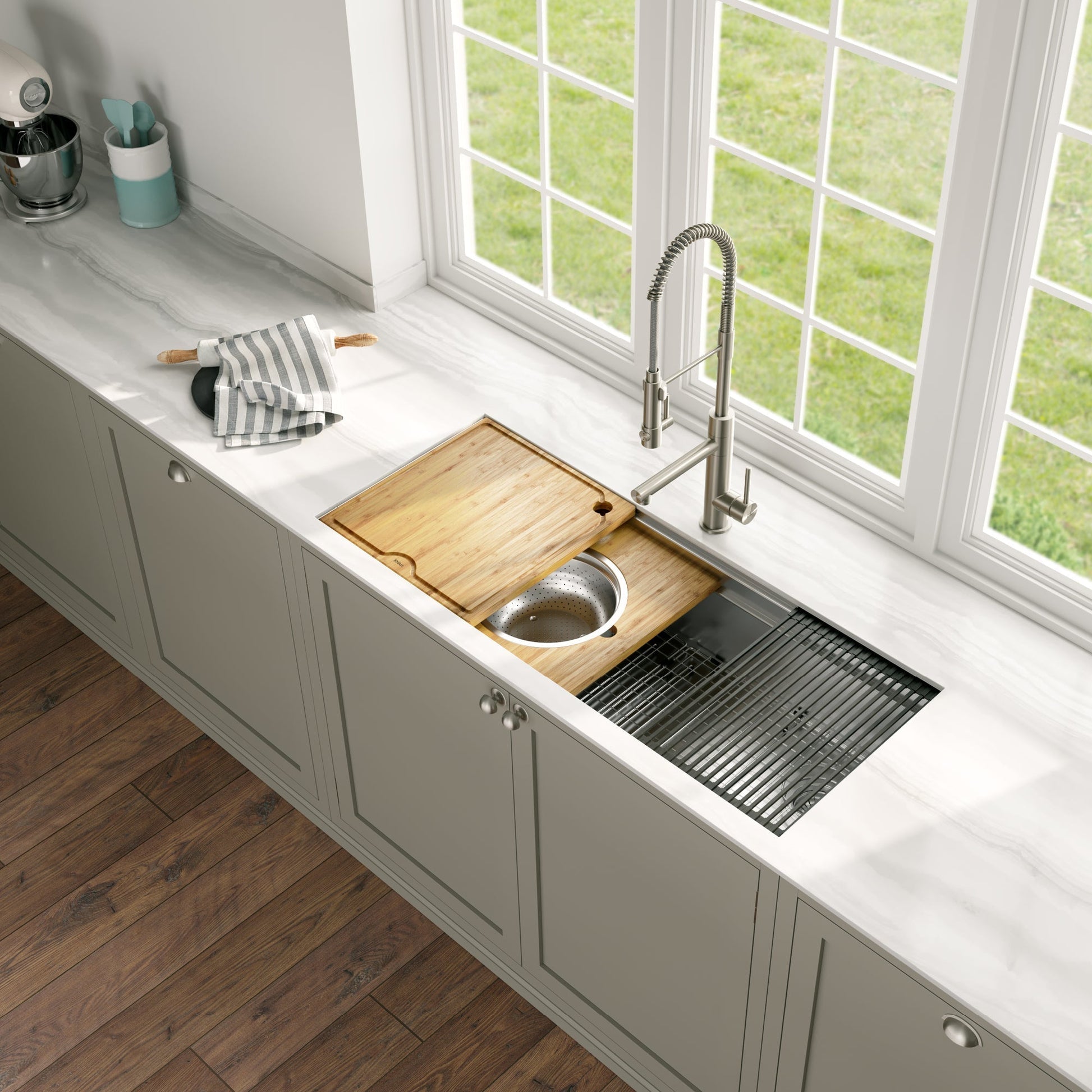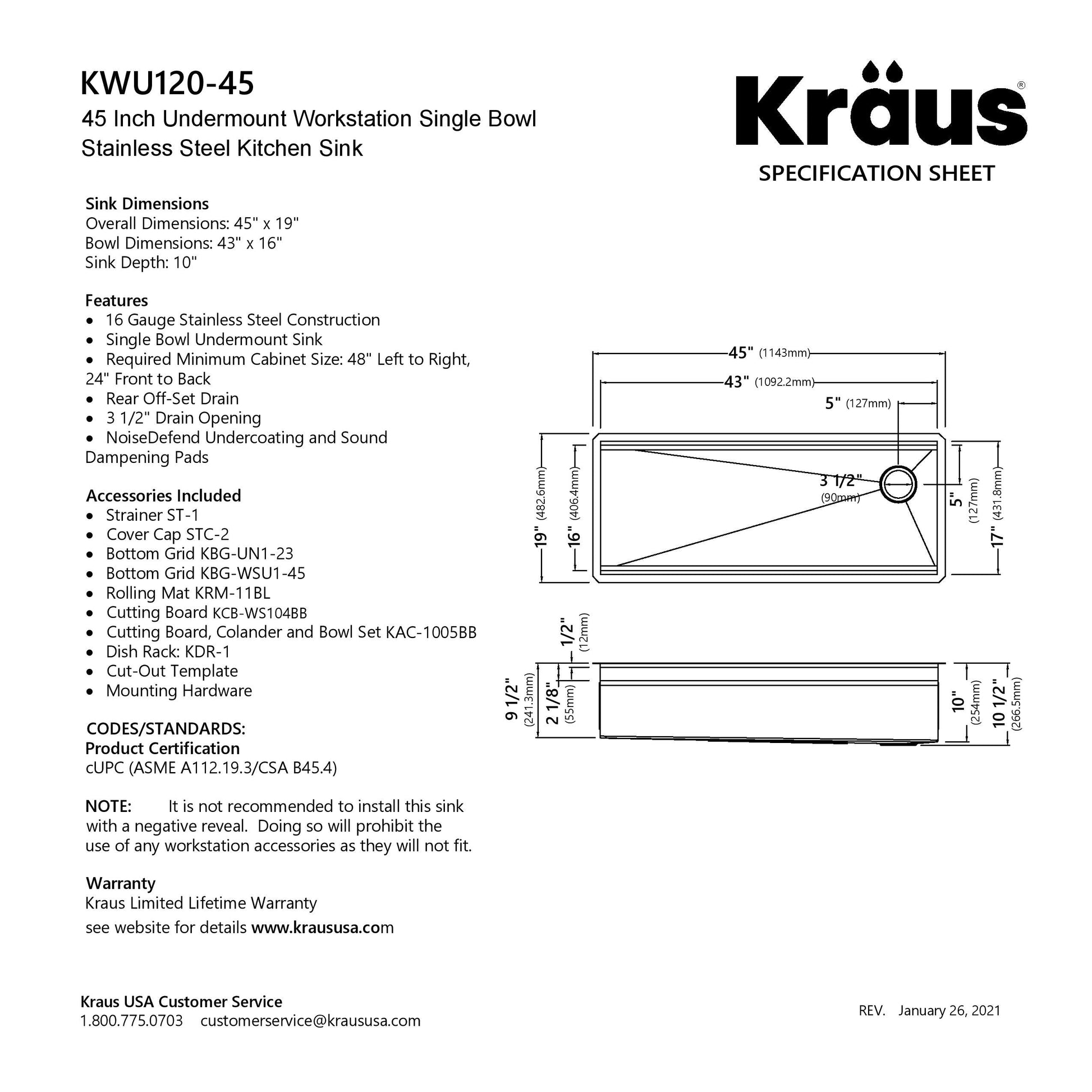 The impressive 45-inch Kore Workstation sink instantly transforms any kitchen into a full-service prep station. Equipped with a premium 10-piece chef's kit, the ultra-functional design features a 2-tier track system that allows you to slide accessories across the sink on two levels, maximizing functionality and creating a seamless workflow for everything from prepping to entertaining and cleanup. With generous dimensions, and a smart design that adds valuable counter space by allowing you to work right over the sink, the 45-inch Kore is perfect for a kitchen of any size. The chef's kit includes a serving board with bowl and colander, roll-up dish drying rack, and bamboo cutting board, allowing you to wash, chop, slice, and serve all in one place. Made with real 16-gauge stainless steel, this kitchen workhorse is one of the toughest and most durable sinks on the market. The advanced modern look and culinary-inspired design is an instant upgrade to any home kitchen. Take the functionality of your kitchen sink to a whole new level with the Kore Workstation Series, and experience the KRAUS difference.