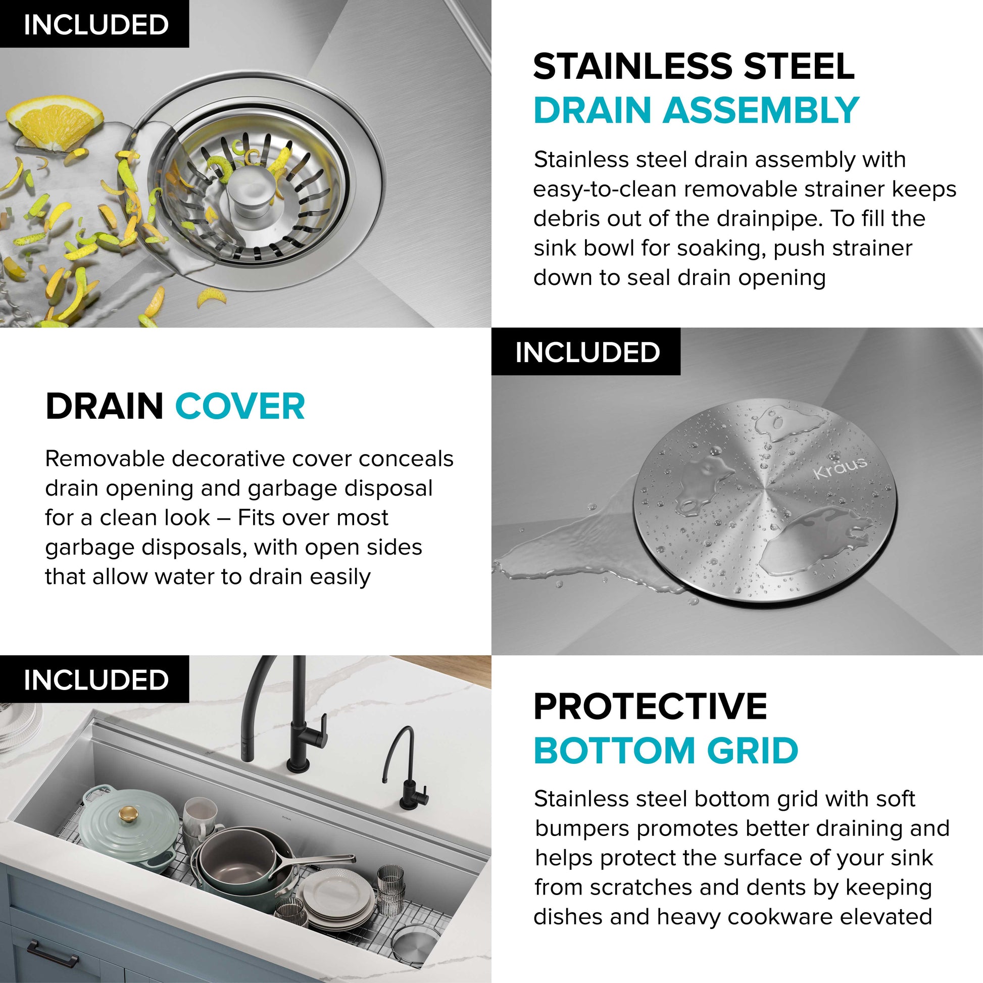 Drain Assembly with Cover: Premium stainless steel drain assembly with strainer keeps debris out of the drainpipe. CapPro decorative drain cover conceals drain opening and garbage disposal for a seamless look